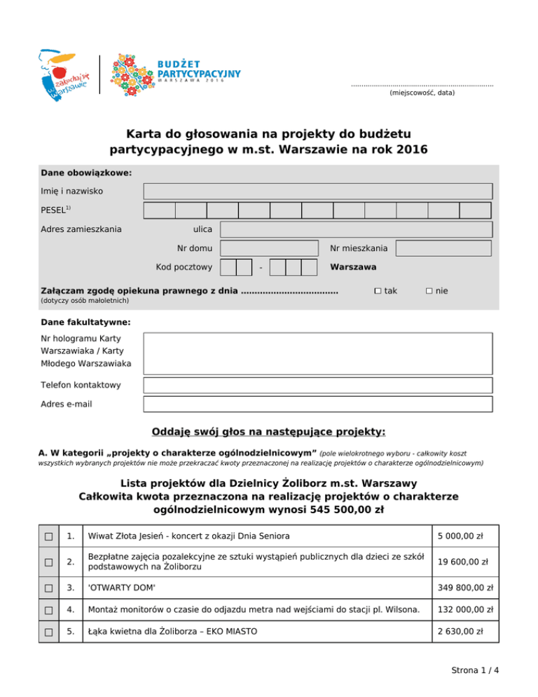..................................................................... (miejscowość, data) Karta do głosowania na projekty do budżetu partycypacyjnego w m.st. Warszawie na rok 2016 Dane obowiązkowe: Imię i nazwisko PESEL1) Adres zamieszkania ulica Nr domu Kod pocztowy Nr mieszkania - Warszawa Załączam zgodę opiekuna prawnego z dnia ……………………………… tak nie (dotyczy osób małoletnich) Dane fakultatywne: Nr hologramu Karty Warszawiaka / Karty Młodego Warszawiaka Telefon kontaktowy Adres e-mail Oddaję swój głos na następujące projekty: A. W kategorii „projekty o charakterze ogólnodzielnicowym” (pole wielokrotnego wyboru - całkowity koszt wszystkich wybranych projektów nie może przekraczać kwoty przeznaczonej na realizację projektów o charakterze ogólnodzielnicowym) Lista projektów dla Dzielnicy Żoliborz m.st. Warszawy Całkowita kwota przeznaczona na realizację projektów o charakterze ogólnodzielnicowym wynosi 545 500,00 zł □ 1. Wiwat Złota Jesień - koncert z okazji Dnia Seniora 5 000,00 zł □ 2. Bezpłatne zajęcia pozalekcyjne ze sztuki wystąpień publicznych dla dzieci ze szkół podstawowych na Żoliborzu 19 600,00 zł □ 3. 'OTWARTY DOM' 349 800,00 zł □ 4. Montaż monitorów o czasie do odjazdu metra nad wejściami do stacji pl. Wilsona. 132 000,00 zł □ 5. Łąka kwietna dla Żoliborza – EKO MIASTO 2 630,00 zł Strona 1 / 4 □ 6. STOP narkotykom w szkole na Żoliborzu 22 000,00 zł □ 7. Pocztówka z Żoliborza 4 000,00 zł □ 8. Bezpieczne i nowoczesne boisko do koszykówki - sport dla wszystkich. 405 000,00 zł □ 9. Montaż monitorów o czasie do odjazdu metra nad wejściami do stacji Marymont. 105 000,00 zł □ 10. Dostosowanie przystanków przy przychodni na Szajnochy dla niepełnosprawnych i wózków przez zabudowę nieprzepisowo krótkich zatok. 57 000,00 zł □ 11. Galeria Plenerowa 14 150,00 zł □ 12. Wymień się książką na Żoliborzu, czyli warszawska akcja bookcrossingowa 20 000,00 zł □ 13. Budowa piłkochwytu wraz z przebudową boiska do koszykówki przy Zespole Szkół im. Jana Kilińskiego 538 000,00 zł □ 14. SZKOLNE OGRODY - ogrody warzywno-roślinne w szkołach podstawowych na Żoliborzu 8 400,00 zł □ 15. Wymiana ogrodzenia terenu OSIR ŻOLIBORZ przy ul. Potockiej 1 349 000,00 zł □ 16. Połączenie rowerowe placu Wilsona z Nadwiślańskim Szlakiem Rowerowym wzdłuż ulicy Krasińskiego 335 000,00 zł □ 17. Nowe przejście dla pieszych przez ul. Śmiałą z wymianą chodnika 25 200,00 zł □ 18. Żoliborz moja mała ojczyzna - warsztaty dla uczniów 8 800,00 zł □ 19. Szkolna Akademia Przyrody 136 000,00 zł □ 20. PLACE ZABAW W PARKU im. Żołnierzy Żywiciela 302 000,00 zł □ 21. ODKRYJEMY MIŁOŚĆ NIEZNANĄ - Potańcówka łącząca pokolenia 14 000,00 zł □ 22. Kule–Bule na Żoliborzu 31 700,00 zł □ 23. Żoliborz bez nienawiści. Usuwamy mowę nienawiści z żoliborskich murów 34 200,00 zł □ 24. Zainstalowanie kranów z bieżącą wodą na 3 placach zabaw na Żoliborzu. 210 000,00 zł □ 25. Etnodźwięczni 9 900,00 zł □ 26. Oświetlenie oraz naprawa nawierzchni parkingu przy Plaży Żoliborz. 103 000,00 zł □ 27. Zakup książek i audiobooków dla Biblioteki Publicznej w Dzielnicy Żoliborz 35 000,00 zł □ 28. Klub Mam na Żoliborzu 63 700,00 zł □ 29. Plac zabaw 250 000,00 zł □ 30. System ogólnodostepnych miejskich kanap rekreacyjnych 50 000,00 zł □ 31. ZORIENTOWANY ŻOLIBORZ 77 000,00 zł Strona 2 / 4 □ 32. Figle i psoty na Placu Grunwaldzkim 169 000,00 zł □ 33. Zielona powierzchnia do parkowania przy ul. Krasińskiego 168 000,00 zł Wybrałam(/-łem) projekt(y/-ów) o charakterze ogólnodzielnicowym, (liczba słownie) których łączny koszt realizacji wynosi zł (kwota liczbowa) B. W kategorii „projekty o charakterze lokalnym” (pole wielokrotnego wyboru - całkowity koszt wszystkich wybranych projektów nie może przekraczać kwoty przeznaczone na realizację projektów o charakterze lokalnym w obszarze terytorialnym) Lista projektów dla Dzielnicy Żoliborz m.st. Warszawy dla obszaru obszar 1 Żoliborz Centralny Całkowita kwota przeznaczona na realizację projektów o charakterze lokalnym w obszarze terytorialnym wynosi 250 000,00 zł □ 1. Łąka kwietna dla Żoliborza centralnego – EKO MIASTO 2 630,00 zł □ 2. Poręcz przy schodach do Al. Wojska Polskiego 1 6 100,00 zł □ 3. PLAC ZABAW Boguckiego 3a-5 250 000,00 zł □ 4. Dwa drzewa pod oknem Plastusia 3 000,00 zł □ 5. Poręcz przy schodach do Parku Fosa ze Skweru Woyciechowskiego. 12 600,00 zł □ 6. Modernizacja zieleni osiedlowej - ogródki 58 000,00 zł □ 7. Nowe Życie Parku Żywiciela 180 000,00 zł □ 8. Poręcz przy schodach do Wisłostrady 13 100,00 zł Wybrałam(/-łem) projekt(y/-ów) o charakterze lokalnym, (liczba słownie) których łączny koszt realizacji wynosi zł (kwota liczbowa) Na podstawie art. 7 pkt 5 ustawy z dnia 29 sierpnia 1997 r. o ochronie danych osobowych (Dz. U. z 2014 r. poz. 1182), wyrażam zgodę na przetwarzanie moich danych osobowych przez Prezydenta m.st. Warszawy w celu realizacji budżetu partycypacyjnego w m.st. Warszawie na rok 20162). Oświadczam, iż wszystkie informacje podane w formularzu, w tym o zamieszkiwaniu na terenie m.st. Warszawy, są zgodne z aktualnym stanem faktycznym. Oświadczam także, iż zapoznałem się z treścią zarządzenia nr 6699/2014 Prezydenta Miasta Stołecznego Warszawy z dnia 16 października 2014 r. w sprawie konsultacji społecznych z mieszkańcami Miasta Stołecznego Warszawy w zakresie budżetu partycypacyjnego na rok 2016. Jestem świadomy(-ma) możliwości weryfikacji zamieszczonych przeze mnie danych na podstawie dostępnych m.st. Warszawie rejestrów, ewidencji lub innych danych. Jestem również świadomy(-ma) odpowiedzialności wynikającej z Strona 3 / 4 podawania nieprawdziwych informacji i składania nieprawdziwych oświadczeń. ............................................