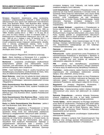 zmniejsza dostępny Limit Całkowity, zaś każda spłata zwiększa dostępny Limit Całkowity; REGULAMIN WYDAWANIA I UŻYTKOWANIA KART GWARANTOWANYCH VISA BUSINESS Limit Indywidualny - uzgodniona z Posiadaczem w formie pisemnej lub innej formie określonej w Umowie kwota, do wysokości której mogą być dokonywane, przy użyciu danej Karty, Operacje (z uwzględnieniem naliczonych opłat i prowizji). Limit Indywidualny nie jest odnawiany automatycznie na koniec Okresu Rozliczeniowego. Każda dokonana Operacja zmniejsza dostępny Limit Indywidualny, zaś każda spłata zwiększa dostępny Limit Indywidualny; I. Postanowienia ogólne §1 Niniejszy Regulamin świadczenia usług wydawania, używania i przeprowadzania rozliczeń z tytułu transakcji dokonywanych przy użyciu kart płatniczych Visa Business Gold, Visa Business Silver, Visa Business Blue, wydany przez Bank Handlowy w Warszawie S.A. na mocy art. 109 ust. 1 pkt 4) Ustawy z dnia 29 sierpnia 1997r. Prawo bankowe (tekst jedn. Dz.U. z 2002 r. Nr 72 poz. 665, ze zm.) w związku z art. 384 §1 Ustawy z dnia 23 kwietnia 1964r. Kodeks cywilny (Dz.U. z 1964 r. nr 16, poz. 93 ze zm.) oraz na mocy Ustawy z dnia 12 września 2002 r. o Elektronicznych Instrumentach Płatniczych (Dz.U. Nr 169, poz. 1385 ze zm.), Ustawy z dnia 19 sierpnia 2011 r. o Usługach płatniczych (Dz. U. nr 199 poz. 1175 ze zm.) i innych przepisów prawa mających zastosowanie, określa, wraz z Umową, podstawowe zasady, formy i tryb świadczenia przez Bank Handlowy w Warszawie S.A., usług określonych tymi dokumentami oraz prawa i obowiązki stron Umowy. Limit Wypłat Gotówki - uzgodniona z Posiadaczem w formie pisemnej lub w innej formie określonej w Umowie kwota, do wysokości której, w przyjętym Okresie Rozliczeniowym, mogą być dokonywane, przy użyciu danej Karty, wypłaty gotówki (z uwzględnieniem naliczonych opłat i prowizji), która to kwota wchodzi w zakres i jest nie większa niż kwota Limitu Indywidualnego; Okres Rozliczeniowy - okres rozpoczynający się 15 dnia każdego miesiąca kalendarzowego i kończący się w 14 dniu bezpośrednio następującego po nim kolejnego miesiąca kalendarzowego; Operacja – dokonana przy użyciu Karty zapłata lub wypłata gotówki; §2 Pełnomocnik - osoba upoważniona przez Posiadacza do reprezentowania Posiadacza w stosunkach z Bankiem w zakresie wynikającym z Umowy oraz Regulaminu, której imię i nazwisko oraz wzór podpisu są wskazana w odpowiednim załączniku do Umowy; Użyte w niniejszym Regulaminie określenia oznaczają: Bank - Bank Handlowy w Warszawie S.A. z siedzibą w Warszawie przy ulicy Senatorskiej 16, wydawca Kart; Bankomat - urządzenie umożliwiające Użytkownikowi podejmowanie gotówki oraz dokonywanie innych czynności, pod warunkiem, że są one udostępnione przez podmiot obsługujący dane urządzenie; PIN poufny kod identyfikacyjny przydzielony Użytkownikowi do Karty, który łącznie z danymi zawartymi na Karcie służy do elektronicznej identyfikacji Posiadacza; CVV2 – Card Verification Value 2 - poufny trzycyfrowy kod identyfikacyjny przydzielony Użytkownikowi do Karty, który służy do elektronicznej identyfikacji Posiadacza; Posiadacz – osoba prawna, osoba fizyczna lub jednostka organizacyjna nie posiadająca osobowości prawnej będąca, wraz z Bankiem, stroną Umowy; Dzień Roboczy - dzień inny niż sobota lub dzień ustawowo wolny od pracy, w którym Bank prowadzi działalność operacyjną umożliwiająca wykonanie postanowień Umowy i Regulaminu; Rachunek – prowadzony przez Bank na rzecz Posiadacza rachunek bankowy, na którym rozliczane są Operacje oraz naliczane opłaty i prowizje, wskazany we wniosku o ustawienie Posiadacza, stanowiącym załącznik do Umowy; Karta Gwarantowana Visa Business Gold – każda karta płatnicza typu Visa Business Gold, wydana Posiadaczowi przez Bank; Regulamin – niniejszy Regulamin Wydawania Użytkowania Kart Gwarantowanych Visa Business; i System Visa - międzynarodowy system obsługi transakcji dokonywanych przy użyciu kart płatniczych ze znakiem Visa; Karta Gwarantowana Visa Business Silver – każda karta płatnicza typu Visa Business Silver, wydana Posiadaczowi przez Bank; Sytuacja Gospodarcza - oznacza sytuację finansową, prawną, majątkową lub inną, w tym także możliwość rozwoju działalności gospodarczej danego podmiotu; Karta Gwarantowana Visa Business Blue – każda karta płatnicza typu Visa Business Blue, wydana Posiadaczowi przez Bank; Termin Spłaty – termin wskazany na Wyciągu wysyłanym przez Bank do Użytkownika i Posiadacza jako dzień spłaty należności lub inny ustalony przez Bank i Posiadacza, w przypadku, gdy nie jest to Dzień Roboczy, jako Termin Spłaty uznaje się pierwszy Dzień Roboczy następujący bezpośrednio po tym terminie; Karta lub Karta Gwarantowana Visa Business - jedna z kart Visa Business: Gold, Silver, Blue; Limit Operacji – uzgodniona z Posiadaczem w formie pisemnej lub innej formie określonej w Umowie kwota, do wysokości której może być dokonywana pojedyncza Operacja (z uwzględnieniem naliczonych opłat i prowizji); Terminal POS - urządzenie umożliwiające Użytkownikowi dokonywanie Operacji; Limit Całkowity – uzgodniona z Posiadaczem w formie pisemnej lub innej formie określonej w Umowie kwota, do wysokości której mogą być dokonywane, przy użyciu wszystkich Kart wydanych Posiadaczowi, Operacje (z uwzględnieniem naliczonych opłat i prowizji). Limit Całkowity nie jest odnawiany automatycznie na koniec Okresu Rozliczeniowego. Każda dokonana Operacja Umowa - Umowa o wydanie Kart Gwarantowanych Visa Business oraz obsługę operacji dokonywanych przy ich użyciu, zawarta pomiędzy Bankiem a Posiadaczem; 1 042013 Użytkownik – wskazana przez Posiadacza we Wniosku i zaakceptowana przez Bank osoba fizyczna, upoważniona przez Posiadacza do dokonywania w jego imieniu i na jego rzecz Operacji, której dane identyfikacyjne mogą być umieszczone na Karci