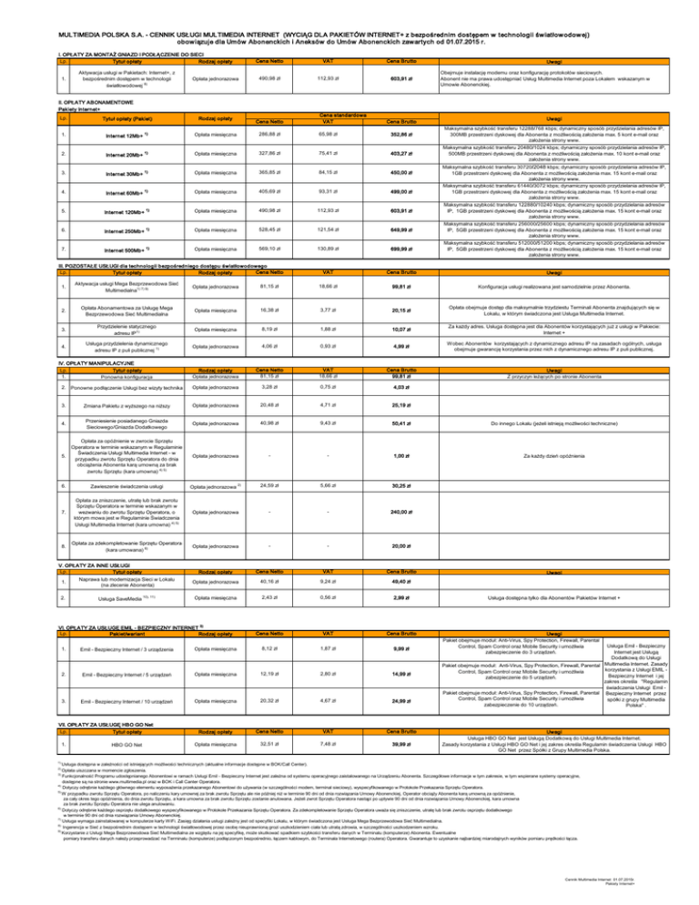MULTIMEDIA POLSKA S.A. - CENNIK USŁUGI MULTIMEDIA INTERNET (WYCIĄG DLA PAKIETÓW INTERNET+ z bezpośrednim dostępem w technologii św iatłow odow ej) obow iązuje dla Umów Abonenckich i Aneksów do Umów Abonenckich zaw artych od 01.07.2015 r. I. OPŁATY ZA MONTAŻ GNIAZD I PODŁĄCZENIE DO SIECI Lp. Tytuł opłaty Rodzaj opłaty 1. Aktywacja usługi w Pakietach: Internet+, z bezpośrednim dostępem w technologii światłowodowej 8) Opłata jednorazowa Cena Netto 490,98 zł VAT 112,93 zł Cena Brutto 603,91 zł Uwagi Obejmuje instalację modemu oraz konfigurację protokołów sieciowych. Abonent nie ma prawa udostępniać Usług Multimedia Internet poza Lokalem wskazanym w Umowie Abonenckiej. II. OPŁATY ABONAMENTOWE Pakiety Internet+ Lp. Tytuł opłaty (Pakiet) Rodzaj opłaty Cena Netto Cena standardowa VAT Cena Brutto Uwagi Maksymalna szybkość transferu 12288/768 kbps; dynamiczny sposób przydzielania adresów IP, 300MB przestrzeni dyskowej dla Abonenta z możliwością założenia max. 5 kont e-mail oraz założenia strony www. Maksymalna szybkość transferu 20480/1024 kbps; dynamiczny sposób przydzielania adresów IP, 500MB przestrzeni dyskowej dla Abonenta z możliwością założenia max. 10 kont e-mail oraz założenia strony www. Internet 12Mb+ 1) Opłata miesięczna 286,88 zł 65,98 zł 352,86 zł 2. Internet 20Mb+ 1) Opłata miesięczna 327,86 zł 75,41 zł 403,27 zł 3. Internet 30Mb+ 1) Opłata miesięczna 365,85 zł 84,15 zł 450,00 zł 4. Internet 60Mb+ 1) Opłata miesięczna 405,69 zł 93,31 zł 499,00 zł 5. Internet 120Mb+ 1) Opłata miesięczna 490,98 zł 112,93 zł 603,91 zł 6. Internet 250Mb+ 1) Opłata miesięczna 528,45 zł 121,54 zł 649,99 zł 7. Internet 500Mb+ 1) Opłata miesięczna 569,10 zł 130,89 zł 699,99 zł VAT Cena Brutto Uwagi 1. III. POZOSTAŁE USŁUGI dla technologii bezpośredniego dostępu światłowodowego Cena Netto Tytuł opłaty Rodzaj opłaty Lp. Maksymalna szybkość transferu 30720/2048 kbps; dynamiczny sposób przydzielania adresów IP, 1GB przestrzeni dyskowej dla Abonenta z możliwością założenia max. 15 kont e-mail oraz założenia strony www. Maksymalna szybkość transferu 61440/3072 kbps; dynamiczny sposób przydzielania adresów IP, 1GB przestrzeni dyskowej dla Abonenta z możliwością założenia max. 15 kont e-mail oraz założenia strony www. Maksymalna szybkość transferu 122880/10240 kbps; dynamiczny sposób przydzielania adresów IP, 1GB przestrzeni dyskowej dla Abonenta z możliwością założenia max. 15 kont e-mail oraz założenia strony www. Maksymalna szybkość transferu 256000/25600 kbps; dynamiczny sposób przydzielania adresów IP, 5GB przestrzeni dyskowej dla Abonenta z możliwością założenia max. 15 kont e-mail oraz założenia strony www. Maksymalna szybkość transferu 512000/51200 kbps; dynamiczny sposób przydzielania adresów IP, 5GB przestrzeni dyskowej dla Abonenta z możliwością założenia max. 15 kont e-mail oraz założenia strony www. 1. Aktywacja usługi Mega Bezprzewodowa Sieć Multimedialna1) 7) 9) Opłata jednorazowa 81,15 zł 18,66 zł 99,81 zł Konfiguracja usługi realizowana jest samodzielnie przez Abonenta. 2. Opłata Abonamentowa za Usługę Mega Bezprzewodowa Sieć Multimedialna Opłata miesięczna 16,38 zł 3,77 zł 20,15 zł Opłata obejmuje dostęp dla maksymalnie trzydziestu Terminali Abonenta znajdujących się w Lokalu, w którym świadczona jest Usługa Multimedia Internet. 3. Przydzielenie statycznego adresu IP1) Opłata miesięczna 8,19 zł 1,88 zł 10,07 zł Za każdy adres. Usługa dostępna jest dla Abonentów korzystających już z usługi w Pakiecie: Internet + 4. Usługa przydzielenia dynamicznego adresu IP z puli publicznej 1) Opłata jednorazowa 4,06 zł 0,93 zł 4,99 zł Wobec Abonentów korzystających z dynamicznego adresu IP na zasadach ogólnych, usługa obejmuje gwarancję korzystania przez nich z dynamicznego adresu IP z puli publicznej. Rodzaj opłaty Opłata jednorazowa Cena Netto 81,15 zł VAT 18,66 zł Cena Brutto 99,81 zł Uwagi Z przyczyn leżących po stronie Abonenta Opłata jednorazowa 3,28 zł 0,75 zł 4,03 zł IV. OPŁATY MANIPULACYJNE Tytuł opłaty Lp. 1. Ponowna konfiguracja 2. Ponowne podłączenie Usługi bez wizyty technika 3. Zmiana Pakietu z wyższego na niższy Opłata jednorazowa 20,48 zł 4,71 zł 25,19 zł 4. Przeniesienie posiadanego Gniazda Sieciowego/Gniazda Dodatkowego Opłata jednorazowa 40,98 zł 9,43 zł 50,41 zł Do innego Lokalu (jeżeli istnieją możliwości techniczne) 5. Opłata za opóźnienie w zwrocie Sprzętu Operatora w terminie wskazanym w Regulaminie Świadczenia Usługi Multimedia Internet - w przypadku zwrotu Sprzętu Operatora do dnia obciążenia Abonenta karą umowną za brak zwrotu Sprzętu (kara umowna) 4) 5) Opłata jednorazowa - - 1,00 zł Za każdy dzień opóźnienia 6. Zawieszenie świadczenia usługi Opłata jednorazowa 2) 24,59 zł 5,66 zł 30,25 zł 7. Opłata za zniszczenie, utratę lub brak zwrotu Sprzętu Operatora w terminie wskazanym w wezwaniu do zwrotu Sprzętu Operatora, o którym mowa jest w Regulaminie Świadczenia Usługi Multimedia Internet (kara umowna) 4) 5) Opłata jednorazowa - - 240,00 zł 8. Opłata za zdekompletowanie Sprzętu Operatora (kara umowana) 6) Opłata jednorazowa - - 20,00 zł V. OPŁATY ZA INNE USŁUGI Lp. Tytuł opłaty Rodzaj opłaty Cena Netto VAT Cena Brutto 1. Naprawa lub modernizacja Sieci w Lokalu (na zlecenie Abonenta) Opłata jednorazowa 40,16 zł 9,24 zł 49,40 zł 2. Usługa SaveMedia 10), 11) Opłata miesięczna 2,43 zł 0,56 zł 2,99 zł Cena Netto VAT Cena Brutto VI. OPŁATY ZA USŁUGĘ EMIL - BEZPIECZNY INTERNET 3) Lp. Pakiet/wariant Rodzaj opłaty 1. Emil - Bezpieczny Internet / 3 urządzenia Opłata miesięczna 8,12 zł 1,87 zł 9,99 zł 2. Emil - Bezpieczny Internet / 5 urządzeń Opłata miesięczna 12,19 zł 2,80 zł 14,99 zł 3. Emil - Bezpieczny Internet / 10 urządzeń Opłata miesięczna 20,32 zł 4,67 zł 24,99 zł Rodzaj opłaty Cena 