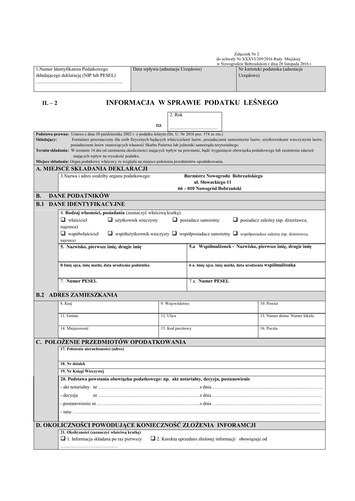 Załącznik Nr 2 do uchwały Nr XXXVI/209/2016 Rady Miejskiej w Nowogrodzie Bobrzańskim z dnia 28 listopada 2016 r. 1.Numer Identyfikatora Podatkowego składającego deklarację (NIP lub PESEL) ......................................................................... Data wpływu (adnotacje Urzędowe) Nr kartoteki podatnika (adnotacje Urzędowe) INFORMACJA W SPRAWIE PODATKU LEŚNEGO IL – 2 2. Rok na ........................................ Podstawa prawna: Ustawa z dnia 30 października 2002 r. o podatku leśnym (Dz. U. Nr 2016 poz. 374 ze zm.) Składający: Formularz przeznaczony dla osób fizycznych będących właścicielami lasów, posiadaczami samoistnymi lasów, użytkownikami wieczystymi lasów, posiadaczami lasów stanowiących własność Skarbu Państwa lub jednostki samorządu terytorialnego. Termin składania: W terminie 14 dni od zaistnienia okoliczności mających wpływ na powstanie, bądź wygaśnięcie obowiązku podatkowego lub zaistnienia zdarzeń mających wpływ na wysokość podatku. Miejsce składania: Organ podatkowy właściwy ze względu na miejsce położenia przedmiotów opodatkowania. A. MIEJSCE SKŁADANIA DEKLARACJI Burmistrz Nowogrodu Bobrzańskiego ul. Słowackiego 11 66 – 010 Nowogród Bobrzański 3.Nazwa i adres siedziby organu podatkowego: B. DANE PODATNIKÓW B.1 DANE IDENTYFIKACYJNE 4. Rodzaj własności, posiadania (zaznaczyć właściwą kratkę) właściciel użytkownik wieczysty posiadacz samoistny posiadacz zależny (np. dzierżawca, najemca) współwłaściciel współużytkownik wieczysty współposiadacz samoistny współposiadasz zależny (np. dzierżawca, najemca) 5. Nazwisko, pierwsze imię, drugie imię 5.a Współmałżonek - Nazwisko, pierwsze imię, drugie imię 6 Imię ojca, imię matki, data urodzenia podatnika 6 a. Imię ojca, imię matki, data urodzenia współmałżonka 7. Numer PESEL 7 a. Numer PESEL B.2 ADRES ZAMIESZKANIA 8. Kraj 9. Województwo 10. Powiat 11. Gmina 12. Ulica 13. Numer domu/ Numer lokalu 14. Miejscowość 15. Kod pocztowy 16. Poczta C. POŁOŻENIE PRZEDMIOTÓW OPODATKOWANIA 17. Położenie nieruchomości (adres) 18. Nr działek 19. Nr Księgi Wieczystej 20. Podstawa powstania obowiązku podatkowego: np. akt notarialny, decyzja, postanowienie - akt notarialny nr ……………………………………………………… z dnia…………………………………………………………….. - decyzja nr ……………………………………………………….z dnia …………………………………………………………… - postanowienie nr ………………………………………………………..z dnia …………………………………………………………… - inne ………………………………………………………………………………………………………………………………………… D. OKOLICZNOŚCI POWODUJĄCE KONIECZNOŚĆ ZŁOŻENIA INFORAMCJI 21. Okoliczności (zaznaczyć właściwą kratkę) 1. Informacja składana po raz pierwszy ……………………………… 2. Korekta uprzednio złożonej informacji obowiązuje od E. DANE DOTYCZĄCE PRZEDMIOTÓW OPODATKOWANIA (Z WYJĄTKIEM ZWOLNIONYCH) Wyszczególnienie Powierzchnia w hektarach fizycznych 2. Lasy pozostałe wchodzące w skład rezerwatów przyrody i parków narodowych Lasy pozostałe 3. Razem 1. F. INFORMACJA O PRZEDMIOTACH ZWOLNIONYCH (podać powierzchnię zwolnionego lasu oraz przepis prawa - z jakiego tytułu występuje zwolnienie) G. PODPIS PODATNIKA / OSOBY REPREZENTUJĄCEJ PODATNIKA 22. Nazwisko 23. Imię 24. Data wypełnienia (dzień - miesiąc - rok) 25. Podpis (pieczęć) składającego / osoby reprezentującej składającego 26. Numer telefonu kontaktowego (pole nieobowiązkowe) H. ADNOTACJE ORGANU PODATKOWEGO 27. Uwagi organu podatkowego 28. Identyfikator przyjmującego formularz 29. Data i podpis przyjmującego formularz
