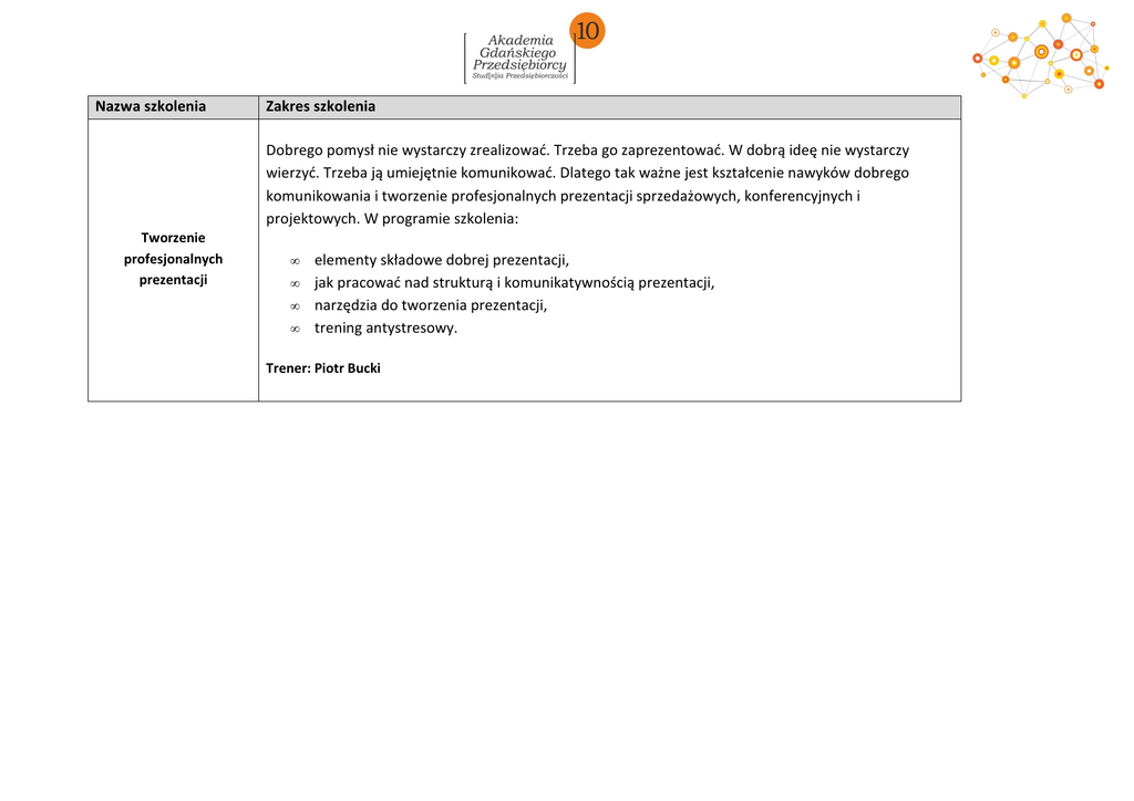 Nazwa szkolenia Zakres szkolenia Dobrego pomysł nie wystarczy zrealizować. Trzeba go zaprezentować. W dobrą ideę nie wystarczy wierzyć. Trzeba ją umiejętnie komunikować. Dlatego tak ważne jest kształcenie nawyków dobrego komunikowania i tworzenie profesjonalnych prezentacji sprzedażowych, konferencyjnych i projektowych. W programie szkolenia: Tworzenie profesjonalnych prezentacji • • • • elementy składowe dobrej prezentacji, jak pracować nad strukturą i komunikatywnością prezentacji, narzędzia do tworzenia prezentacji, trening antystresowy. Trener: Piotr Bucki