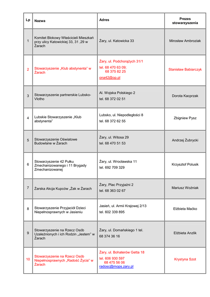 Lp Nazwa Adres Prezes stowarzyszenia 1 Komitet Blokowy