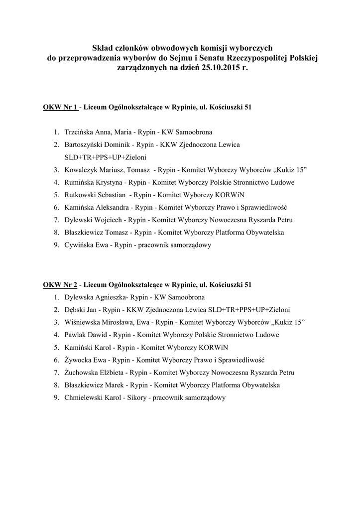 Skład członków obwodowych komisji wyborczych do przeprowadzenia wyborów do Sejmu i Senatu Rzeczypospolitej Polskiej zarządzonych na dzień 25.10.2015 r. OKW Nr 1 - Liceum Ogólnokształcące w Rypinie, ul. Kościuszki 51 1. Trzcińska Anna, Maria - Rypin - KW Samoobrona 2. Bartoszyński Dominik - Rypin - KKW Zjednoczona Lewica SLD+TR+PPS+UP+Zieloni 3. Kowalczyk Mariusz, Tomasz - Rypin - Komitet Wyborczy Wyborców „Kukiz 15” 4. Rumińska Krystyna - Rypin - Komitet Wyborczy Polskie Stronnictwo Ludowe 5. Rutkowski Sebastian - Rypin - Komitet Wyborczy KORWiN 6. Kamińska Aleksandra - Rypin - Komitet Wyborczy Prawo i Sprawiedliwość 7. Dylewski Wojciech - Rypin - Komitet Wyborczy Nowoczesna Ryszarda Petru 8. Błaszkiewicz Tomasz - Rypin - Komitet Wyborczy Platforma Obywatelska 9. Cywińska Ewa - Rypin - pracownik samorządowy OKW Nr 2 - Liceum Ogólnokształcące w Rypinie, ul. Kościuszki 51 1. Dylewska Agnieszka- Rypin - KW Samoobrona 2. Dębski Jan - Rypin - KKW Zjednoczona Lewica SLD+TR+PPS+UP+Zieloni 3. Wiśniewska Mirosława, Ewa - Rypin - Komitet Wyborczy Wyborców „Kukiz 15” 4. Pawlak Dawid - Rypin - Komitet Wyborczy Polskie Stronnictwo Ludowe 5. Kamiński Karol - Rypin - Komitet Wyborczy KORWiN 6. Żywocka Ewa - Rypin - Komitet Wyborczy Prawo i Sprawiedliwość 7. Żuchowska Elżbieta - Rypin - Komitet Wyborczy Nowoczesna Ryszarda Petru 8. Błaszkiewicz Marek - Rypin - Komitet Wyborczy Platforma Obywatelska 9. Chmielewski Karol - Sikory - pracownik samorządowy OKW Nr 3 - Rypiński Dom Kultury w Rypinie, ul. Warszawska 8 1. Okraszewska Bożena - Rypin - KW Samoobrona 2. Buchalska Barbara - Rypin - KKW Zjednoczona Lewica SLD+TR+PPS+UP+Zieloni 3. Cześnik Dominika - Rypin - Komitet Wyborczy Wyborców „Kukiz 15” 4. Tuchalska Jolanta -Rypin - Komitet wyborczy Polskie Stronnictwo Ludowe 5. Westfal Teresa - Rypin - Komitet Wyborczy KORWiN 6. Skowrońska Bogumiła - Komitet Wyborczy Prawo i Sprawiedliwość 7. Lipka-Szalkowska Monika - Rypin - Komitet Wyborczy Nowoczesna Ryszarda Petru 8. Witkowski Gabriel - Rypin - Komitet Wyborczy Platforma Obywatelska 9. Szwankowska Agnieszka - Rypin - pracownik samorządowy OKW Nr 4 - Muzeum Ziemi Dobrzyńskiej w Rypinie, ul. Warszawska 20 1. Trojakowska Marlena - Rypin - KW Samoobrona 2. Mazurkiewicz Anna - Rypin - KKW Zjednoczona Lewica SLD+TR+PPS+UP+Zieloni 3. Gurtatowska Zyta - Rypin - Komitet Wyborczy Wyborców „Kukiz 15” 4. Chuderewicz Kamila - Rypin - Komitet Wyborczy Polskie Stronnictwo Ludowe 5. Pawłowski Piotr - Rypin - Komitet Wyborczy KORWiN 6. Sobierajska Agnieszka - Rypin - Komitet Wyborczy Prawo i Sprawiedliwość 7. Smolińska Aleksandra - Rypin - Komitet Wyborczy Nowoczesna Ryszarda Petru 8. Boruszkowska Agnieszka, Ewa - Rypin - Komitet Wyborczy Platforma Obywatelska 9. Krajewski Błażej - Piskorczyn - pracownik samorządowy OKW Nr 5 - Starostwo Powiatowe w Rypinie, ul. Warszawska 38 1. Alichnewicz Piotr - Rypin - KW Samoobrona 2. Ostrowska Maria, Grażyna - Rypin - KKW Zjednoczona Lewica SLD+TR+PPS+UP+Zieloni 3. Marcinkowska Agnieszka - Rypin - Komitet Wyborczy Wyborców „Kukiz 15” 4. Drozdowska Jadwiga - Rypin - Komitet Wyborczy Polskie Stronnictwo Ludowe 5. Pawłowska Iwona - Rypin - Komitet Wyborczy KORWiN 6. Derkowski Piotr - Rypin - Komitet Wyborczy Prawo i Sprawiedliwość 7. Smolińska Anna - Rypin - Komitet Wyborczy Nowoczesna Ryszarda Petru 8. Gałkowski Maciej - Rypin - Komitet Wyborczy Platforma Obywatelska 9. Grabowska Ilona, Jolanta - Rypin - pracownik samorządowy OKW Nr 6 - Urząd Miasta Rypin, ul. Warszawska 40 1. Czajkowska Anna - Rypin - KW Samoobrona 2. Grubalska Agnieszka - Rypin - KKW Zjednoczona Lewica SLD+TR+PPS+UP+Zieloni 3. Bernat Anna - Rypin - Komitet Wyborczy Wyborców „Kukiz 15” 4. Barański Stanisław - Rypin - Komitet Wyborczy Polskie Stronnictwo Ludowe 5. Stalmirska Urszula - Rypin - Komitet Wyborczy KORWiN 6. Mroczyński Kazimierz - Rypin - Komitet Wyborczy Prawo i Sprawiedliwość 7. Czajkowski Henryk, Józef - Rypin - Komitet Wyborczy Nowoczesna Ryszarda Petru 8. Kożuch Robert, Jarosław - Rypin - Komitet Wyborczy Platforma Obywatelska 9. Małyska Małgorzata - Rypin - pracownik samorządowy OKW Nr 7 - Szkoła Podstawowa Nr 3 w Rypinie, ul. Młyńska 12 1. Liszewska Zofia - Rypin - KW Samoobrona 2. Górecki Włodzimierz - Rypin - KKW Zjednoczona Lewica SLD+TR+PPS+UP+Zieloni 3. Kaliszewski Dariusz - Rypin - Komitet Wyborczy Wyborców „Kukiz 15” 4. Wiśniewski Dariusz - Rypin - Komitet Wyborczy Polskie Stronnictwo Ludowe 5. Rębacz Karolina, Marta - Rypin - Komitet Wyborczy KORWiN 6. Pacer Aneta - Rypin - Komitet Wyborczy Prawo i Sprawiedliwość 7. Węglarz Kamila - Rypin - Komitet Wyborczy Nowoczesna Ryszarda Petru 8. Skiba Małgorzata - Rypin - Komitet Wyborczy Platforma Obywatelska 9. Turalski Marcin - Rypin - pracownik samorządowy OKW Nr 8 - Szkoła Podstawowa Nr 3 w Rypinie, ul. Młyńska 12 1. Krajewska Anna, Halina - Rypin - KW Samoobrona 2. Wyskiel Adriana - Rypin - KKW Zjednoczona Lewica SLD+TR+PPS+UP+Zieloni 3. Mazanowska Hanna, Iwona - Rypin - Komitet Wyborczy Wyborców „Kukiz 15” 4. Czajkowski Jacek - Rypin - Komitet Wyborczy Polskie Stronnictwo Ludowe 5. Kamińska Jadwiga - Rypin - Komitet Wyborczy KORWiN 6. Łukowska Marzena, Ewelina - Rypin - Komitet Wyborczy Prawo i Sprawiedliwość 7. Ziółkowska Aleksandra - Rypin - Komitet Wyborczy Nowoczesna Ryszarda Petru 8. Wesołowski Andrzej - Rypin - Komitet Wyborczy Platforma Obywatelska 9. Tyburska Dorota - Rypin - pracownik samorządowy OKW Nr 9 - Szkoła Podstawowa Nr 1 w Rypinie, ul. 3 Maja 3. 1. Kędziorski Jerzy, Jan - Rypin - KW Samoobrona 2. Naruszko Norbert, Grzegorz - Rypin - KKW Zjednoczona Lewica SLD+TR+PPS+UP+Zieloni 3. Kadzińska Irena - Rypin - Komitet Wyborczy Wyborców „Kukiz 15” 4. Królikowska Łucja, Renata - Rypin - Komitet Wyborczy Polskie Stronnictwo Ludowe 5. Kuberska Natalia - Rypin - Komitet Wyborczy KORWiN 6. Wiśniewska Marianna - Rypin - Komitet Wyborczy Prawo i Sprawi