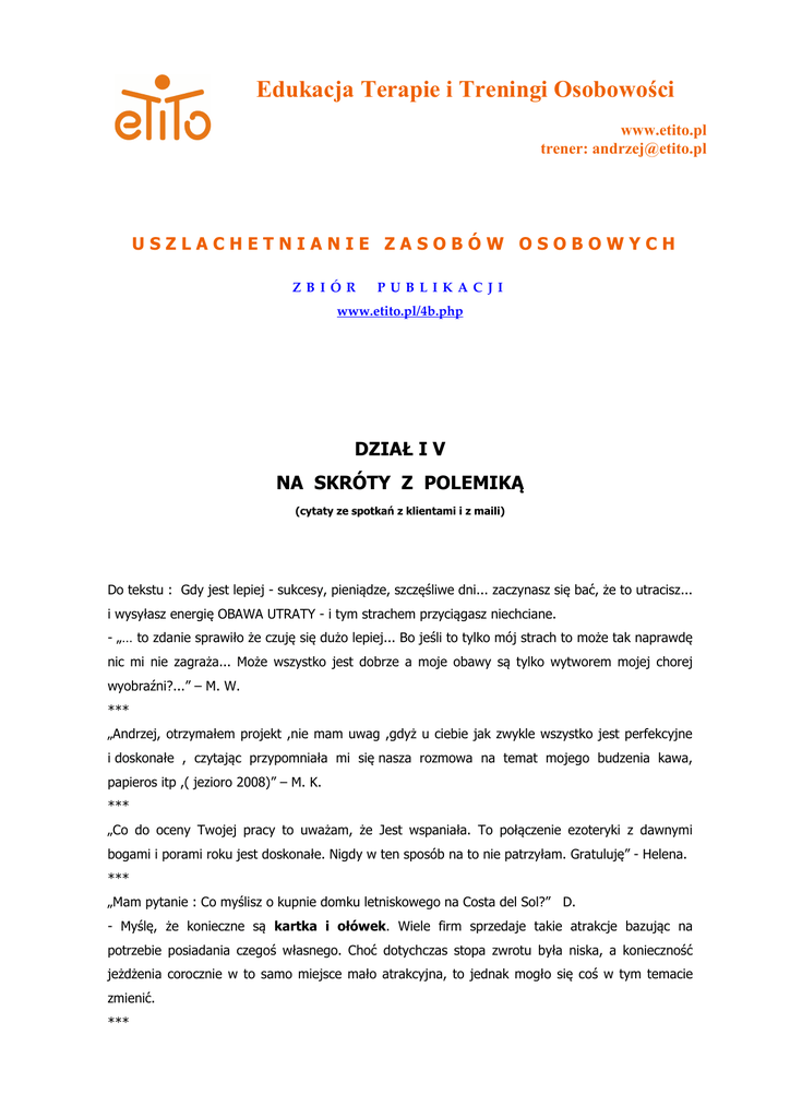 Edukacja Terapie i Treningi Osobowości www.etito.pl trener: [email protected] USZLACHETNIANIE ZASOBÓW OSOBOWYCH ZBIÓR PUBLIKACJI www.etito.pl/4b.php DZIAŁ I V NA SKRÓTY Z POLEMIKĄ (cytaty ze spotkań z klientami i z maili) Do tekstu : Gdy jest lepiej - sukcesy, pieniądze, szczęśliwe dni... zaczynasz się bać, że to utracisz... i wysyłasz energię OBAWA UTRATY - i tym strachem przyciągasz niechciane. - „… to zdanie sprawiło że czuję się dużo lepiej... Bo jeśli to tylko mój strach to może tak naprawdę nic mi nie zagraża... Może wszystko jest dobrze a moje obawy są tylko wytworem mojej chorej wyobraźni?...” – M. W. *** „Andrzej, otrzymałem projekt ,nie mam uwag ,gdyż u ciebie jak zwykle wszystko jest perfekcyjne i doskonałe , czytając przypomniała mi się nasza rozmowa na temat mojego budzenia kawa, papieros itp ,( jezioro 2008)” – M. K. *** „Co do oceny Twojej pracy to uważam, że Jest wspaniała. To połączenie ezoteryki z dawnymi bogami i porami roku jest doskonałe. Nigdy w ten sposób na to nie patrzyłam. Gratuluję” - Helena. *** „Mam pytanie : Co myślisz o kupnie domku letniskowego na Costa del Sol?” D. - Myślę, że konieczne są kartka i ołówek. Wiele firm sprzedaje takie atrakcje bazując na potrzebie posiadania czegoś własnego. Choć dotychczas stopa zwrotu była niska, a konieczność jeżdżenia corocznie w to samo miejsce mało atrakcyjna, to jednak mogło się coś w tym temacie zmienić. *** „Przy natrętnych myślach piszesz, że można je przepędzić tabliczką ,mnożenia” D. - To tak jakbyś miała zniechęcić natrętną sąsiadkę, która Cie nawiedza. Samo wytłumaczenie, że nie jest mile widziana, nie wystarcza. Trzeba tak wypełnić przestrzeń, by nie było dla niej miejsca. Będzie próbować jeszcze wiele razy, jednak bądź konsekwentna. W końcu się zniechęci. *** „Użyłam PSYCHOLOGII SUKCESU jako bazy pod szybką pracę warsztatową (40 min). Grupa była trudna ( wiek ok.50 lat, bezrobotni, podopieczni MOPS) zagrożona wykluczeniem społecznym. Narysowaliśmy tabelkę z podziałem na pory roku ( wszerz) i podział: 1.co w naturze, 2.co w emocjach, 3.co w działaniu ( w dół kolumny). Wypowiedzi były zaskakujące. Potem głosowaliśmy na porę roku, wygrała wiosna znaczną przewagą! Skąd w nich nagle tyle optymizmu? Gdy określiliśmy co nas motywuje: „pierwsze to pieniądze”, ( nie milion ale tysiąc zł), a zaraz potem..."jak komuś w czymś pomóc np. wrzucić węgiel sąsiadowi do piwnicy" . Jestem zaskoczona jak bardzo inspirującą i uszlachetniającą dla kursantów jest ta metoda”. POZDRAWIAM <M” *** „To są treści tak oczywiste, że każdy to wie. Myślę, że niejeden… napisałby z tego cztery książki”. Pozdrawiam W. *** „Jeśli chodzi o A. to , przyszedł do mnie i chciał wrócić. (…) Dotrwałam do tego momentu by mu powiedzieć ,ze ja już nie chcę. (…) Dalej pracuję nad tym by tak trwać i już psychicznie gotowa jestem na nowy związek. (…) Dziękuje ci za pomoc , dalej czytam twoje moduły i staram się tak kierować myślami by odpędzić go od siebie. Mam niewiele czasu dla siebie a jak przychodzi niedziela to czytam wciąż i trenuję. Dziękuje i nadal będę z Toba w kontakcie. Buziaki A”. *** „W artykule ANTYKREDYTOMANIA nie zgadza się rachunek. Piszesz, że gościu zapłacił trzykrotnie drożej, a skoro miał płacić 60 a wpadł w 129, to jest niewiele ponad dwukrotnie. Heniek” - Cofnij się do słów: „Gdyby włożyli różnicę tych kwot…” i oblicz to metodą którą tam przedstawiam, to z zyskiem utraconym wyjdzie Ci, że zapłacili xxx (oblicz sam ☺) złotych. *** „W dziale WIOSNA piszesz o stałej pobudce. Tylko po co? Jestem osobą pracującą nieperiodycznie i zwykle wstaję po dziesiątej albo o ósmej gdy idę do urzędów. Niedziele mam wolne, za to we wtorki i czwartki muszę wstać o 6.30 by o 7.30 wyprawić syna do szkoły”. Iwona - Otóż po dniach gdy budzisz się o dziesiątej narażasz się na frustrację gdy trzeba wstać o ósmej. To często pogarsza nastrój od rana i może obniżać Twoją skuteczność w załatwianiu spraw urzędowych. Jeśli po wyprawieniu syna do szkoły będziesz umiała się zdrzemnąć, to możesz BUDZENIE CIAŁA rozpoczynać codziennie o godzinie 8.00. Jednak warto zastanowić się jakie czynności (zadania, relaks, sport…) przenieść na poranki by budzenie zaczynać codzienne o 6.30. *** Do całości tekstów: „…podziwiam Cię, że udaje ci się tworzyć ten trening chociaż mnie osobiście przeraża wizja takiego zdyscyplinowanego życia.” – Marzena Autor: - Czy przyroda jest zdyscyplinowana? Czy zima jest zawsze od daty do daty i pada śnieg? Czy lato jest … itd.? *** „Mam uzasadnione podejrzenie, że mój syn wpadł w złe towarzystwo i chyba bierze narkotyki. Policjant mi powiedział, że dilerzy często biorą chłopaków ze sobą na jakąś akcję – najchętniej kradzież w sklepie – a potem ich szantażują. Rodzice nie maja wtedy wpływu, a giną rzeczy”. Ewa - Rodzice zawsze mogą mieć wpływ. Jeśli nie nadużywają destruktywnej krytyki, to dzieci bez obaw mówią same o tym co je spotyka… nawet zbuntowane siedemnastolatki. Na początek zastosuj KIESZONKOWE - zwykle dilerzy szybko tracą zainteresowanie „golasami” – i więcej rozmawiaj, a podczas rozmowy słuchaj i nie oceniaj tego co mówi syn. Szanuj jego mapę rzeczywistości. *** „Często mam kilka zadań. Dzisiaj trwały one około 20 min+ 40min+ 60min. Jak po 50 minutach zrobić przerwę? Paulina” -Myślę, że po każdym zadaniu warto zrobić chwilkę na zmianę energii, „oderwać się” od tego tematu, by wejść w nowy. Jeśli zadanie jest trochę dłuższe, to warto je najpierw dokończyć, ale decyduj w zgodzie z tym co czujesz. Możesz też podzielić je na mniejsze z mniejszymi przerwami. *** „Nie za dużo tej matematyki? Kasia”. -Staram się odpowiadać n