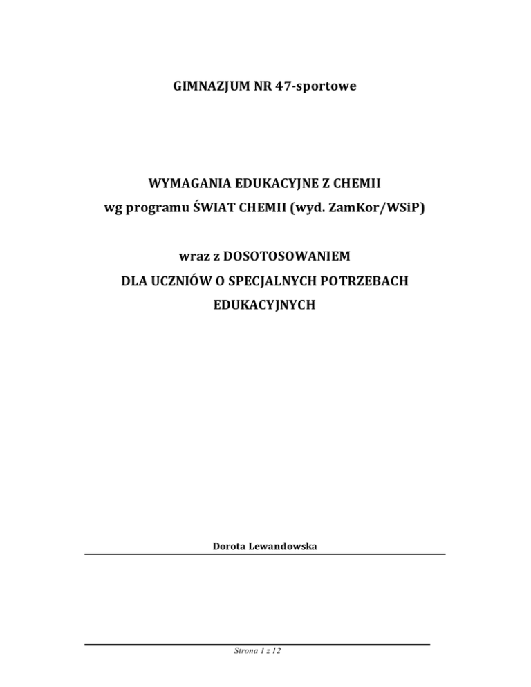 GIMNAZJUM NR 47-sportowe WYMAGANIA EDUKACYJNE Z CHEMII wg programu ŚWIAT CHEMII (wyd. ZamKor/WSiP) wraz z DOSOTOSOWANIEM DLA UCZNIÓW O SPECJALNYCH POTRZEBACH EDUKACYJNYCH Dorota Lewandowska Strona 1 z 12 Informacje ogólne 1. Dostosowanie polega na modyfikacji procesu edukacyjnego, umożliwiającej uczniom sprostanie wymaganiom szkolnym. Dostosowanie wymagań: • dotyczy głównie form i metod pracy z uczniem, zdecydowanie rzadziej treści nauczania, • nie polega na takiej zmianie treści nauczania, która powoduje obniżanie wymagań wobec uczniów z normą intelektualną, • nie oznacza pomijania haseł programowych, tylko ewentualne realizowanie ich na poziomie wymagań koniecznych lub podstawowych, • nie prowadzi do zejścia poniżej podstawy programowej, a zakres wiedzy i umiejętności daje szansę uczniowi na sprostanie wymaganiom kolejnego etapu edukacyjnego. Obszary dostosowania obejmują: • warunki procesu edukacyjnego tj zasady, metody, formy, środki dydaktyczne, • zewnętrzną organizację nauczania (np. posadzenie ucznia słabosłyszącego w pierwszej ławce), • warunki sprawdzania poziomu wiedzy i umiejętności (metody i formy sprawdzania i kryteria oceniania). 2. Dostosowanie wymagań edukacyjnych do uczniów o specjalnych potrzebach edukacyjnych. 2.1.Uczeń ze sprawnością intelektualną niższą od przeciętnej W przypadku tych uczniów konieczne jest dostosowanie zarówno w zakresie formy, jak i treści wymagań. W zasadzie tylko w tej grupie uczniów można mówić o obniżeniu wymagań pamiętając jednak, że obniżenie kryteriów jakościowych nie może zejść poniżej podstawy programowej. Ogólne wymagania co do formy: • omawianie niewielkich partii materiału i o mniejszym stopniu trudności, • pozostawianie więcej czasu na jego utrwalenie, • podawanie poleceń w prostszej formie, • unikanie trudnych, czy bardzo abstrakcyjnych pojęć, • częste odwoływanie się do konkretu, przykładu, • unikanie pytań problemowych, przekrojowych, • wolniejsze tempo pracy, • szerokie stosowanie zasady poglądowości, • odrębne instruowanie, • zadawanie do domu tyle, ile uczeń jest w stanie wykonać samodzielnie. Strona 2 z 12 2.2. Uczeń z dysleksją Sposoby dostosowania wymagań edukacyjnych do potrzeb psychofizycznych i edukacyjnych uczniów: • częste odwoływanie się do konkretu (np. graficzne przedstawianie treści zadań), szerokie stosowanie zasady poglądowości, • omawianie niewielkich partii materiału i o mniejszym stopni trudności (pamiętając, że obniżenie wymagań nie może zejść poniżej podstawy programowej), • podawanie poleceń w prostszej formie (dzielenie złożonych treści na proste, bardziej zrozumiałe części), • wydłużanie czasu na wykonanie zadania, • podchodzenie do dziecka w trakcie samodzielnej pracy w razie potrzeby udzielenie pomocy, wyjaśnień, mobilizowanie do wysiłku i ukończenia zadania, • zadawanie do domu tyle, ile dziecko jest w stanie samodzielnie wykonać, • potrzeba większej ilości czasu i powtórzeń dla przyswojenia danej partii materiału. Formy, metody, sposoby dostosowania wymagań edukacyjnych: • w czasie odpowiedzi ustnych dyskretnie wspomagać, dawać więcej czasu na przypomnienie, wydobycie z pamięci nazw, terminów, dyskretnie naprowadzać, • wprowadzać w nauczaniu metody aktywne, angażujące jak najwięcej zmysłów (ruch, dotyk, wzrok, słuch), używać wielu pomocy dydaktycznych, urozmaicać proces nauczania, • zróżnicować formy sprawdzania wiadomości i umiejętności tak, by ograniczyć ocenianie na podstawie pisemnych odpowiedzi ucznia, • przeprowadzać sprawdziany ustne z ławki, niekiedy nawet odpytywać indywidualnie, • naukę definicji, reguł wzorów, symboli chemicznych rozłożyć w czasie, często przypominać i utrwalać, • nie wyrywać do natychmiastowej odpowiedzi, przygotować wcześniej zapowiedzią, że uczeń będzie pytany, • w trakcie rozwiązywania zadań tekstowych sprawdzać, czy uczeń przeczytał treść zadania i czy prawidłowo ją zrozumiał, w razie potrzeby udzielać dodatkowych wskazówek, • w czasie sprawdzianów zwiększyć ilość czasu na rozwiązanie zadań lub przygotować mniejszą liczbę zadań • często oceniać prace domowe. • uwzględniać trudności związane z myleniem znaków działań, przestawianiem cyfr, zapisywaniem równań reakcji chemicznych itp., • materiał sprawiający trudność dłużej utrwalać, dzielić na mniejsze porcje, • oceniać tok rozumowania, nawet gdyby ostateczny wynik zadania był błędny, co wynikać może z pomyłek rachunkowych, Strona 3 z 12 • oceniać dobrze, jeśli wynik zadania jest prawidłowy, choćby strategia dojścia do niego była niezbyt jasna, gdyż uczniowie dyslektyczni często prezentują styl dochodzenia do rozwiązania niedostępny innym osobom, będący na wyższym poziomie kompetencji. 3. W przypadku uczniów posiadających opinie Poradni Psychologiczno- Pedagogicznej o dysleksji i dysgrafii przy ocenie zadań i prac pisemnych, błędy wynikające z orzeczonych dysfunkcji nie rzutują na ocenę. 4. Uczniowie mający opinie o trudnościach w pisaniu, mogą zaliczać kartkówki i sprawdziany ustnie, na zajęciach dodatkowych, zgodnie z zaleceniami Poradni Psychologiczno – Pedagogicznej po wcześniejszym ustaleniu z nauczycielem. 5. Nauczyciel stosuje dodatkowo ustną informuję o postępach ucznia, która zawiera następujące elementy: - co jest mocną stroną ucznia w ramach tego przedmiotu, - co jest jego słabą stroną wymagającą zwiększonego wysiłku, - jakie działania proponuje nauczyciel w celu wsparcia ucznia. 6. Czcionką pogrubioną wskazano umiejętności, które uczeń z orzeczeniem dysleksji wykonuje z pomocą nauczyciela. Otrzymanie oceny wyższej oznacza spełnienie wymagań także na ocenę niższą. Strona 4 z 12 KLASA PIERWSZA SZKOLNA PRACOWNIA CHEMICZNA dopuszczającą Uczeń: ‐ zna i stosuje zasady bez