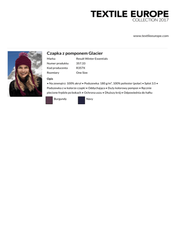 Czapka z pomponem Glacier Marka Result Winter Essentials Numer produktu 357.33 Kod producenta R357X Rozmiary One Size Opis • Na zewnątrz: 100% akryl • Podszewka: 180 g/m², 100% poliester (polar) • Splot 3.5 • Podszewka z w kolorze czapki • Oddychająca • Duży kolorowy pompon • Ręcznie plecione frędzle po bokach • Ochrona uszu • Dłuższy krój • Odpowiednia do haftu Burgundy Navy