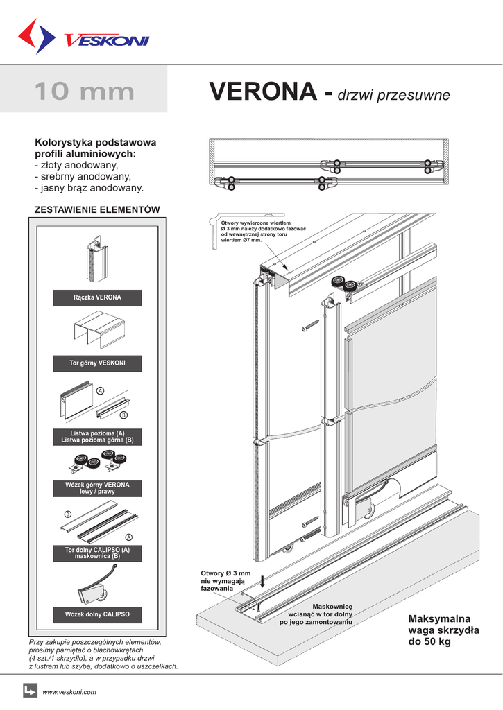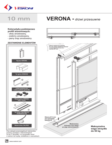 VERONA - drzwi przesuwne Kolorystyka podstawowa profili aluminiowych: - złoty anodowany, - srebrny anodowany, - jasny brąz anodowany. ZESTAWIENIE ELEMENTÓW Otwory wywiercone wiertłem Ø 3 mm należy dodatkowo fazować od wewnętrznej strony toru wiertłem Ø7 mm. Rączka VERONA Tor górny VESKONI Listwa pozioma (A) Listwa pozioma górna (B) Wózek górny VERONA lewy / prawy Tor dolny CALIPSO (A) maskownica (B) Otwory Ø 3 mm nie wymagają fazowania Wózek dolny CALIPSO Przy zakupie poszczególnych elementów, prosimy pamiętać o blachowkrętach (4 szt./1 skrzydło), a w przypadku drzwi z lustrem lub szybą, dodatkowo o uszczelkach. Maskownicę wcisnąć w tor dolny po jego zamontowaniu Maksymalna waga skrzydła do 50 kg VERONA - drzwi przesuwne Wyznaczanie wymiarów drzwi i wypełnień Wysokość skrzydła drzwi h = H - 40 mm Wysokość płyty hp = h - 62 mm Wysokość lustra hl = hp - 4 mm Szerokość skrzydła drzwi d = (D - 3mm + Z) / N Szerokość płyty dp = d - 28 mm Długość listwy poziomej i listwy poziomej dolnej dk = d - 44 mm Szerokość lustra dl = dp - 4 mm Światło otworu dp d ilość skrzydeł szerokość zakładki 37 mm 74 mm 111 mm Szczegóły montażowe Sposób montażu płyty #10 mm lub szyby/lustra #4 mm w rączce Sposób wiercenia otworów w rączce 6 Blachowkręt Ø 6,3mm x 32 mm Ø 6,5 41 8 Sposób montażu płyty #10 mm lub szyby/lustra #4 mm w listwie poziomej górnej i dolnej Ø 9,5 Sposób montażu toru dolnego z maskownicą Uwaga! Otwory wiercone wiertłem Ø3 mm można dodatkowo fazować od wewnętrznej strony toru wiertłem Ø7 mm. VESKONI nie ponosi odpowiedzialności za odkształcenia profili spowodowane użyciem płyt złej jakości (niewłaściwe składowanie, wilgotność). system drzwi przesuwnych na płytę #10 mm