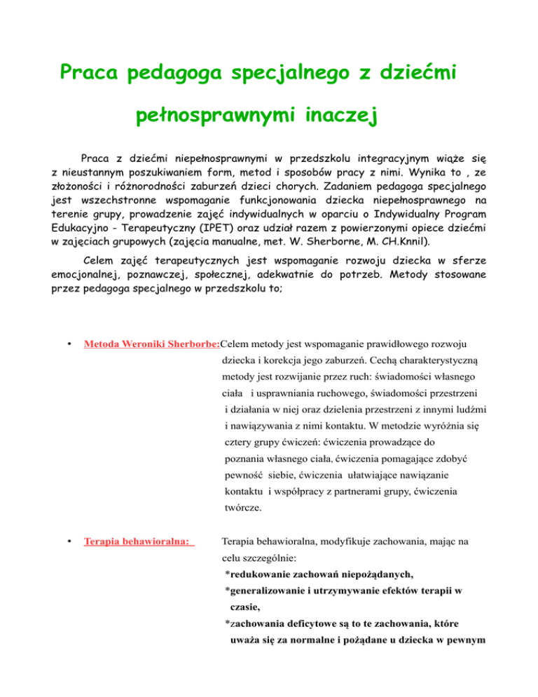Praca pedagoga specjalnego z dziećmi pełnosprawnymi inaczej Praca z dziećmi niepełnosprawnymi w przedszkolu integracyjnym wiąże się z nieustannym poszukiwaniem form, metod i sposobów pracy z nimi. Wynika to , ze złożoności i różnorodności zaburzeń dzieci chorych. Zadaniem pedagoga specjalnego jest wszechstronne wspomaganie funkcjonowania dziecka niepełnosprawnego na terenie grupy, prowadzenie zajęć indywidualnych w oparciu o Indywidualny Program Edukacyjno - Terapeutyczny (IPET) oraz udział razem z powierzonymi opiece dziećmi w zajęciach grupowych (zajęcia manualne, met. W. Sherborne, M. CH.Knnil). Celem zajęć terapeutycznych jest wspomaganie rozwoju dziecka w sferze emocjonalnej, poznawczej, społecznej, adekwatnie do potrzeb. Metody stosowane przez pedagoga specjalnego w przedszkolu to; • Metoda Weroniki Sherborbe:Celem metody jest wspomaganie prawidłowego rozwoju dziecka i korekcja jego zaburzeń. Cechą charakterystyczną metody jest rozwijanie przez ruch: świadomości własnego ciała i usprawniania ruchowego, świadomości przestrzeni i działania w niej oraz dzielenia przestrzeni z innymi ludźmi i nawiązywania z nimi kontaktu. W metodzie wyróżnia się cztery grupy ćwiczeń: ćwiczenia prowadzące do poznania własnego ciała, ćwiczenia pomagające zdobyć pewność siebie, ćwiczenia ułatwiające nawiązanie kontaktu i współpracy z partnerami grupy, ćwiczenia twórcze. • Terapia behawioralna: Terapia behawioralna, modyfikuje zachowania, mając na celu szczególnie: *redukowanie zachowań niepożądanych, *generalizowanie i utrzymywanie efektów terapii w czasie, *zachowania deficytowe są to te zachowania, które uważa się za normalne i pożądane u dziecka w pewnym wieku, a które u danego dziecka występują zbyt rzadko lub nie występują wcale (np. prawidłowa mowa, okazywanie uczuć, zabawa tematyczna). 1)Zadaniem terapeuty behawioralnego jest kształtowanie u dziecka jak największej liczby zachowań adaptacyjnych, które rozwiną jego niezależność i umożliwią mu efektywne funkcjonowanie w środowisku. *Redukowanie zachowań niepożądanych dotyczy takich czynności, jak: -zachowania destrukcyjne, -zachowania agresywne i autoagresywne, -zachowania autostymulacyjne, -zachowania rytualistyczne, -zachowania zakłócające, -odmawianie jedzenia, -nieprawidłowe reakcje emocjonalne, -nieprawidłowa mowa. 2)Najczęściej stosowanymi w celu uzyskania generalizacji strategiami są, w kolejności chronologicznej: -stosowanie wzmocnień sporadycznych, -stosowanie wzmocnień opóźnionych, -stopniowe wycofywanie programu, -przechodzenie od wzmocnień sztucznych do występujących naturalnie, -rozwijanie wsparcia ze strony rówieśników, -przenoszenie utrwalonych zachowań do nowych sytuacji. 3)Terapia behawioralna opiera się na kilku podstawowych zasadach, których przestrzeganie gwarantuje osiągnięcie sukcesu w pracy z dzieckiem . Są to: -zasada małych kroków, -zasada stopniowania trudności, -zasada stosowania wzmocnień. • Metoda Paula Dennisona: Metoda opiera się na prostych ćwiczeniach ruchowych stymuluje i oddziałuje na mózg. Metoda zwana „Gimnastyką mózgu”. Ćwiczenia to przede wszystkim ćwiczenia koordynacji ruchowej całego ciała, koordynacji ruchowowzrokowej oraz koordynacji pracy zmysłu wzroku, słuchu, czucia proprioceptywnego, równowagi z obszarami planowania ruchowego w korze mózgowej, czucia przestrzeni, myślenia i przewidywania. Ćwiczenia te integrują cały mózg do pracy. Wyróżniamy cztery grupy ćwiczeń: ćwiczenia lateralne, ćwiczenia uaktywniające połączenia nerwowe między przednią częścią mózgu a tylną, ćwiczenia energetyzujące i ćwiczenia pogłębione. Szczególnie przydatne mogą być ćwiczenia naprzemienne, rysowanie oburącz lub symetryczne bazgranie. • Relaksacja: Relaksacja jest to zmniejszanie się naprężeń w ciele, rozluźnianie napięcia, wiotczenie tkanek. Stan ten osiąga się przy udziale świadomości, albowiem podstawą aktywnego rozluźnienia napiętych mięśni jest rozwijanie czucia proprioceptywnego i kinestetycznego oraz dążenie do opanowania przestrzennego schematu ciała i biologicznego rytmu, w którym ruch i wysiłek fizyczny stymulują następczą fazę odprężenia i wypoczynku. • Nauczanie funkcjonalne: Opanowanie przez dziecko sprawności i umiejętności przydatnych w życiu codziennym oraz stworzenie możliwości doświadczania sukcesu to dwa podstawowe cele tych metod. Główne założenia metod funkcjonalnych zawrzeć można w następujących sformułowaniach: 1. Konieczność zaakceptowania roli działania i jego wyników. 2. Wykorzystanie istniejących w dziecku sprawności. 3. Umożliwienie mu funkcjonowania w maksymalnym zakresie kontaktów osobistych i społecznych. 4. W nauczaniu dziecka, w trakcie tworzenia i realizacji programu pracy z nim, uwzględnia się kolejno wszystkie stadia prawidłowego rozwoju. Od tego czy nie zostanie pominięty żaden etap – zależeć będzie harmonijny rozwój. W metodzie tej stosuje się następujące grupy ćwiczeń: 1)ćwiczenia czynności ruchowych, 2)podstawowe ćwiczenia postrzegania, 3)ćwiczenia koordynujące ruch i postrzeganie. Metoda M. Ch. Knillów: Programy aktywności: Świadomość ciała, kontakt i komunikacja: Zostały stworzone przez Mariannę i Christophera Knillów. Podstawowym ich celem jest rozbudzenie aktywności osoby niepełnosprawnej, zachęcanie jej do działania i przejawiania własnej inicjatywy. Działania terapeutyczne oparte są na tworzeniu sposobności do doświadczania, nabywania i organizowania podstawowych informacji o sobie. Niezbędne do tego jest jednak stworzenie warunków, w których podopieczny będzie czuł się bezpiecznie, w których możliwe będzie wywołanie i utrzymanie jego uwagi. Dlatego np. po to, by osoba niepełnosprawna mogła rozpoznać sytuację, która za chwilę nastąpi- każdą aktywność poprzedzają i kończą specjalne dźwięki. M