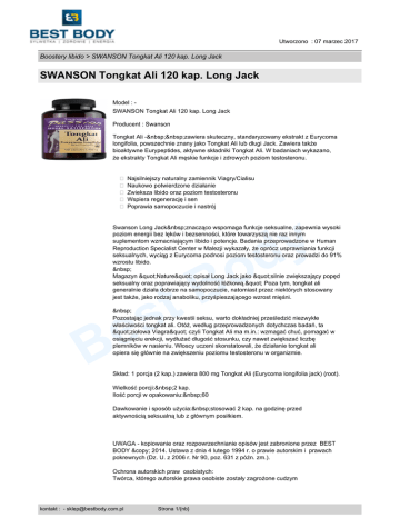 Utworzono : 07 marzec 2017 Boostery libido > SWANSON Tongkat Ali 120 kap. Long Jack SWANSON Tongkat Ali 120 kap. Long Jack Model : SWANSON Tongkat Ali 120 kap. Long Jack Producent : Swanson Tongkat Ali - zawiera skuteczny, standaryzowany ekstrakt z Eurycoma longifolia, powszechnie znany jako Tongkat Ali lub długi Jack. Zawiera także bioaktywne Eurypeptides, aktywne składniki Tongkat Ali. W badaniach wykazano, że ekstrakty Tongkat Ali męskie funkcje i zdrowych poziom testosteronu. � Najsilniejszy naturalny zamiennik Viagry/Cialisu � Naukowo potwierdzone działanie � Zwieksza libido oraz poziom testosteronu � Wspiera regenerację i sen � Poprawia samopoczucie i nastrój y d Swanson Long Jack znacząco wspomaga funkcje seksualne, zapewnia wysoki poziom energii bez lęków i bezsenności, które towarzyszą nie raz innym suplementom wzmacniającym libido i potencje. Badania przeprowadzone w Human Reproduction Specialist Center w Malezji wykazały, że oprócz usprawniania funkcji seksualnych, wyciąg z Eurycoma podnosi poziom testosteronu oraz prowadzi do 91% wzrostu libido. Magazyn "Nature" opisał Long Jack jako "silnie zwiększający popęd seksualny oraz poprawiający wydolność łóżkową." Poza tym, tongkat ali generalnie działa dobrze na samopoczucie, natomiast przez niektórych stosowany jest także, jako rodzaj anaboliku, przyśpieszającego wzrost mięśni. t s e B o B Pozostając jednak przy kwestii seksu, warto dokładniej prześledzić niezwykłe właściwości tongkat ali. Otóż, według przeprowadzonych dotychczas badań, ta "ziołowa Viagra" czyli Tongkat Ali ma m.in.: wzmagać chuć, pomagać w osiągnięciu erekcji, wydłużać długość stosunku, czy nawet zwiększać liczbę plemników w nasieniu. Włoscy uczeni skonstatowali, że działanie tongkat ali opiera się głównie na zwiększeniu poziomu testosteronu w organizmie. Skład: 1 porcja (2 kap.) zawiera 800 mg Tongkat Ali (Eurycoma longifolia jack) (root). Wielkość porcji: 2 kap. Ilość porcji w opakowaniu: 60 Dawkowanie i sposób użycia: stosować 2 kap. na godzinę przed aktywnością seksualną lub z głównym posiłkiem. UWAGA - kopiowanie oraz rozpowrzechnianie opisów jest zabronione przez BEST BODY © 2014. Ustawa z dnia 4 lutego 1994 r. o prawie autorskim i prawach pokrewnych (Dz. U. z 2006 r. Nr 90, poz. 631 z późn. zm.). Ochrona autorskich praw osobistych: Twórca, którego autorskie prawa osobiste zostały zagrożone cudzym kontakt : - [email protected] Strona 1/{nb} Utworzono : 07 marzec 2017 Boostery libido > SWANSON Tongkat Ali 120 kap. Long Jack SWANSON Tongkat Ali 120 kap. Long Jack działaniem, może żądać zaniechania tego działania. W razie dokonanego naruszenia może także żądać, aby osoba, która dopuściła się naruszenia, dopełniła czynności potrzebnych do usunięcia jego skutków, w szczególności, aby złożyła publiczne oświadczenie o odpowiedniej treści i formie. Jeżeli naruszenie było zawinione, sąd może przyznać twórcy odpowiednią sumę pieniężną tytułem zadośćuczynienia za doznaną krzywdę albo - na żądanie twórcy - zobowiązać sprawcę, aby uiścił odpowiednią sumę pieniężną na wskazany przez twórcę cel społeczny. Cena : 149,00 zł Brutto ( 139,25 zł Netto) Dostępność: Produkt dostępny w naszym sklepie od 26 wrzesień 2014 t s e B kontakt : - [email protected] Strona 2/{nb} o B y d