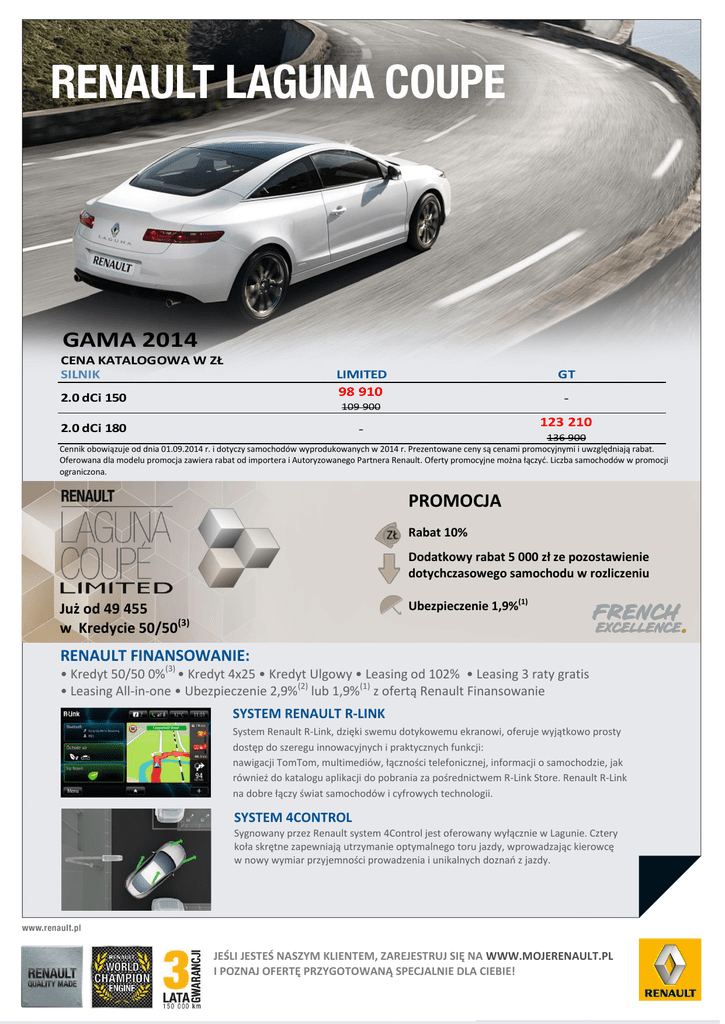 GAMA 2014 CENA KATALOGOWA W ZŁ SILNIK LIMITED 2.0 dCi 150 98 910 2.0 dCi 180 - GT - 109 900 123 210 136 900 Cennik obowiązuje od dnia 01.09.2014 r. i dotyczy samochodów wyprodukowanych w 2014 r. Prezentowane ceny są cenami promocyjnymi i uwzględniają rabat. Oferowana dla modelu promocja zawiera rabat od importera i Autoryzowanego Partnera Renault. Oferty promocyjne można łączyć. Liczba samochodów w promocji ograniczona. PROMOCJA Rabat 10% Dodatkowy rabat 5 000 zł ze pozostawienie dotychczasowego samochodu w rozliczeniu Ubezpieczenie 1,9%(1) Już od 49 455 w Kredycie 50/50(3) RENAULT FINANSOWANIE: • Kredyt 50/50 0%(3) • Kredyt 4x25 • Kredyt Ulgowy • Leasing od 102% • Leasing 3 raty gratis • Leasing All-in-one • Ubezpieczenie 2,9%(2) lub 1,9%(1) z ofertą Renault Finansowanie SYSTEM RENAULT R-LINK System Renault R-Link, dzięki swemu dotykowemu ekranowi, oferuje wyjątkowo prosty dostęp do szeregu innowacyjnych i praktycznych funkcji: nawigacji TomTom, multimediów, łączności telefonicznej, informacji o samochodzie, jak również do katalogu aplikacji do pobrania za pośrednictwem R-Link Store. Renault R-Link na dobre łączy świat samochodów i cyfrowych technologii. SYSTEM 4CONTROL Sygnowany przez Renault system 4Control jest oferowany wyłącznie w Lagunie. Cztery koła skrętne zapewniają utrzymanie optymalnego toru jazdy, wprowadzając kierowcę w nowy wymiar przyjemności prowadzenia i unikalnych doznań z jazdy. JEŚLI JESTEŚ NASZYM KLIENTEM, ZAREJESTRUJ SIĘ NA WWW.MOJERENAULT.PL I POZNAJ OFERTĘ PRZYGOTOWANĄ SPECJALNIE DLA CIEBIE! 2.0 dCi 150 98 910 zł Ceny uwzględniające rabat GŁÓWNE WYPOSAŻENIE SERII SPECJALNEJ LIMITED Światła do jazdy dziennej LED Klimatyzacja automatyczna, dwustrefowa Regulator-ogranicznik prędkości Szyby przednie i tylne elektrycznie podnoszone Czujnik deszczu Lusterka boczne elektrycznie sterowane System wspomagania parkowania tyłem Automatyczny hamulec postojowy Radioodtwarzacz CD MP3, 3D Sound by Arkamys®, z Bluetooth®, USB oraz jack Oznakowanie zewnętrzne LIMITED Obudowy lusterek bocznych w kolorze lśniącej czerni Szyby tylne przyciemniane Tapicerka materiałowo-skórzana LIMITED Kierownica pokryta skórą typu GT Aluminiowa gałka zmiany biegów Nakładki na progi drzwi przednich z oznakowaniem LIMITED Obręcze kół ze stopu metali lekkich 17" wzór Akihiro WYPOSAŻENIE LIMITED GT ESP + ABS + s ys tem ws poma ga ni a na głego ha mowa ni a ● ● Sys tem kontrol i ci ś ni eni a w opona ch ● ● ● ● ● ● ● ● ● ● Możl i woś ć deza ktywa cji podus zki powi etrznej pa s a żera z przodu ● ● Regul a tor - ogra ni czni k prędkoś ci ● ● Zes ta w do na pra wy us zkodzeni a opony ● ● 310 - Automa tyczna bl oka da drzwi podcza s ja zdy ● ● Automa tyczne odbl okowa ni e drzwi w przypa dku zderzeni a ● ● 7 900 ● Przedni e i tyl ne ś wi a tła z di oda mi LED ● ● Fukncja oś wi etl eni a drogi do domu "Fol l ow me Home" ● ● Refl ektory bi -ks enonowe ● ● Refl ektory ki erunkowe (MBL) - 3 200 Sprys ki wa cze refl ektorów ● ● Czujni k ś wi a tła i des zczu Os łony przeci ws łoneczne z podś wi etl a nymi , za myka nymi l us terka mi po s troni e ki erowcy i pa s a żera ora z ki es zeni ą na dokumenty po s troni e ki erowcy El ektrochroma tyczne wewnętrzne l us terko ws teczne ● ● ● ● ● ● 540 540 El ektryczni e regul owa ne l us terka ws teczne ● - El ektryczni e regul owa ne, podgrzewa ne i s kła da ne l us terka ws teczne z pa mi ęci ą us ta wi eni a - ● Za myka ny, chłodzony s chowek w des ce rozdzi el czej ● ● Środkowa kons ol a ze s chowki em pod podłoki etni ki em ● ● Gni a zdo do podłącza ni a a kces ori ów na tyl nej s troni e ś rodkowej kons ol i Gni a zdo do podłączeni a a kces ori ów w s chowku pod podłoki etni ki em ś rodkowej kons ol i ● ● ● ● BEZPIECZEŃSTWO CZYNNE I BIERNE 6 podus zek powi etrznych: czołowe, przedni e boczne, przedni e i tyl ne kurtynowe Przedni e pa s y bezpi eczeńs twa z podwójnymi na pi na cza mi i ogra ni czni ka mi na pi ęci a Dwa 3-punktowe tyl ne pa s y bezpi eczeńs twa z na pi na cza mi i ogra ni czni ka mi na pi ęci a Kontrol ka za pi ęci a l ub bra ku za pi ęci a pa s ów bezpi eczeńs twa Doja zdowe koło za pa s owe (ma ks . prędkoś ć 130 km/h) PROWADZENIE AUTA Sys tem 4Control (4 koła s krętne) OŚWIETLENIE I WIDOCZNOŚĆ Szyba przedni a a termi czna SCHOWKI - FUNKCJONALNOŚĆ LIMITED GT Automa tyczna , dwus trefowa kl i ma tyza cja z czujni ki em za ni eczys zczeń ● ● Ka rta Rena ul t Ha nds Free P ● Szyby przedni e z funkcją za pobi ega ni a przyci ęci u pa l ców ● ● Ki erowni ca z regul a cją wys okoś ci i głębokoś ci us ta wi eni a ● ● Si edzeni a przedni e regul owa ne ma nua l ni e ● - Si edzeni a przedni e regul owa ne el ektryczne z pa mi ęci ą us ta wi eni a po s troni e ki erowcy - ● 1 060 ● Sys tem ws poma ga ni a pa rkowa ni a tyłem ● ● Sys tem ws poma ga ni a pa rkowa ni a przodem i tyłem - 1 600 Automa tyczny ha mul ec pos tojowy, el ektromecha ni czny ● ● Ki erowni ca z regul a cją wys okoś ci i głębokoś ci us ta wi eni a ● ● Ra di oodtwa rza cz CD MP3, 3D Sound by Arka mys ®, Bl uetooth®, gni a zdo USB & ja ck ● ● Ra di oodtwa rza cz CD MP3, Bos e ® Sound Sys tem, Bl uetooth®, gni a zdo USB & ja ck - 2 950 Sys tem Rena ul t R-l i nk P ● Ma pa Europy - wers ja pods ta wowa - ● Ma pa Europy - wers ja rozs zerzona P 430 Obudowy l us terek ws tecznych w kol orze l ś ni ącej czerni ● ● Zderza ki w kol orze na dwozi a ● ● Obręcze kół ze s topu meta l i l ekki ch 18˝ Aki hi ro ● 0 Obręcze kół ze s topu meta l i l ekki ch 18˝ Interl a gos - ● La ki er meta l i zowa ny 2 400 2 400 La ki er meta l i zowa ny s pecja l ny 3 200 3 200 Skórza na ki erowni ca ● ● Li s twy ozdobne na progi drzwi w kol orze meta l u ● ● Al umi ni owa ga łka dźwi gni zmi a