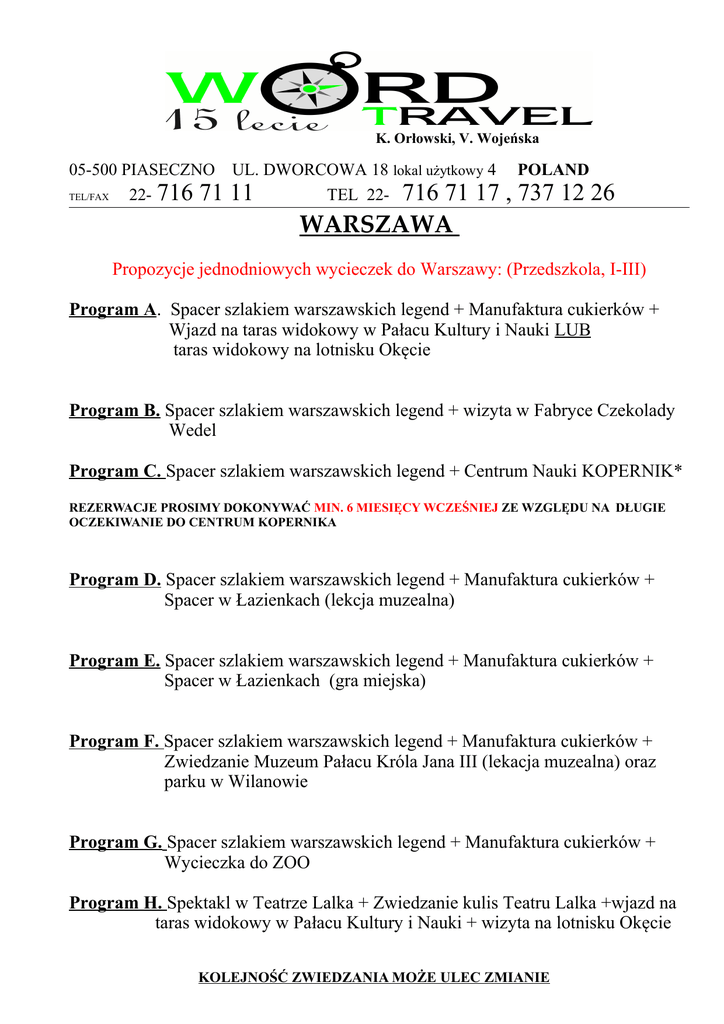 K. Orłowski, V. Wojeńska 05-500 PIASECZNO UL. DWORCOWA 18 lokal użytkowy 4 TEL/FAX 22- 716 71 11 TEL 22- 716 71 17 POLAND , 737 12 26 WARSZAWA Propozycje jednodniowych wycieczek do Warszawy: (Przedszkola, I-III) Program A. Spacer szlakiem warszawskich legend + Manufaktura cukierków + Wjazd na taras widokowy w Pałacu Kultury i Nauki LUB taras widokowy na lotnisku Okęcie Program B. Spacer szlakiem warszawskich legend + wizyta w Fabryce Czekolady Wedel Program C. Spacer szlakiem warszawskich legend + Centrum Nauki KOPERNIK* REZERWACJE PROSIMY DOKONYWAĆ MIN. 6 MIESIĘCY WCZEŚNIEJ ZE WZGLĘDU NA DŁUGIE OCZEKIWANIE DO CENTRUM KOPERNIKA Program D. Spacer szlakiem warszawskich legend + Manufaktura cukierków + Spacer w Łazienkach (lekcja muzealna) Program E. Spacer szlakiem warszawskich legend + Manufaktura cukierków + Spacer w Łazienkach (gra miejska) Program F. Spacer szlakiem warszawskich legend + Manufaktura cukierków + Zwiedzanie Muzeum Pałacu Króla Jana III (lekacja muzealna) oraz parku w Wilanowie Program G. Spacer szlakiem warszawskich legend + Manufaktura cukierków + Wycieczka do ZOO Program H. Spektakl w Teatrze Lalka + Zwiedzanie kulis Teatru Lalka +wjazd na taras widokowy w Pałacu Kultury i Nauki + wizyta na lotnisku Okęcie KOLEJNOŚĆ ZWIEDZANIA MOŻE ULEC ZMIANIE Świadczenia: - transport lux autokarem marki, np. Mercedes, Volvo, Scania, MAN, Neoplan z WC, DVD, barkiem, uchylnymi siedzeniami - realizacja programu turystycznego - opieka pilota - ubezpieczenie NW 5000 zł - VAT - grupy 30 os. - 2 miejsca gratis dla nauczycieli, od 30 do 45 os. – 3 miejsca gratis dla nauczycieli Cena: 55 zł/min. 40 os. - max. 45 os. płacących PROMOCJA DLA GRUP ZE SZKÓŁ PIASECZYŃSKICH w wybranych terminach : pomiędzy15 października, a 30 marca Cena: 40zł/os min. 40 os. - max. 45 os. płacących +dodatkowo bilety wstępu i przewodnicy miejscowi : Program A: 25zł/os Program B: 30zł/os Program C: 20zł/os Program D: 30zł/os Program E: 30zł/os Program F: 30zł/os Program G: 30zł/os Program H: 50zł/os +dodatkowo możliwość zjedzenia obiadu + 20 zł/os. Standardowy rozmiar naszych autokarów to 49 miejsc (do dyspozycji grupy wraz z opiekunami). Na Państwa życzenie możemy zarezerwować autokary 57-70 miejsc (w tym przypadku prosimy o kontakt z biurem w celu sprawdzenia kalkulacji na ponadstandardowy pojazd i jego dostępności w wybranym przez Państwa terminie). W celu podpisania umowy i rezerwacji konkretnego terminu prosimy o telefon do biura 022 716 71 11 lub 022 716 71 17 lub mail [email protected] Zaliczka konieczna do podpisania umowy: 40 zł/os Ze względu na szczyt sezonu wycieczek szkolnych w miesiącach maj-czerwiec sugerujemy dokonanie rez. wstępnej. Termin, który Państwa interesuje potwierdzamy, po sprawdzeniu dostępności wolnych miejsc w hotelu i zrobieniu rezerwacji wstępnej na czas zebrania zaliczek przez nauczyciela ( najczęściej nie dłużej niż 4 tyg.). Wpłata zaliczki następuje w momencie zawarcia umowy. Dopłata – 45 dni przed terminem wyjazdu. KWOTĘ NA BILETY WSTĘPU POTWIERDZAMY PRZED DOPŁATĄ ZGODNIE Z OBOWIĄZUJĄCYMI CENNIKAMI Wyciąg z warunków uczestnictwa imprez turystycznych organizowanych przez B.P. Word Travel (pełna wersja warunków uczestnictwa dostępna jest u nauczyciela organizującego wycieczkę): 13. W przypadku rezygnacji lub nie uczestniczenia Uczestnika w wykupionej imprezie Organizator uprawniony jest do potrącenia RZECZYWIŚCIE PONIESIONYCH KOSZTÓW. 14. Zmiana uczestnika nie pociąga za sobą kosztów finansowych. 18. Uczestnik odpowiada za wszelkie szkody materialne wyrządzone w trakcie trwania imprezy (zniszczenia w hotelu, autokarze) 15. Jeżeli w programie jest wyjazd poza granicę Polski - uczestnik winien posiadać na miejscu zbiórki aktualnie obowiązujące dokumenty uprawniające do przekroczenia granic krajów objętych programem imprezy (wyłącznie dowód osobisty lub paszport ważny min. 6 m-cy od daty powrotu). 9 B. W przypadku chorób uznawanych za przewlekłe uczestnik winien na własny koszt wykupić dodatkowe ubezpieczenie ! (dotyczy wycieczek zagranicznych) Klient przez dokonanie wpłaty (całkowitej lub częściowej) akceptuje program wycieczki i warunki uczestnictwa.