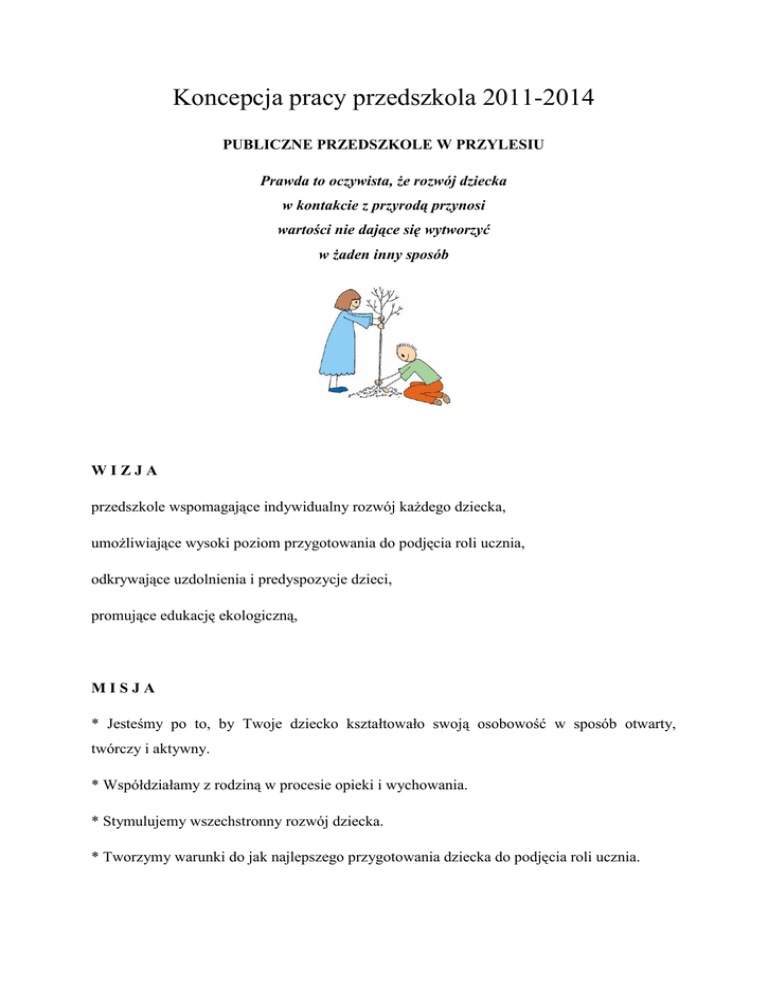 Koncepcja pracy przedszkola 2011-2014 PUBLICZNE PRZEDSZKOLE W PRZYLESIU Prawda to oczywista, że rozwój dziecka w kontakcie z przyrodą przynosi wartości nie dające się wytworzyć w żaden inny sposób WIZJA przedszkole wspomagające indywidualny rozwój każdego dziecka, umożliwiające wysoki poziom przygotowania do podjęcia roli ucznia, odkrywające uzdolnienia i predyspozycje dzieci, promujące edukację ekologiczną, MISJA * Jesteśmy po to, by Twoje dziecko kształtowało swoją osobowość w sposób otwarty, twórczy i aktywny. * Współdziałamy z rodziną w procesie opieki i wychowania. * Stymulujemy wszechstronny rozwój dziecka. * Tworzymy warunki do jak najlepszego przygotowania dziecka do podjęcia roli ucznia. * Staramy się poznać potrzeby Twojego dziecka, gdyż diagnozujemy jego możliwości i zainteresowania. * Odkrywamy twórcze predyspozycje Twojego dziecka i dajemy mu możliwość rozwijania ich. * Propagujemy zdrowy styl życia poprzez realizację szeregu działań promujących edukację ekologiczną. NASZE PRZEDSZKOLE Nasze przedszkole mieści się w budynku Publicznego Zespołu Szkolno-Przedszkolnego w Przylesiu. Posiadamy dwie piękne sale, które służą nam do pracy i zabawy, halę sportową oraz wielofunkcyjne boisko. Plac zabaw to szczególne miejsce codziennych zabaw na świeżym powietrzu. Część placu zabaw zorganizowaliśmy sami, biorąc udział w projektach ekologicznych oraz przy pomocy rodziców, drugą część ufundowało nam Stowarzyszenie Odnowy Wsi Przylesie W przedszkolu funkcjonują 2 grupy dziecięce według zbliżonego wieku: od 3 do 6 lat. BAZA PRZEDSZKOLA Placówka posiada: * 2 sale dydaktyczne wyposażone w meble, zabawki i pomoce dydaktyczne; * 1 łazienkę, * 1 szatnię oraz szafki dla starszaków * wyposażony plac zabaw; * kuchnię z niezbędnym zapleczem, magazyny żywnościowe; GŁÓWNE PRIORYTETY PRZEDSZKOLA 1. UJAWNIANIE TKWIĄCYCH W DZIECIACH ZDOLNOŚCI TWÓRCZYCH I UMOŻLIWIANIE ICH ROZWOJU. 2. REALIZACJA PRZYJĘTEJ PRZEZ PRZEDSZKOLE POLITYKI PROEKOLOGICZNEJ. Jedną z najważniejszych zasad pracy z dziećmi jest stosowanie indywidualizacji działań w zakresie opieki, wychowania i nauczania. Stwarzanie warunków do odkrywania zdolności, predyspozycji oraz talentów tkwiących w dzieciach pozwala nam na bardziej wszechstronne kształtowanie osobowości młodego człowieka. Proces uświadomienia sobie odrębności twórczej własnej osoby przebiega u dzieci w różnym tempie i czasie. Nasze działania w zakresie realizacji pierwszego z priorytetów skupiają się na: * obserwowaniu zachowań dziecięcych w celu poszukiwania indywidualnych predyspozycji każdego dziecka, planowaniu działań edukacyjnych i monitorowaniu ich efektów; * poszerzaniu wiedzy i umiejętności o twórczym aspekcie w rozwoju dziecka przedszkolnego; * uczestniczeniu nauczycieli w szkoleniach, warsztatach, kursach; * aktywizowaniu rodziców do wspólnych działań na rzecz wspomagania twórczego procesu edukacyjnego ich pociech; * wzbogacaniu bazy przedszkola na rzecz lepszego aktywizowania dzieci do podejmowania twórczych działań; * poszukiwaniu nowych metod i form prowadzenia zabaw i zajęć z dziećmi w sposób aktywny, otwarty i twórczy; * analizowaniu spostrzeżeń i wniosków z tego zakresu zgłaszanych przez dzieci, ich rodziców, personel przedszkola, zewnętrznych obserwatorów działań naszej placówki; * uczestniczeniu w prezentacjach artystycznych w środowisku lokalnym; poszukiwaniu ciekawych form prezentacji artystycznych w konkursach organizowanych przez różne organizacje, inne przedszkola. * sukcesy naszych wychowanków prezentujemy w galerii przedszkolnej, w prasie lokalnej, na stronie internetowej. Drugim naszym priorytetem jest realizacja przyjętej polityki środowiskowej przedszkola. Od kilku lat ze szczególnym zaangażowaniem realizujemy zagadnienia proekologiczne związane z ideą edukacji dla zrównoważonego rozwoju. Jest to kierunek obecnych i przyszłych działań dydaktyczno-wychowawczych, w które zaangażowani są nauczyciele, inni pracownicy przedszkola, rodzice oraz pozyskiwani sojusznicy lokalni. Nasze działania zmierzają do stworzenia dzieciom jak najlepszych warunków do aktywnego zdobywania wiedzy i umiejętności, twórczej zabawy, promowania zdrowego stylu życia oraz postaw ekologicznych. Realizując politykę środowiskową w naszym przedszkolu kierujemy się następującymi zasadami: - Zasada ciągłego doskonalenia siebie oraz działań na rzecz ekologii * Doskonalimy swój warsztat pracy pod kątem merytorycznym i metodycznym. * Systematycznie i planowo metodami aktywnymi wprowadzamy rozszerzone treści przyrodniczo-ekologiczne. * Bierzemy udział w kampaniach i programach proekologicznych. * Wzbogacamy nasza bazę dydaktyczną o akcesoria, pomoce, książki, albumy. * Pozyskujemy fundusze, * Chętnie dzielimy się swoją wiedzą z innymi. * Organizujemy wycieczki ekologiczne, warsztaty, zajęcia edukacyjne prowadzone przez specjalistów. * Organizujemy dzieciom konkursy, quizy o tematyce ekologicznej. * Podejmujemy działania zmierzające do ograniczenia zużycia energii, wody, ilości wytworzonych odpadów. Prowadzimy zbiórkę baterii, plastikowych zakrętek. * Dokładamy szczególnych starań o estetykę i czystość najbliższego otoczenia. * Sadzimy i opiekujemy się krzewami, drzewami i kwiatami wokół budynku. * Dni związane z ochroną środowiska (np. Dzień Ziemi, Sprzątanie Świata, …itp:) stanowią część działań przedszkola na stałe wpisane w kalendarz naszych działań. - Zasada zgodności z prawem ochrony środowiska oraz innymi uregulowaniami Naszą bieżącą działalność oraz nowe przedsięwzięcia realizujemy zgodnie z obowiązującym prawem. W związku ze zmieniającą się rzeczywistością , staramy się weryfikować treści edukacji ekologicznej oraz formy pracy z dziećmi. Ustalamy i przestrzegamy wewnętrznych norm i uregulowań powstałych na bazie obowiązują