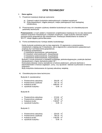 1 OPIS TECHNICZNY I. Dane ogólne 1. Przedmiot inwestycji obejmuje wykonanie: a) Czterech małych budynków wielorodzinnych z lokalami socjalnymi b) Dróg dojazdowych, ciągów pieszych, miejsc parkingowych oraz niezbędnej infrastruktury 2. Przeznaczenie i program użytkowy obiektów budowlanych oraz, ich charakterystyczne parametry techniczne: Przeznaczenie: w myśl ustaleń z Inwestorem projektowana inwestycja ma na celu stworzenie czterech budynków mieszkalnych z lokalami socjalnymi. Część budynku stanowić będzie pomieszczenia gospodarcze dla mieszkańców. Inwestycja zlokalizowana na działce nr 301/77, obręb Łęgajny gmina Barczewo. 3. Forma architektoniczna i funkcje obiektu budowlanego: Każdy budynek podzielony jest na dwa segmenty. W segmencie o przeznaczeniu mieszkalnym znajdują się 4 mieszkania, zaś w segmencie o przeznaczeniu gospodarczym znajdują się 4 pomieszczenia gospodarcze. W inwestycji przewidziano: - 2 mieszkania dwuosobowe, jednopokojowe -10 mieszkań czteroosobowych, dwupokojowe - 2 mieszkania sześcioosobowe, trzypokojowe - 2 mieszkania siedmioosobowe, trzypokojowe Budynki o rzucie poziomym w kształcie prostokąta, jednokondygnacyjne, przekryte dachem dwuspadowym o kącie nachylenia połaci 30 º. Kolorystyka elewacji: ściany zewnętrzne w kolorze piaskowym, pokrycie dachowe z blachodachówki w kolorze ceglastym, rynny, rury spustowe -stalowe ocynkowane w kolorze brązowym. Bryły budynków dostosowane do typowej zabudowy wiejskiej. 4. Charakterystyczne dane techniczne: Budynek A: (powtarzalny) Powierzchnia zabudowy Powierzchnia użytkowa Kubatura brutto wysokość budynku - 2 - 204,95 m 2 - 167,16 m 3 - 1085,60 m 6,46 m Budynek B: Powierzchnia zabudowy Powierzchnia użytkowa Kubatura brutto wysokość budynku - 2 - 212,64 m - 167,32 m2 - 1126,87 m3 6,46 m Budynek C: Powierzchnia zabudowy Powierzchnia użytkowa Kubatura brutto wysokość budynku - - 224,93 m2 2 - 184,32 m - 1192,80 m3 6,46 m 2 5. Program użytkowy: • 1/1 1/2 1/3 1/4 1/5 1/6 BUDYNEK A (powtarzalny): Lokal mieszkaniowy 1, pow. 41,79 m 2,4-osobowyWiatrołap 1,77m 2 Pokój 16,34m2 2 Pokój 9,85m 2 Łazienka 3,99m Kuchnia 4,75m 2 Pomieszczenie gosp. 5,09m terakota terakota terakota terakota terakota posadzka betonowa • 2/1 2/2 2/3 2/4 2/5 2/6 Lokal mieszkaniowy 2, pow. 41,79 m 2, 4-osobowy2 Wiatrołap 1,77m Pokój 16,34m2 Pokój 9,85m2 2 Łazienka 3,99m Kuchnia 4,75m2 2 Pomieszczenie gosp. 5,09m terakota terakota terakota terakota terakota posadzka betonowa • 3/1 3/2 3/3 3/4 3/5 3/6 Lokal mieszkaniowy 3, pow. 41,79 m 2, 4-osobowy2 Wiatrołap 1,77m 2 Pokój 16,34m Pokój 9,85m2 Łazienka 3,99m2 Kuchnia 4,75m2 Pomieszczenie gosp. 5,09m2 terakota terakota terakota terakota terakota posadzka betonowa • 4/1 4/2 4/3 4/4 4/5 4/6 Lokal mieszkaniowy 4, pow. 41,79 m 2, 4-osobowy2 Wiatrołap 1,77m 2 Pokój 16,34m Pokój 9,85m2 Łazienka 3,99m2 Kuchnia 4,75m2 Pomieszczenie gosp. 5,09m2 terakota terakota terakota terakota terakota posadzka betonowa • 5/1 5/2 5/3 5/4 5/5 BUDYNEK B: Lokal mieszkaniowy 5, pow. 33,29 m 2, 2-osobowyWiatrołap 1,77m2 Kuchnia 4,75m2 Łazienka 3,99m2 Pokój 17,69m2 Pomieszczenie gosp. 5,09m2 terakota terakota terakota terakota posadzka betonowa • 6/1 6/2 6/3 6/4 6/5 5/4 6/6 Lokal mieszkaniowy 6, pow. 50,37 m , 7-osobowy2 Wiatrołap 1,77m 2 Pokój 21,20m Pokój 8,54m2 Pokój 8,54m2 Łazienka 3,99m2 2 Kuchnia 4,75m 2 Pomieszczenie gosp. 5,09m terakota terakota terakota terakota terakota terakota posadzka betonowa • 7/1 7/2 7/3 7/4 7/5 7/4 7/6 Lokal mieszkaniowy 7, pow. 50,37 m 2, 7-osobowyWiatrołap 1,77m2 Pokój 21,20m2 Pokój 8,54m2 2 Pokój 8,54m Łazienka 3,99m2 Kuchnia 4,75m2 2 Pomieszczenie gosp. 5,09m terakota terakota terakota terakota terakota terakota posadzka betonowa 2 2 • Lokal mieszkaniowy 8, pow. 33,29 m , 2-osobowy2 8/1 Wiatrołap 1,77m 8/2 Kuchnia 4,75m2 terakota terakota 3 8/3 Łazienka 8/4 Pokój 8/5 Pomieszczenie gosp. 3,99m2 2 17,69m 2 5,09m BUDYNEK C: Lokal mieszkaniowy 9, pow. 50,37 m 2, 6-osobowy2 Wiatrołap 1,77m 2 Pokój 17,69m Pokój 8,54m2 2 Pokój 8,54m 2 Łazienka 3,99m 2 Kuchnia 4,75m 2 Pomieszczenie gosp. 5,09m 9/1 9/2 9/3 9/4 9/5 9/6 9/7 terakota terakota posadzka betonowa terakota terakota terakota terakota terakota terakota posadzka betonowa 2 10/1 10/2 10/3 10/4 10/5 10/6 Lokal mieszkaniowy 10, pow. 41,79 m , 4-osobowyWiatrołap 1,77m2 Pokój 16,34m2 2 Pokój 9,85m 2 Łazienka 3,99m Kuchnia 4,75m2 2 Pomieszczenie gosp. 5,09m terakota terakota terakota terakota terakota posadzka betonowa 11/1 11/2 11/3 11/4 11/5 11/6 Lokal mieszkaniowy 11, pow. 41,79 m 2, 4-osobowyWiatrołap 1,77m2 Pokój 16,34m2 Pokój 9,85m2 Łazienka 3,99m2 Kuchnia 4,75m2 Pomieszczenie gosp. 5,09m2 terakota terakota terakota terakota terakota posadzka betonowa 12/1 12/2 12/3 12/4 12/5 12/6 12/7 Lokal mieszkaniowy 12, pow. 50,37 m 2, 6-osobowyWiatrołap 1,77m2 Pokój 17,69m2 Pokój 8,54m2 Pokój 8,54m2 2 Łazienka 3,99m 2 Kuchnia 4,75m Pomieszczenie gosp. 5,09m2 terakota terakota terakota terakota terakota terakota posadzka betonowa II. Dane szczegółowe - układ konstrukcyjny obiektów budowlanych, rozwiązania konstrukcyjno-materiałowe wewnętrznych i zewnętrznych przegród budowlanych. 1. Kategoria geotechniczna obiektów budowlanych –pierwsza. Kategoria geotechniczna posadowienia: Projektuje się posadowienie bezpośrednie na fundamentach płytkich w postaci ław ciągłych. W poziomie posadowienia stwierdzono występowanie gruntów o korzystnych parametrach dla takiego posadowienia w postaci piasków średnich. Warunki gruntowe –proste. 2. Fundamenty zaprojektowano do wykonania w postaci ław fundamentowych. Należy wykonać je z betonu klasy B20, zbrojonych stalą A-III i A-0. Wszystkie fundamenty wykonać na podkładzie z betonu klasy B10 gr. 10cm. Poziom posadowienia części mieszkalnych – czyli poziom spodu ław fundamentowych na 150,77m n.p.m.=1,43 m poniżej poziomu projektowanej posadzki. Poziom posadowienia części gospodarczych – c