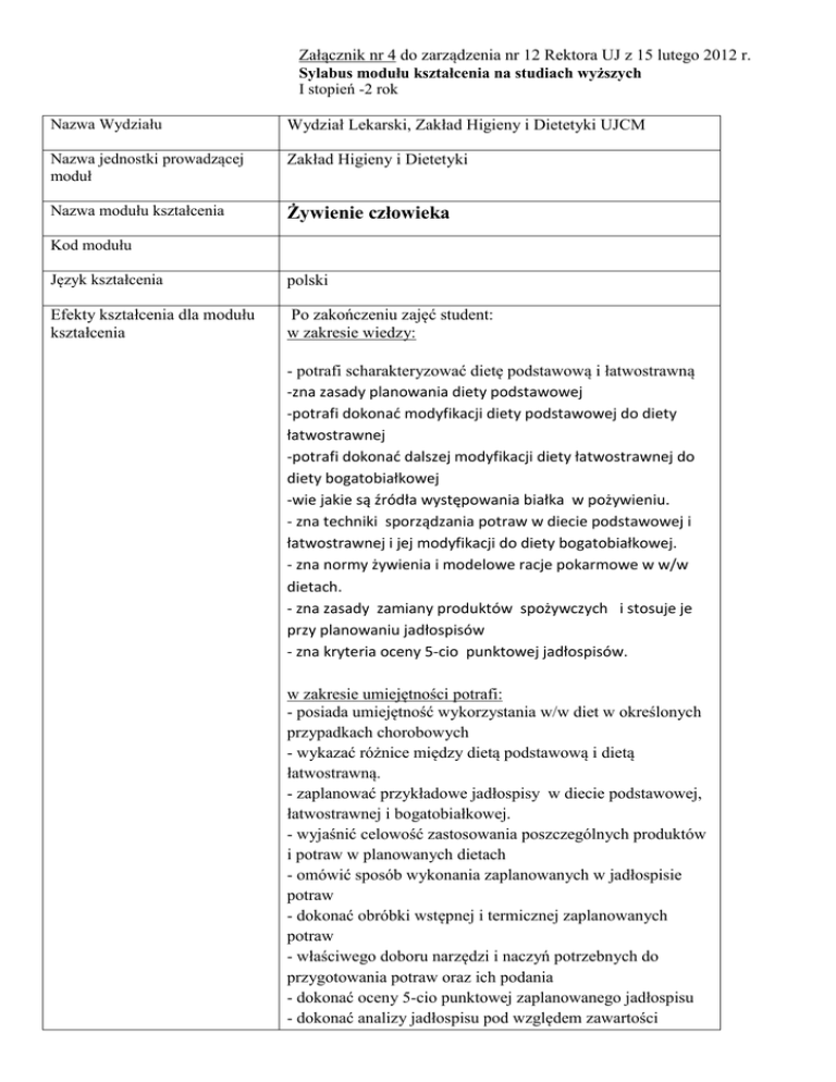 Załącznik nr 4 do zarządzenia nr 12 Rektora UJ z 15 lutego 2012 r. Sylabus modułu kształcenia na studiach wyższych I stopień -2 rok Nazwa Wydziału Wydział Lekarski, Zakład Higieny i Dietetyki UJCM Nazwa jednostki prowadzącej moduł Zakład Higieny i Dietetyki Nazwa modułu kształcenia Żywienie człowieka Kod modułu Język kształcenia polski Efekty kształcenia dla modułu kształcenia Po zakończeniu zajęć student: w zakresie wiedzy: - potrafi scharakteryzować dietę podstawową i łatwostrawną -zna zasady planowania diety podstawowej -potrafi dokonać modyfikacji diety podstawowej do diety łatwostrawnej -potrafi dokonać dalszej modyfikacji diety łatwostrawnej do diety bogatobiałkowej -wie jakie są źródła występowania białka w pożywieniu. - zna techniki sporządzania potraw w diecie podstawowej i łatwostrawnej i jej modyfikacji do diety bogatobiałkowej. - zna normy żywienia i modelowe racje pokarmowe w w/w dietach. - zna zasady zamiany produktów spożywczych i stosuje je przy planowaniu jadłospisów - zna kryteria oceny 5-cio punktowej jadłospisów. w zakresie umiejętności potrafi: - posiada umiejętność wykorzystania w/w diet w określonych przypadkach chorobowych - wykazać różnice między dietą podstawową i dietą łatwostrawną. - zaplanować przykładowe jadłospisy w diecie podstawowej, łatwostrawnej i bogatobiałkowej. - wyjaśnić celowość zastosowania poszczególnych produktów i potraw w planowanych dietach - omówić sposób wykonania zaplanowanych w jadłospisie potraw - dokonać obróbki wstępnej i termicznej zaplanowanych potraw - właściwego doboru narzędzi i naczyń potrzebnych do przygotowania potraw oraz ich podania - dokonać oceny 5-cio punktowej zaplanowanego jadłospisu - dokonać analizy jadłospisu pod względem zawartości Typ modułu kształcenia (obowiązkowy/fakultatywny) składników odżywczych oraz ich strat spowodowanych obróbką wstępną i termiczną produktów. w zakresie kompetencji społecznych: -jest świadomy celowości stosowania poszczególnych diet w określonych jednostkach chorobowych - posiada umiejętność właściwej organizacji pracy podczas przygotowywania posiłków - dba o racjonalne gospodarowanie produktami spożywczymi. - dba o bezpieczeństwo i higienę podczas przygotowywania potraw Obowiązkowy do zaliczenia roku Rok studiów 2 Semestr 3i4 Imię i nazwisko osoby/osób prowadzących moduł dr hab. Małgorzata Bała dr Jadwiga Helbin, dr Wojciech Szot mgr Joanna Zając, mgr Teresa Krzeszowska-Rosiek Imię i nazwisko osoby/osób egzaminującej/egzaminujących bądź udzielającej zaliczenia, w przypadku gdy nie jest to osoba prowadząca dany moduł Sposób realizacji dr hab. Małgorzata Bała Zajęcia wymagające bezpośredniego udziału nauczyciela akademickiego i studentów. Wymagania wstępne i dodatkowe Rodzaj i liczba godzin zajęć dydaktycznych wymagających bezpośredniego udziału nauczyciela akademickiego i studentów, gdy w danym module przewidziane są takie zajęcia wykłady: 6 godz. seminaria: 8 godz. ćwiczenia: 16godz. Liczba punktów ECTS przypisana modułowi 3pkt ECTS Bilans punktów ECTS Udział w wykładach Udział w seminariach Udział w ćwiczeniach Przygotowanie do planowania diet a w konsekwencji gotowania-14 godz. Przygotowanie do zaliczenia na ocenę – 16 godz. Łącznie 60 godz. nakładu pracy studenta. Stosowane metody dydaktyczne Stosowane metody dydaktyczne stanowią połączenie metod podających (wykład problemowy oraz wykład konwersatoryjny) z metodami aktywizującymi (metoda przypadków, seminaria, dyskusja dydaktyczna związana z wykładem, okrągłego stołu, wielokrotna, burza mózgów, panelowa). Na zajęciach w celu rozwinięcia problemu stosowane są również metody programowe (z użyciem komputera) oraz metody praktyczne (pokaz, seminarium). Metody sprawdzania i kryteria oceny efektów kształcenia uzyskanych przez studentów ( egzam. ustny/egzam. testowy/zaliczenie na ocenę) Forma i warunki zaliczenia modułu, w tym zasady dopuszczenia do egzaminu, zaliczenia, a także forma i warunki zaliczenia poszczególnych zajęć wchodzących w zakres danego modułu Treści modułu kształcenia Moduł ten kończy się egzaminem po ukończonych wszystkich zajęciach. Formą sprawdzenia efektów kształcenia są ćwiczenia praktyczne na komputerach z wykorzystaniem programu żywieniowego, dyskusja na dany temat, praktyczne gotowanie . Zajęcia odbywają się w formie wykładów, seminariów i ćwiczeń. Wszystkie przewidziane harmonogramem seminaria i ćwiczenia powinny być zaliczone w grupach ustalonych przez Dziekanat. W uzasadnionych przypadkach możliwe jest zaliczenie ćwiczeń w formie ustnej u asystenta prowadzącego dany temat. Warunkiem zaliczenia ćwiczeń i seminarium jest aktywny udział w zajęciach oraz oddanie analizy witamin i składników mineralnych w konkretnej diecie wraz z wyciągniętymi wnioskami. Warunkiem dopuszczenia do pisania testu końcowego jest zaliczenie wszystkich przewidzianych harmonogramem ćwiczeń. W przypadku braku zaliczenia jakiegokolwiek ćwiczenia, student traci możliwość pisania testu w pierwszym terminie. Zaliczenie na ocenę ma formę testu jednokrotnego wyboru składającego się z 60 pytań. Warunkiem zaliczenia testu jest udzielenie minimum 65% poprawnych odpowiedzi. Jeśli student otrzyma ocenę niedostateczną z testu, musi zdawać go w drugim terminie. W ramach wykładów i seminarium realizowane są następujące treści: Wykłady: Założenia diety łatwo strawnej. Dieta łatwostrawna i jej modyfikacje: dieta łatwostrawna o zmienionej konsystencji: papkowata, płynna, dieta kleikowa; dieta łatwostrawna z ograniczeniem substancji pobudzających wydzielanie soku żołądkowego; dieta łatwostrawna z ograniczeniem tłuszczu; dieta o kontrolowanej zawartości kwasów tłuszczowych; dieta ubogo energetyczna, dieta łatwostrawna bogato-białkowa, dieta łatwostrawna niskobiałkowa, dieta z ograni