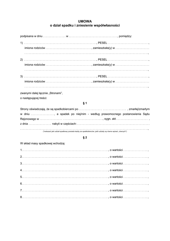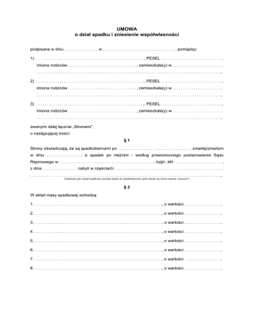 UMOWA o dział spadku i zniesienie współwłasności podpisana w dniu . . . . . . . . . . . . . . . . w . . . . . . . . . . . . . . . . . . . . . . . . . . . . . . . . . . , pomiędzy: 1) . . . . . . . . . . . . . . . . . . . . . . . . . . . . . . . . . . . . . . . . . . . . . . . . . . ., PESEL . . . . . . . . . . . . . . . . . . . . . . . . . . . . ., imiona rodziców . . . . . . . . . . . . . . . . . . . . . . . . . . . . . . . . , zamieszkała(y) w . . . . . . . . . . . . . . . . . . . . . . . . . . . . . . . . . . . . . . . . . . . . . . . . . . . . . . . . . . . . . . . . . . . . . . . . . . . . . . . . . . . . . . . . . . . . . . . . . . . . . . . . . . . . . . ., 2) . . . . . . . . . . . . . . . . . . . . . . . . . . . . . . . . . . . . . . . . . . . . . . . . . . ., PESEL . . . . . . . . . . . . . . . . . . . . . . . . . . . . ., imiona rodziców . . . . . . . . . . . . . . . . . . . . . . . . . . . . . . . . , zamieszkała(y) w . . . . . . . . . . . . . . . . . . . . . . . . . . . . . . . . . . . . . . . . . . . . . . . . . . . . . . . . . . . . . . . . . . . . . . . . . . . . . . . . . . . . . . . . . . . . . . . . . . . . . . . . . . . . . . ., 3) . . . . . . . . . . . . . . . . . . . . . . . . . . . . . . . . . . . . . . . . . . . . . . . . . . ., PESEL . . . . . . . . . . . . . . . . . . . . . . . . . . . . ., imiona rodziców . . . . . . . . . . . . . . . . . . . . . . . . . . . . . . . . , zamieszkała(y) w . . . . . . . . . . . . . . . . . . . . . . . . . . . . . . . . . . . . . . . . . . . . . . . . . . . . . . . . . . . . . . . . . . . . . . . . . . . . . . . . . . . . . . . . . . . . . . . . . . . . . . . . . . . . . . ., zwanymi dalej łącznie „Stronami”, o następującej treści: §1 Strony oświadczają, że są spadkobiercami po . . . . . . . . . . . . . . . . . . . . . . . . . . . . . . . . , zmarłej/zmarłym w dniu . . . . . . . . . . . . . . . . , a spadek po niej/nim - według prawomocnego postanowienia Sądu Rejonowego w . . . . . . . . . . . . . . . . . . . . . . . . . . . . . . . . . . . . . . . . . . . ., sygn. akt . . . . . . . . . . . . . . . . . . . . . . , z dnia . . . . . . . . . . . . . . . . nabyli w częściach: . . . . . . . . . . . . . . . . . . . . . . . . . . . . . . . . . . . . . . . . . . . . . . . . . . . . . . . . . . . . . . . . . . . . . . . . . . . . . . . . . . . . . . . . . . . . . . . . . . . . . . . . . . . . . . . . . . . . . . . . . . . . . . . . . . . . . . . . . . . . ., (*wskazać jaki udział spadkowy posiada każdy ze spadkobierców; jeśli udziały są równe wpisać „równych”) §2 W skład masy spadkowej wchodzą: 1. . . . . . . . . . . . . . . . . . . . . . . . . . . . . . . . . . . . . . . . . . . . . . . . . . . . . . . . . . . . ., o wartości . . . . . . . . . . . . . . . . . , 2. . . . . . . . . . . . . . . . . . . . . . . . . . . . . . . . . . . . . . . . . . . . . . . . . . . . . . . . . . . . ., o wartości . . . . . . . . . . . . . . . . . , 3. . . . . . . . . . . . . . . . . . . . . . . . . . . . . . . . . . . . . . . . . . . . . . . . . . . . . . . . . . . . ., o wartości . . . . . . . . . . . . . . . . . , 4. . . . . . . . . . . . . . . . . . . . . . . . . . . . . . . . . . . . . . . . . . . . . . . . . . . . . . . . . . . . ., o wartości . . . . . . . . . . . . . . . . . , 5. . . . . . . . . . . . . . . . . . . . . . . . . . . . . . . . . . . . . . . . . . . . . . . . . . . . . . . . . . . . ., o wartości . . . . . . . . . . . . . . . . . , 6. . . . . . . . . . . . . . . . . . . . . . . . . . . . . . . . . . . . . . . . . . . . . . . . . . . . . . . . . . . . ., o wartości . . . . . . . . . . . . . . . . . , 7. . . . . . . . . . . . . . . . . . . . . . . . . . . . . . . . . . . . . . . . . . . . . . . . . . . . . . . . . . . . ., o wartości . . . . . . . . . . . . . . . . . , 8. . . . . . . . . . . . . . . . . . . . . . . . . . . . . . . . . . . . . . . . . . . . . . . . . . . . . . . . . . . . ., o wartości . . . . . . . . . . . . . . . . . , §3 Strony dokonują działu spadku i zniesienia współwłasności po . . . . . . . . . . . . . . . . . . . . . . . . . . . . . . . . w ten sposób, że: 1. składnik wskazany w § 2 pkt 1 nabywa w całości . . . . . . . . . . . . . . . . . . . . . . . . . . . . . . . . . . . . . . . . . . .; strony dokonują zniesienia współwłasności w ten sposób, że wyżej wymieniony staje się jego wyłącznym właścicielem. 2. składnik wskazany w § 2 pkt 2 nabywa w całości . . . . . . . . . . . . . . . . . . . . . . . . . . . . . . . . . . . . . . . . . . .; strony dokonują zniesienia współwłasności w ten sposób, że wyżej wymieniony staje się jego wyłącznym właścicielem. 3. składnik wskazany w § 2 pkt 3 nabywa w całości . . . . . . . . . . . . . . . . . . . . . . . . . . . . . . . . . . . . . . . . . . .; strony dokonują zniesienia współwłasności w ten sposób, że wyżej wymieniony staje się jego wyłącznym właścicielem. 4. składnik wskazany w § 2 pkt 4 nabywa w całości . . . . . . . . . . . . . . . . . . . . . . . . . . . . . . . . . . . . . . . . . . .; strony dokonują zniesienia współwłasności w ten sposób, że wyżej wymieniony staje się jego wyłącznym właścicielem. 5. składnik wskazany w § 2 pkt 5 nabywa w całości . . . . . . . . . . . . . . . . . . . . . . . . . . . . . . . . . . . . . . . . . . .; strony dokonują zniesienia współwłasności w ten sposób, że wyżej wymieniony staje się jego wyłącznym właścicielem. 6. składnik wskazany w § 2 pkt 6 nabywa w całości . . . . . . . . . . . . . . . . . . . . . . . . . . . . . . . . . . . . . . . . . . .; strony dokonują zniesienia współwłasności w ten sposób, że wyżej wymieniony staje się jego wyłącznym właścicielem. 7. składnik wskazany w § 2 pkt 7 nabywa w całości . . . . . . . . . . . . . . . . . . . . . . . . . . . . . . . . . . . . . . . . . . .; strony dokonują zniesienia współwłasności w ten sposób, że wyżej wymie