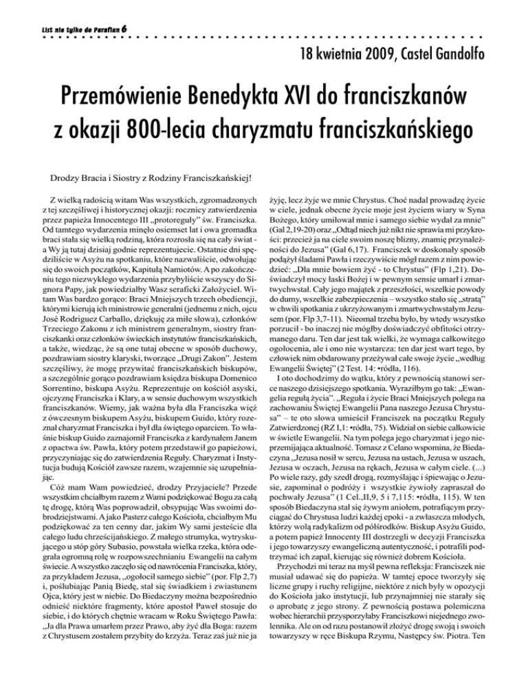 List nie tylko do Parafia Parafiann 6 ............. . . ...................................... . . . 18 kwietnia 2009, Castel Gandolfo Przemówienie Benedykta XVI do franciszkanów z okazji 800-lecia charyzmatu franciszkańskiego Drodzy Bracia i Siostry z Rodziny Franciszkañskiej! Z wielk¹ radoœci¹ witam Was wszystkich, zgromadzonych z tej szczêœliwej i historycznej okazji: rocznicy zatwierdzenia przez papie¿a Innocentego III „protoregu³y” œw. Franciszka. Od tamtego wydarzenia minê³o osiemset lat i owa gromadka braci sta³a siê wielk¹ rodzin¹, która rozros³a siê na ca³y œwiat a Wy j¹ tutaj dzisiaj godnie reprezentujecie. Ostatnie dni spêdziliœcie w Asy¿u na spotkaniu, które nazwaliœcie, odwo³uj¹c siê do swoich pocz¹tków, Kapitu³¹ Namiotów. A po zakoñczeniu tego niezwyk³ego wydarzenia przybyliœcie wszyscy do Signora Papy, jak powiedzia³by Wasz seraficki Za³o¿yciel. Witam Was bardzo gor¹co: Braci Mniejszych trzech obediencji, którymi kieruj¹ ich ministrowie generalni (jednemu z nich, ojcu José Rodriguez Carballo, dziêkujê za mi³e s³owa), cz³onków Trzeciego Zakonu z ich ministrem generalnym, siostry franciszkanki oraz cz³onków œwieckich instytutów franciszkañskich, a tak¿e, wiedz¹c, ¿e s¹ one tutaj obecne w sposób duchowy, pozdrawiam siostry klaryski, tworz¹ce „Drugi Zakon”. Jestem szczêœliwy, ¿e mogê przywitaæ franciszkañskich biskupów, a szczególnie gor¹co pozdrawiam ksiêdza biskupa Domenico Sorrentino, biskupa Asy¿u. Reprezentuje on koœció³ asyski, ojczyznê Franciszka i Klary, a w sensie duchowym wszystkich franciszkanów. Wiemy, jak wa¿na by³a dla Franciszka wiêŸ z ówczesnym biskupem Asy¿u, biskupem Guido, który rozezna³ charyzmat Franciszka i by³ dla œwiêtego oparciem. To w³aœnie biskup Guido zaznajomi³ Franciszka z kardyna³em Janem z opactwa œw. Paw³a, który potem przedstawi³ go papie¿owi, przyczyniaj¹c siê do zatwierdzenia Regu³y. Charyzmat i Instytucja buduj¹ Koœció³ zawsze razem, wzajemnie siê uzupe³niaj¹c. Có¿ mam Wam powiedzieæ, drodzy Przyjaciele? Przede wszystkim chcia³bym razem z Wami podziêkowaæ Bogu za ca³¹ tê drogê, któr¹ Was poprowadzi³, obsypuj¹c Was swoimi dobrodziejstwami. A jako Pasterz ca³ego Koœcio³a, chcia³bym Mu podziêkowaæ za ten cenny dar, jakim Wy sami jesteœcie dla ca³ego ludu chrzeœcijañskiego. Z ma³ego strumyka, wytryskuj¹cego u stóp góry Subasio, powsta³a wielka rzeka, która odegra³a ogromn¹ rolê w rozpowszechnianiu Ewangelii na ca³ym œwiecie. A wszystko zaczê³o siê od nawrócenia Franciszka, który, za przyk³adem Jezusa, „ogo³oci³ samego siebie” (por. Flp 2,7) i, poœlubiaj¹c Pani¹ Biedê, sta³ siê œwiadkiem i zwiastunem Ojca, który jest w niebie. Do Biedaczyny mo¿na bezpoœrednio odnieœæ niektóre fragmenty, które aposto³ Pawe³ stosuje do siebie, i do których chêtnie wracam w Roku Œwiêtego Paw³a: „Ja dla Prawa umar³em przez Prawo, aby ¿yæ dla Boga: razem z Chrystusem zosta³em przybity do krzy¿a. Teraz zaœ ju¿ nie ja ¿yjê, lecz ¿yje we mnie Chrystus. Choæ nadal prowadzê ¿ycie w ciele, jednak obecne ¿ycie moje jest ¿yciem wiary w Syna Bo¿ego, który umi³owa³ mnie i samego siebie wyda³ za mnie” (Gal 2,19-20) oraz „Odt¹d niech ju¿ nikt nie sprawia mi przykroœci: przecie¿ ja na ciele swoim noszê blizny, znamiê przynale¿noœci do Jezusa” (Gal 6,17). Franciszek w doskona³y sposób pod¹¿y³ œladami Paw³a i rzeczywiœcie móg³ razem z nim powiedzieæ: „Dla mnie bowiem ¿yæ - to Chrystus” (Flp 1,21). Doœwiadczy³ mocy ³aski Bo¿ej i w pewnym sensie umar³ i zmartwychwsta³. Ca³y jego maj¹tek z przesz³oœci, wszelkie powody do dumy, wszelkie zabezpieczenia – wszystko sta³o siê „strat¹” w chwili spotkania z ukrzy¿owanym i zmartwychwsta³ym Jezusem (por. Flp 3,7-11). Nieomal trzeba by³o, by wtedy wszystko porzuci³ - bo inaczej nie móg³by doœwiadczyæ obfitoœci otrzymanego daru. Ten dar jest tak wielki, ¿e wymaga ca³kowitego ogo³ocenia, ale i ono nie wystarcza: ten dar jest wart tego, by cz³owiek nim obdarowany prze¿ywa³ ca³e swoje ¿ycie „wed³ug Ewangelii Œwiêtej” (2 Test. 14: •ród³a, 116). I oto dochodzimy do w¹tku, który z pewnoœci¹ stanowi serce naszego dzisiejszego spotkania. Wyrazi³bym go tak: „Ewangelia regu³¹ ¿ycia”. „Regu³a i ¿ycie Braci Mniejszych polega na zachowaniu Œwiêtej Ewangelii Pana naszego Jezusa Chrystusa” – te oto s³owa umieœci³ Franciszek na pocz¹tku Regu³y Zatwierdzonej (RZ I,1: •ród³a, 75). Widzia³ on siebie ca³kowicie w œwietle Ewangelii. Na tym polega jego charyzmat i jego nieprzemijaj¹ca aktualnoœæ. Tomasz z Celano wspomina, ¿e Biedaczyna „Jezusa nosi³ w sercu, Jezusa na ustach, Jezusa w uszach, Jezusa w oczach, Jezusa na rêkach, Jezusa w ca³ym ciele. (...) Po wiele razy, gdy szed³ drog¹, rozmyœlaj¹c i œpiewaj¹c o Jezusie, zapomina³ o podró¿y i wszystkie ¿ywio³y zaprasza³ do pochwa³y Jezusa” (1 Cel.,II,9, 5 i 7,115: •ród³a, 115). W ten sposób Biedaczyna sta³ siê ¿ywym anio³em, potrafi¹cym przyci¹gaæ do Chrystusa ludzi ka¿dej epoki - a zw³aszcza m³odych, którzy wol¹ radykalizm od pó³œrodków. Biskup Asy¿u Guido, a potem papie¿ Innocenty III dostrzegli w decyzji Franciszka i jego towarzyszy ewangeliczn¹ autentycznoœæ, i potrafili podtrzymaæ ich zapa³, kieruj¹c siê równie¿ dobrem Koœcio³a. Przychodzi mi teraz na myœl pewna refleksja: Franciszek nie musia³ udawaæ siê do papie¿a. W tamtej epoce tworzy³y siê liczne grupy i ruchy religijne, niektóre z nich by³y w opozycji do Koœcio³a jako instytucji, lub przynajmniej nie stara³y siê o aprobatê z jego strony. Z pewnoœci¹ postawa polemiczna wobec hierarchii przysporzy³aby Franciszkowi niejednego zwolennika. Ale on od razu postanowi³ z³o¿yæ drogê swoj¹ i swoich towarzyszy w rêce Biskupa Rzymu, Nastêpcy œw. Piotra. Ten List nie tylko d
