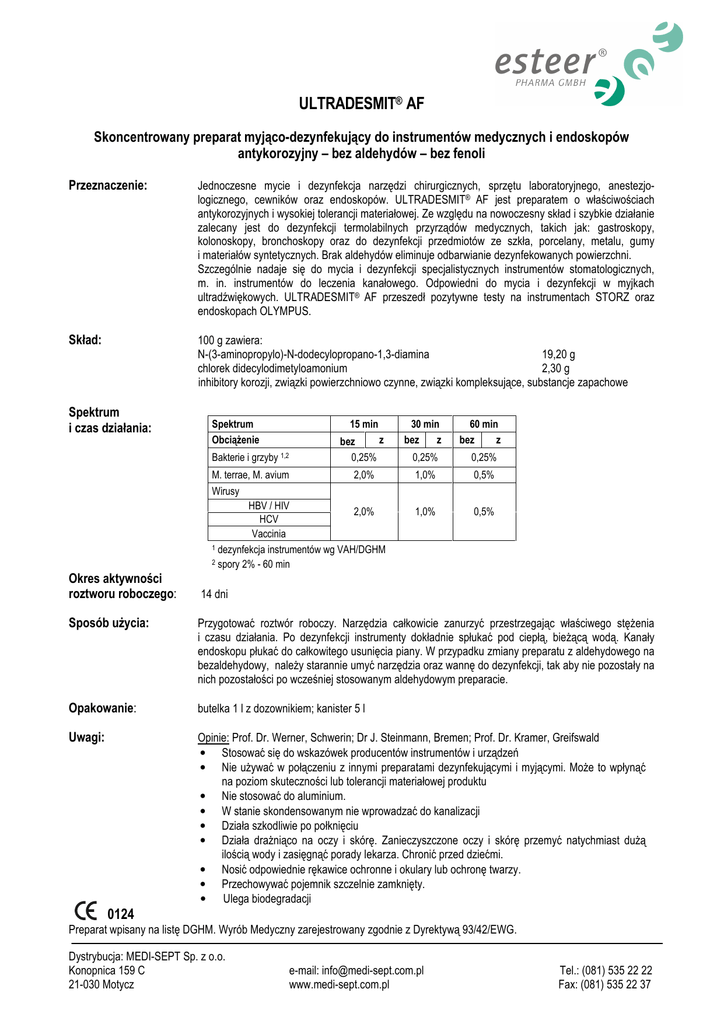 ULTRADESMIT® AF Skoncentrowany preparat myjąco-dezynfekujący do instrumentów medycznych i endoskopów antykorozyjny – bez aldehydów – bez fenoli Przeznaczenie: Jednoczesne mycie i dezynfekcja narzędzi chirurgicznych, sprzętu laboratoryjnego, anestezjologicznego, cewników oraz endoskopów. ULTRADESMIT® AF jest preparatem o właściwościach antykorozyjnych i wysokiej tolerancji materiałowej. Ze względu na nowoczesny skład i szybkie działanie zalecany jest do dezynfekcji termolabilnych przyrządów medycznych, takich jak: gastroskopy, kolonoskopy, bronchoskopy oraz do dezynfekcji przedmiotów ze szkła, porcelany, metalu, gumy i materiałów syntetycznych. Brak aldehydów eliminuje odbarwianie dezynfekowanych powierzchni. Szczególnie nadaje się do mycia i dezynfekcji specjalistycznych instrumentów stomatologicznych, m. in. instrumentów do leczenia kanałowego. Odpowiedni do mycia i dezynfekcji w myjkach ultradźwiękowych. ULTRADESMIT® AF przeszedł pozytywne testy na instrumentach STORZ oraz endoskopach OLYMPUS. Skład: 100 g zawiera: N-(3-aminopropylo)-N-dodecylopropano-1,3-diamina 19,20 g chlorek didecylodimetyloamonium 2,30 g inhibitory korozji, związki powierzchniowo czynne, związki kompleksujące, substancje zapachowe Spektrum i czas działania: Spektrum Obciążenie Bakterie i grzyby 1,2 15 min z bez 0,25% M. terrae, M. avium 2,0% Wirusy HBV / HIV 2,0% HCV Vaccinia 1 dezynfekcja instrumentów wg VAH/DGHM 2 spory 2% - 60 min Okres aktywności roztworu roboczego: 30 min bez z 60 min bez z 0,25% 0,25% 1,0% 0,5% 1,0% 0,5% 14 dni Sposób użycia: Przygotować roztwór roboczy. Narzędzia całkowicie zanurzyć przestrzegając właściwego stężenia i czasu działania. Po dezynfekcji instrumenty dokładnie spłukać pod ciepłą, bieżącą wodą. Kanały endoskopu płukać do całkowitego usunięcia piany. W przypadku zmiany preparatu z aldehydowego na bezaldehydowy, należy starannie umyć narzędzia oraz wannę do dezynfekcji, tak aby nie pozostały na nich pozostałości po wcześniej stosowanym aldehydowym preparacie. Opakowanie: butelka 1 l z dozownikiem; kanister 5 l Uwagi: Opinie: Prof. Dr. Werner, Schwerin; Dr J. Steinmann, Bremen; Prof. Dr. Kramer, Greifswald • Stosować się do wskazówek producentów instrumentów i urządzeń • Nie używać w połączeniu z innymi preparatami dezynfekującymi i myjącymi. Może to wpłynąć na poziom skuteczności lub tolerancji materiałowej produktu • Nie stosować do aluminium. • W stanie skondensowanym nie wprowadzać do kanalizacji • Działa szkodliwie po połknięciu • Działa drażniąco na oczy i skórę. Zanieczyszczone oczy i skórę przemyć natychmiast dużą ilością wody i zasięgnąć porady lekarza. Chronić przed dziećmi. • Nosić odpowiednie rękawice ochronne i okulary lub ochronę twarzy. • Przechowywać pojemnik szczelnie zamknięty. • Ulega biodegradacji 0124 Preparat wpisany na listę DGHM. Wyrób Medyczny zarejestrowany zgodnie z Dyrektywą 93/42/EWG. Dystrybucja: MEDI-SEPT Sp. z o.o. Konopnica 159 C 21-030 Motycz e-mail: [email protected] www.medi-sept.com.pl Tel.: (081) 535 22 22 Fax: (081) 535 22 37