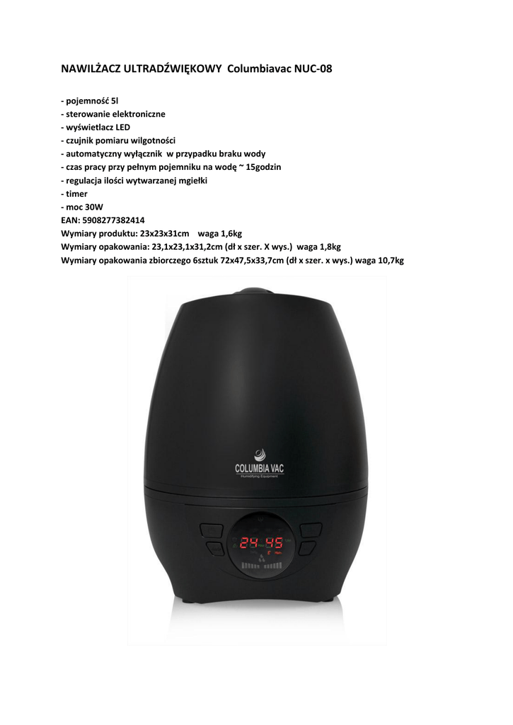 NAWILŻACZ ULTRADŹWIĘKOWY Columbiavac NUC-08 - pojemność 5l - sterowanie elektroniczne - wyświetlacz LED - czujnik pomiaru wilgotności - automatyczny wyłącznik w przypadku braku wody - czas pracy przy pełnym pojemniku na wodę ~ 15godzin - regulacja ilości wytwarzanej mgiełki - timer - moc 30W EAN: 5908277382414 Wymiary produktu: 23x23x31cm waga 1,6kg Wymiary opakowania: 23,1x23,1x31,2cm (dł x szer. X wys.) waga 1,8kg Wymiary opakowania zbiorczego 6sztuk 72x47,5x33,7cm (dł x szer. x wys.) waga 10,7kg