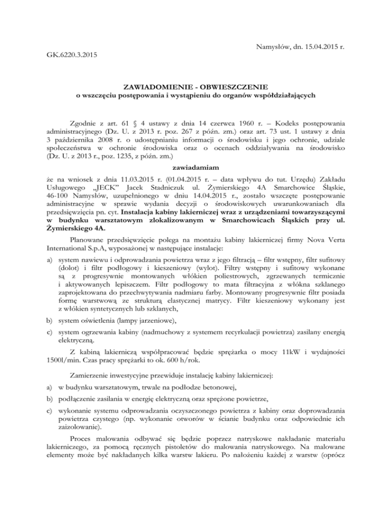 Namysłów, dn. 15.04.2015 r. GK.6220.3.2015 ZAWIADOMIENIE - OBWIESZCZENIE o wszczęciu postępowania i wystąpieniu do organów współdziałających Zgodnie z art. 61 § 4 ustawy z administracyjnego (Dz. U. z 2013 r. poz. 3 października 2008 r. o udostępnianiu społeczeństwa w ochronie środowiska (Dz. U. z 2013 r., poz. 1235, z późn. zm.) dnia 14 czerwca 1960 r. – Kodeks postępowania 267 z późn. zm.) oraz art. 73 ust. 1 ustawy z dnia informacji o środowisku i jego ochronie, udziale oraz o ocenach oddziaływania na środowisko zawiadamiam że na wniosek z dnia 11.03.2015 r. (01.04.2015 r. – data wpływu do tut. Urzędu) Zakładu Usługowego „JECK” Jacek Stadniczuk ul. Żymierskiego 4A Smarchowice Śląskie, 46-100 Namysłów, uzupełnionego w dniu 14.04.2015 r., zostało wszczęte postępowanie administracyjne w sprawie wydania decyzji o środowiskowych uwarunkowaniach dla przedsięwzięcia pn. cyt. Instalacja kabiny lakierniczej wraz z urządzeniami towarzyszącymi w budynku warsztatowym zlokalizowanym w Smarchowicach Śląskich przy ul. Żymierskiego 4A. Planowane przedsięwzięcie polega na montażu kabiny lakierniczej firmy Nova Verta International S.p.A, wyposażonej w następujące instalacje: a) system nawiewu i odprowadzania powietrza wraz z jego filtracją – filtr wstępny, filtr sufitowy (dolot) i filtr podłogowy i kieszeniowy (wylot). Filtry wstępny i sufitowy wykonane są z progresywnie montowanych włókien poliestrowych, zgrzewanych termicznie i aktywowanych lepiszczem. Filtr podłogowy to mata filtracyjna z włókna szklanego zaprojektowana do przechwytywania nadmiaru farby. Montowany progresywnie filtr posiada formę warstwową ze strukturą elastycznej matrycy. Filtr kieszeniowy wykonany jest z włókien syntetycznych lub szklanych, b) system oświetlenia (lampy jarzeniowe), c) system ogrzewania kabiny (nadmuchowy z systemem recyrkulacji powietrza) zasilany energią elektryczną. Z kabiną lakierniczą współpracować będzie sprężarka o mocy 11kW i wydajności 1500l/min. Czas pracy sprężarki to ok. 600 h/rok. Zamierzenie inwestycyjne przewiduje instalację kabiny lakierniczej: a) w budynku warsztatowym, trwale na podłodze betonowej, b) podłączenie zasilania w energię elektryczną oraz sprężone powietrze, c) wykonanie systemu odprowadzania oczyszczonego powietrza z kabiny oraz doprowadzania powietrza czystego (np. wykonanie otworów w ścianie budynku oraz odpowiednie ich zaizolowanie). Proces malowania odbywać się będzie poprzez natryskowe nakładanie materiału lakierniczego, za pomocą ręcznych pistoletów do malowania natryskowego. Na malowane elementy może być nakładanych kilka warstw lakieru. Po nałożeniu każdej z warstw (oprócz ostatniej), wyrób poddawany będzie czyszczeniu w celu zwiększenia przyczepności kolejnej nakładanej warstwy lakieru. Przed nałożeniem lakieru na element, stosowane będą także szpachla oraz podkład (finisz). Przedsięwzięcie zlokalizowane na działce nr 77/1 obręb ewidencyjny 0055 Smarchowice Śląskie, ul. Żymierskiego 4A, stanowiącej własność Państwa Jacek i Aneta Stadniczuk ul. (dane usunięte), (dane usunięte). Planowane przedsięwzięcie zakwalifikowano do kategorii przedsięwzięć, o których mowa w § 3 ust. 1 pkt 14 - rozporządzenia Rady Ministrów z dnia 9 listopada 2010 r. w sprawie przedsięwzięć mogących znacząco oddziaływać na środowisko (Dz. U. z 2010 r. Nr 213 poz. 1397 z późn. zm.). Decyzje o środowiskowych uwarunkowaniach dla w/w przedsięwzięcia wydaje się po uzgodnieniu z Regionalnym Dyrektorem Ochrony Środowiska w Opolu oraz Państwowym Powiatowym Inspektorem Sanitarnym w Namysłowie. W związku z powyższym, zgodnie z art. 64 ust. 1 ustawy z dnia 3 października 2008 r. o udostępnianiu informacji o środowisku oraz o ocenach oddziaływania na środowisko (Dz. U. z 2013 r., poz. 1235, z późn. zm.), informuję o wystąpieniu do organów współdziałających. Informuję o możliwości składania uwag i wniosków w siedzibie Urzędu Miejskiego w Namysłowie w Wydziale Gospodarki Komunalnej i Inwestycji bud. B, pokój nr 17, w terminie do 21 dni od dnia ogłoszenia niniejszego zawiadomienia. Dokumentacja w powyższej sprawie znajduje się w siedzibie Urzędu Miejskiego w Namysłowie przy ulicy Stanisława Dubois 3, Wydział Gospodarki Komunalnej i Inwestycji pok. Nr 17. Sprawę prowadzi: Aleksander Polan tel. 77/419 03 46, e-mail [email protected] Wydział Gospodarki Komunalnej i Inwestycji Urzędu Miejskiego w Namysłowie Z up. Burmistrza /-/ Roman Kania