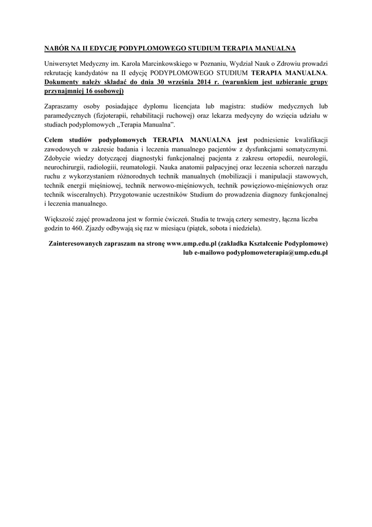 NABÓR NA II EDYCJĘ PODYPLOMOWEGO STUDIUM TERAPIA MANUALNA Uniwersytet Medyczny im. Karola Marcinkowskiego w Poznaniu, Wydział Nauk o Zdrowiu prowadzi rekrutację kandydatów na II edycję PODYPLOMOWEGO STUDIUM TERAPIA MANUALNA. Dokumenty należy składać do dnia 30 września 2014 r. (warunkiem jest uzbieranie grupy przynajmniej 16 osobowej) Zapraszamy osoby posiadające dyplomu licencjata lub magistra: studiów medycznych lub paramedycznych (fizjoterapii, rehabilitacji ruchowej) oraz lekarza medycyny do wzięcia udziału w studiach podyplomowych ,,Terapia Manualna”. Celem studiów podyplomowych TERAPIA MANUALNA jest podniesienie kwalifikacji zawodowych w zakresie badania i leczenia manualnego pacjentów z dysfunkcjami somatycznymi. Zdobycie wiedzy dotyczącej diagnostyki funkcjonalnej pacjenta z zakresu ortopedii, neurologii, neurochirurgii, radiologiii, reumatologii. Nauka anatomii palpacyjnej oraz leczenia schorzeń narządu ruchu z wykorzystaniem różnorodnych technik manualnych (mobilizacji i manipulacji stawowych, technik energii mięśniowej, technik nerwowo-mięśniowych, technik powięziowo-mięśniowych oraz technik wisceralnych). Przygotowanie uczestników Studium do prowadzenia diagnozy funkcjonalnej i leczenia manualnego. Większość zajęć prowadzona jest w formie ćwiczeń. Studia te trwają cztery semestry, łączna liczba godzin to 460. Zjazdy odbywają się raz w miesiącu (piątek, sobota i niedziela). Zainteresowanych zapraszam na stronę www.ump.edu.pl (zakładka Kształcenie Podyplomowe) lub e-mailowo [email protected]