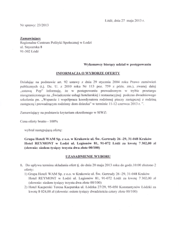 INFORMACJA O WYBORZE OFERTY Hotel REYMONT w Łodzi ul