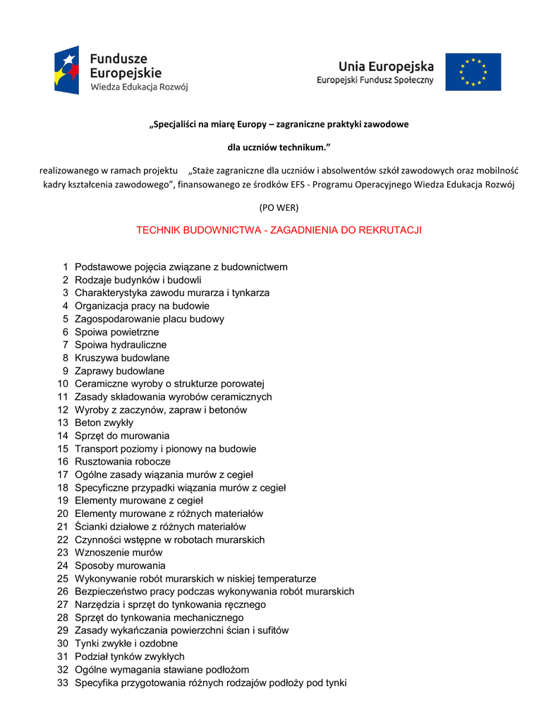 „Specjaliści na miarę Europy – zagraniczne praktyki zawodowe dla uczniów technikum.” realizowanego w ramach projektu „Staże zagraniczne dla uczniów i absolwentów szkół zawodowych oraz mobilnośd kadry kształcenia zawodowego”, finansowanego ze środków EFS - Programu Operacyjnego Wiedza Edukacja Rozwój (PO WER) TECHNIK BUDOWNICTWA - ZAGADNIENIA DO REKRUTACJI 1 2 3 4 5 6 7 8 9 10 11 12 13 14 15 16 17 18 19 20 21 22 23 24 25 26 27 28 29 30 31 32 33 Podstawowe pojęcia związane z budownictwem Rodzaje budynków i budowli Charakterystyka zawodu murarza i tynkarza Organizacja pracy na budowie Zagospodarowanie placu budowy Spoiwa powietrzne Spoiwa hydrauliczne Kruszywa budowlane Zaprawy budowlane Ceramiczne wyroby o strukturze porowatej Zasady składowania wyrobów ceramicznych Wyroby z zaczynów, zapraw i betonów Beton zwykły Sprzęt do murowania Transport poziomy i pionowy na budowie Rusztowania robocze Ogólne zasady wiązania murów z cegieł Specyficzne przypadki wiązania murów z cegieł Elementy murowane z cegieł Elementy murowane z różnych materiałów Ścianki działowe z różnych materiałów Czynności wstępne w robotach murarskich Wznoszenie murów Sposoby murowania Wykonywanie robót murarskich w niskiej temperaturze Bezpieczeństwo pracy podczas wykonywania robót murarskich Narzędzia i sprzęt do tynkowania ręcznego Sprzęt do tynkowania mechanicznego Zasady wykańczania powierzchni ścian i sufitów Tynki zwykłe i ozdobne Podział tynków zwykłych Ogólne wymagania stawiane podłożom Specyfika przygotowania różnych rodzajów podłoży pod tynki 34 35 36 37 38 39 40 41 42 43 44 45 46 47 48 49 50 Warunki przystąpienia do robót tynkowych Ręczne wykonywanie tynków zwykłych Wyznaczanie lica powierzchni tynków Wykonywanie obrzutki, narzutu i gładzi Specyfika wykonanania poszczególnych rodzajów tynków zwykłych Wykańczanie tynków Tynki ciągnione Specyfika wykonywania tynków gipsowych Wykonywanie tynków z zapraw z żywic syntetycznych Mechaniczne wykonywanie tynków zwykłych Wykonywanie tynków specjalnych Tynki ozdobne Bezpieczeństwo pracy podczas wykonywania robót tynkarskich Okładziny z cegieł i płyt ceramicznych Okładziny z kamienia Spoinowanie Ocieplanie ścian metodą "lekką-mokrą" Opracował mgr inż. Witold AMBICKI