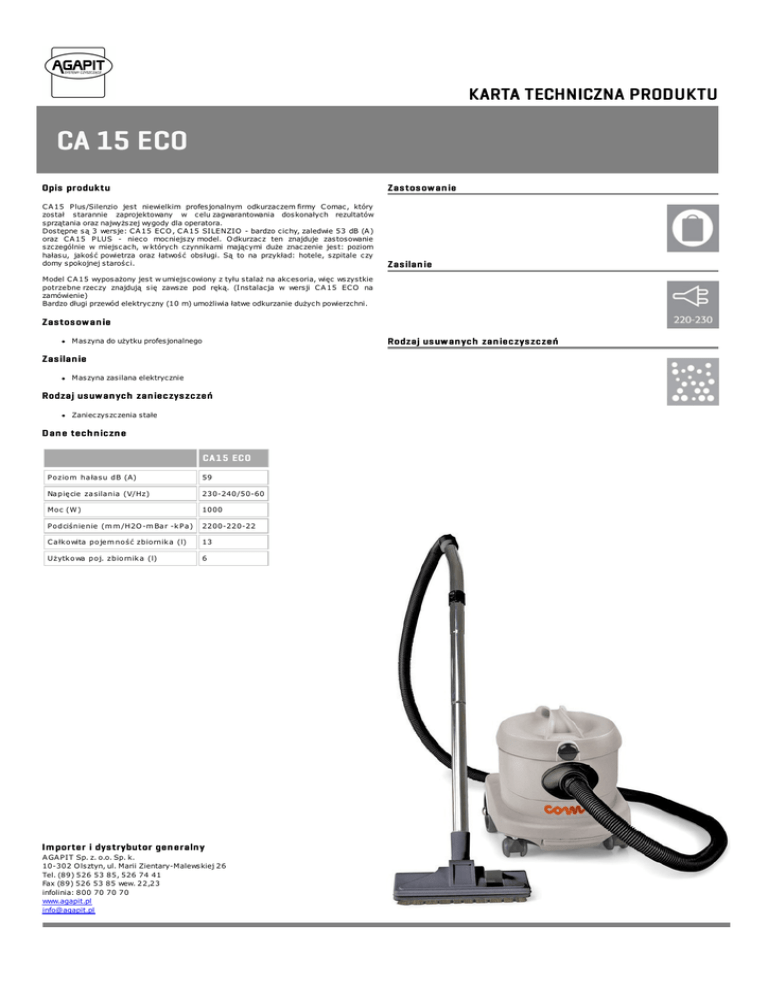 KARTA TECHNICZNA PRODUKTU CA 15 ECO Opis produk tu Zas tos ow an ie CA 15 Plus/Silenzio jest niewielkim profesjonalnym odkurzaczem firmy Comac, który został starannie zaprojektowany w celu zagwarantowania doskonałych rezultatów sprzątania oraz najwyższej wygody dla operatora. Dostępne są 3 wersje: CA 15 ECO , CA 15 SILENZIO - bardzo cichy, zaledwie 53 dB (A ) oraz CA 15 PLUS - nieco mocniejszy model. O dkurzacz ten znajduje zastosowanie szczególnie w miejscach, w których czynnikami mającymi duże znaczenie jest: poziom hałasu, jakość powietrza oraz łatwość obsługi. Są to na przykład: hotele, szpitale czy domy spokojnej starości. Zas ilan ie Model CA 15 wyposażony jest w umiejscowiony z tyłu stalaż na akcesoria, więc wszystkie potrzebne rzeczy znajdują się zawsze pod ręką. (Instalacja w wersji CA 15 ECO na zamówienie) Bardzo długi przewód elektryczny (10 m) umożliwia łatwe odkurzanie dużych powierzchni. Zas tos ow an ie Rodzaj us uw an yc h zan ie c zys zc ze ń Maszyna do użytku profesjonalnego Zas ilan ie Maszyna zasilana elektrycznie Rodzaj us uw an yc h zan ie c zys zc ze ń Zanieczyszczenia stałe D an e te c h n ic zn e C A 1 5 EC O Poziom hałasu dB (A) 59 Napięcie zasilania (V/Hz) 230-240/50-60 Moc (W ) 1000 Podciśnienie (m m /H2O -m Bar -k Pa) 2200-220-22 Całk owita pojem ność zbiornik a (l) 13 Użytk owa poj. zbiornik a (l) 6 I m porte r i dys trybutor ge n e raln y A GA PIT Sp. z. o.o. Sp. k. 10-302 O lsztyn, ul. Marii Zientary-Malewskiej 26 Tel. (89) 526 53 85, 526 74 41 Fax (89) 526 53 85 wew. 22,23 infolinia: 800 70 70 70 www.agapit.pl [email protected]
