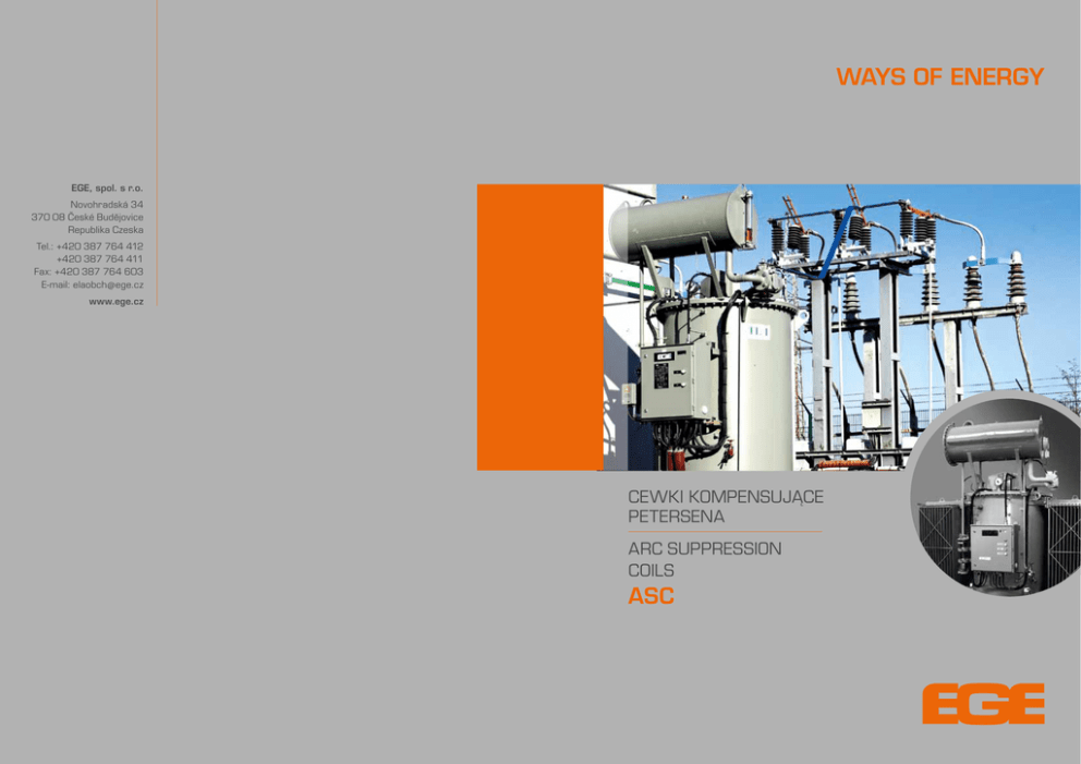 WAYS OF ENERGY EGE, spol. s r.o. Novohradská 34 370 08 České Budějovice Republika Czeska Tel.: +420 387 764 412 +420 387 764 411 Fax: +420 387 764 603 E-mail: [email protected] www.ege.cz CEWKI KOMPENSUJĄCE PETERSENA arc SUPPRESSION COILS ASC BOBINA PETERSEN ARC SUPPRESSION COILS CEWKI KOMPENSUJĄCE PRĄDY ZIEMNOZWARCIOWE Cewki Petersena służą do kompensacji prądu pojemnościowego podczas zwarć doziemnych w sieciach elektroenergetycznch. Aby spełniać swoją rolę muszą zostać włączone pomiędzy punktem neutralnym /zerowym/ transformatora a ziemią. Każdy projekt wykonywany jest jako indywidualny projekt według wymagań klienta. Parametry podsawowe niezbędne podczas projektowania zawarte są w poniższej tabeli. ARC SUPPRESSION COILS /ASC/ Arc suppression coils are used for capacitive current compensation during earth faults in electric networks. They are to be connected between the neutral transformer point and the ground. The below mentioned data provide customers with basic information about how EGE´s arc suppression coils are designed. The standard ASC design can be modified upon customer’s requirements. Dane podstawowe Napięcie znamionowe: 6/√3 do 110/√3 kV Moc znamionowa: 125 kVA - 19 000 kVA Częstotliwość znamionowa: 50 Hz Praca: – krótkotrwała /KB - 2 godziny/ – ciągła /DB/ Zakres prądowy: 10 - 100% In Basic data Rated voltage: 6/√3 up to 110/√3 kV Rated power: 125 kVA - 19 000 kVA Rated frequency: 50 Hz Duty: – short time /KB - 2h/ – continuous duty /DB/ Current range: 10 - 100 % In Konstrukcja i wyposażenie • Izolatory zgodne z wymogami norm DIN, EN albo głowice typu Euromold Kadź i podstawa: - s talowa kadź bez radiatorów w wykonaniu przeznaczonym do pracy krótkotrwałej - s talowa kadź z radiatorami w wykonaniu przeznaczonym do pracy ciągłej - uchwyty do podnoszenia kompletnego zespołu - uchwyty do podnoszenie części wewnętrznej /aktywnej/ - radiatory zgodne z wymaganiami normy DIN 42559 z przepustnicami /z zaworami dławiącymi do wykonania przeznaczonego do pracy ciągłej/ - wolna skrzynka termometru wykonana zgodnie z normą DIN 42554 - podstawa wyposażona w kółka z obrzeżami przystosowanymi do szyn lub gładkie do przesuwania w dwóch kierunkach, wraz ze zderzakami - z aciski uziemiające spełniające wymagania normy DIN 48088-B-M12 Zawory: - z awór olejowy – do napełniania i opróżniania kadzi – typu A31 OR zgodny z wymaganiami normy EN 50216-4 - z awór do pobierania próbek oleju typu DN15 zgodny z wymaganiami normy DIN 42568 Konserwator: - zbiornik służący do przejmowania nadmaru oleju, spełnia wymagania normy DIN 42553 - D • Osuszacz • Silnik napędowy z wyposażeniem 230 / 400 V, 50 Hz • Olej transformatorowy firmy Nynas Zabezpieczenie antykorozyjne: - elementy stalowe ocynkowane - powłoka ochronna - śruby, podkładki i nakrętki wystawione na oddziaływanie środowiska zewnętrznego wykonane ze stali nierdzewnej A2 • Typ chłodzenia: ONAN Design and equipment • Bushings in compliance with DIN, EN standard or Euromold type Tank and base: - steel tank without radiators for short-time operation - steel tank with radiators for continuous operation - lugs used for lifting of a complete unit - lifting lugs on the tank cover to lift out the inner part /active part/ - r adiators in accordance with DIN 42559 with throttles /for continuous duty/ - free thermometer case according to DIN 42554 - base with 4 adjustable /90°/ smooth or rail wheels for movement in both directions, wheels with wheel stops - 4 grounding terminals according to DIN 48088-B-M12 Valves: - oil valve for filling and oil draining - type A31 OR according to EN 50216-4 - oil sampling valve DN15 according to DIN 42568 Expansion tank /conservator/: - r emovable with filling neck made in accordance with the DIN 42553 – D standard and with oil valve A22 OR • Air breather • Motor drive unit 230/400 V, 50 Hz • Transformer oil Nynas Anticorrosion protection: - zinc coating of steel parts - paint coat - A2 stainless steel for screws, washers and nuts exposed to outdoor environment • Type of cooling ONAN Uzwojenia pomocnicze oraz przyrządy monitorujące • Uzwojenie wtórne 500 V +/-10% • Uzwojenie pomiarowe 100 V +/-10%, 3 A • Pomiarowy przekładnik prądowy • Przekaźnik Buchholza zgodny z wymaganiami normy DIN 42566 • Magnetyczny wskaźnik poziomu oleju ze stykami sygnałowymi • Wziernik szklany do wizualizacji kontroli poziomu oleju • Termometr ze wskaźnikiem i stykami sygnałowymi • Termostat • Termometr rezystancyjny /termopara/ Pt 100 AKCESORIA DODATKOWE Firma EGE oferuje następujące akcesoria: - Wskaźnik prądu dławika typu DU - Wskaźnik napięcia U0 - Sterownik cewek kompensujący prądy zwarciowe - Regulowany automatycznie zespół zabezpieczenia cewek kompensujących prądy zwarciowe - Zespół zabezpieczenia automatycznego włączający rezystor bocznikowy - Chłodzony powietrzem rezystor albo rezystor umieszczony w zbiorniku z olejem do podnoszenia wartości składowej czynnej prądu SERWIS, NAPRAWY Firma EGE zapewnia pełen serwis, począwszy od odbioru aż po remont generalny wszystkich przez siebie produkowanych urządzeń. Auxiliary windings and monitoring instruments • Secondary power winding 500 V+/- 10 %, 10 % of rated power • Measuring winding 100 V +/- 10 %, 3 A • Measuring current transformer • Double-float Buchholz Relay according to DIN 42566 • Magnetic oil-level indicator with signal contacts • Glass oil-level indicator • Thermometer with indicator and signal contacts • Thermostat • Resistance thermometer Pt 100 ADDITIONAL ACCESSORIES EGE offers accessories as follows: - ASC current indicator - type DU - Uo voltage indicator - Arc suppression coil controller - Providing arc suppression coil automatic adjustment - Providing automatic switching on of a shunt resistor - A ir cooled resistor or resistor placed in a tank with oil used to increase the watt