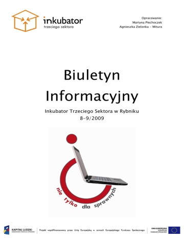 Opracowanie: Martyna Piechoczek Agnieszka Zielonka - Mitura Biuletyn Informacyjny Inkubator Trzeciego Sektora w Rybniku 8-9/2009 TYTUŁEM WSTĘPU… Przedstawiamy Państwu kolejny numer Biuletynu Informacyjnego, w którym znajdą Państwo informacje na temat aktualnych konkursów oraz ciekawych inicjatyw podejmowanych przez organizacje współpracujące z Inkubatorem Trzeciego Sektora w Rybniku. Z PIERWSZEJ RĘKI dowiecie się Państwo o zagadnieniach związanych z ekonomią społeczną i prezentujemy projektami wyniki dla osób konkursu niepełnosprawnych. sieciującego, W jednocześnie zakładce gratulując WARTE UWAGI organizacjom z naszego inkubatora, które pokazały, Ŝe RAZEM MOśNA WIĘCEJ! Z pozdrowieniami, Zespół Inkubatora Trzeciego Sektora Z PIERWSZEJ PIERWSZEJ RĘKI EKONOMIA SPOŁECZNA (czasem określana jako gospodarka społeczna) to ogół podmiotów wykazujących róŜnego rodzaju aktywność gospodarczą, której celem jest rozwój wspólnot lokalnych, zwłaszcza poprzez dawanie pracy osobom wykluczonym społecznie. Inaczej mówiąc ekonomia społeczna jest szczególnym sektorem ekonomii rynkowej. Nie odrzuca mechanizmów typu prawo popytu i podaŜy, nie kwestionuje zdroworozsądkowej konkurencji, nie zwalcza myślenia w kategoriach biznesplanu. OdróŜnia ją jedna kwestia – jest nastawiona na przynoszenie korzyści całej społeczności lokalnej lub określonej grupie społecznej, mającej małe szanse na tzw. wolnym rynku (np. długotrwale bezrobotnym, niepełnosprawnym lub bezdomnym). Liczy się filozofia działania – podmiot ekonomii społecznej działa dla osiągnięcia jakiegoś celu społecznego (czy będzie to rozwój małej wsi w oparciu o turystykę, aktywizacja społeczna kilkudziesięciu niepełnosprawnych umysłowo czy produkcja paneli słonecznych przez grupę byłych bezdomnych na potrzeby lokalnej społeczności – jest juŜ kwestią konkretnych potrzeb). Zysk jest tylko narzędziem pozwalającym realizować ten cel, nie jest celem samym w sobie. Na obecnym etapie obserwujemy zatem powstawania podmiotów ekonomii społecznej oparte na projektach finansowanych w ramach PO KL, FIO i innych. Podmiotów tych jest ich zatem ciągle niewiele i pozostaje mieć nadzieję, Ŝe ich problemy, które realnie istnieją staną się powodem do zmian w obszarze prawa i polityki. Mamy nadzieję, Ŝe istniejące spółdzielnie socjalne są awangardą, która zmieni cały rynek. Stowarzyszenie na rzecz wspomagania osób niepełnosprawnych i ich otoczenia „Razem” wraz z Fundacją Ekoterm Silesia i Stowarzyszeniem OLIGOS wkrótce rozpocznie realizację projektu „Naucz mnie a będę samodzielnie pracować. Aktywizacja zawodowo - społeczna osób niepełnosprawnych intelektualnie”. Projekt ma na celu edukację zawodową osób niepełnosprawnych intelektualnie. Co umoŜliwi im samodzielne wejście w dorosłe Ŝycie. Od listopada bieŜącego roku Centrum Rozwoju Inicjatyw Społecznych CRIS wraz ze Stowarzyszeniem Teatr Grodzki z Bielska Białej rozpoczyna realizację projektu „Akcja na rzecz spraw waŜnych”. Celem tego projektu będzie promowanie podmiotów ekonomii społecznej oraz wypracowanie modelu handlu przedmiotami wytwarzanymi prze WTZ i ZAZ. Projektem kierowanym do osób niepełnosprawnych, równieŜ realizowanym przez CRIS jest „Nie tylko dla sprawnych”, którego logotyp stał się graficznym motywem przewodnim tego numeru biuletynu. Projekt ten jest współfinansowany przez Unię Europejska ze środków Europejskiego Funduszu Społecznego w ramach Programu operacyjnego Kapitał Ludzki. Program pomyślany jest tak, aby osoby niepełnosprawne, które podejmują pierwsze działania zmierzające do aktywizacji zawodowej i te, które jeszcze nie widzą szans dla siebie na rynku pracy mogły uzyskać wsparcie, poprzez uczestnictwo w dopasowanych do swoich potrzeb oraz zapotrzebowania pracodawców szkoleniach zawodowych, poprzedzonych poradnictwem zawodowym i psychologicznym. Na program „Nie tylko dla sprawnych” składają się uzupełniające się wzajemnie działania aktywizujące zmierzające z jednej strony do pogłębienia przez beneficjentów wiedzy na temat swoich mocnych stron, poznania swoich predyspozycji i umiejętności, a z drugiej strony zdobycia wiedzy o rynku pracy, sposobach poruszania się po nim i prawach niepełnosprawnych, nabycia umiejętności obsługi komputera i urządzeń biurowych oraz poznania zagadnień ekonomii społecznej. W ramach proponowanego cyklu szkoleń odbywać się będą zajęcia indywidualne i grupowe prowadzone w oparciu o metodę hiszpańską sprawdzoną w pracy z osobami o określonych deficytach, pozwalającą w sposób niedyrektywny wypracować indywidualne wizje aktywności zawodowej. Z myślą o dotarciu do zainteresowanych osób niepełnosprawnych nie mogących bezpośrednio uczestniczyć w zajęciach, szkolenia dostępne będą w wersji elektronicznej w formie kursów e-learningowych. Beneficjentami programu „Nie tylko dla sprawnych” są równieŜ organizacje działające na rzecz osób niepełnosprawnych. Oprócz ich cyklicznych spotkań, przewidziane jest równieŜ kompleksowe wsparcie organizacji pozarządowych, poprzez takie działania jak m.in. poradnictwo księgowe i prawne oraz konsultacje dotyczące funkcjonowania tychŜe organizacji. WARTE UWAGI! Konkurs sieciujący RAZEM MOśNA WIĘCEJ! rozstrzygnięty! Serdecznie gratulujemy wszystkim Inkubatorom, które wzięły udział i wygrały realizację programu telewizyjnego w TVP Katowice. Przypominamy, Ŝe konkurs był kierowany do wszystkich inkubatorów i ich organizacji skupionych w projekcie „Osiemnastka w sieci – porozumienie inkubatorów organizacji pozarządowych” , a dotyczył podjęcia przez ITS i organizacje inicjatywy na rzecz mieszkańców i promowania III sektora, które realizowałyby ideę „Razem moŜna więcej”. PoniŜej przedstawiamy inicjatywy, które wygrały. Kolejność prezentacji jest taka, jak kolejność z