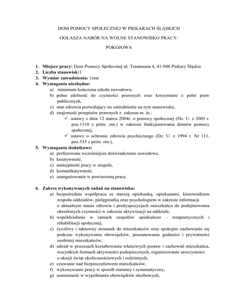 DOM POMOCY SPOŁECZNEJ W PIEKARACH ŚLĄSKICH OGŁASZA NABÓR NA WOLNE STANOWISKO PRACY: POKOJOWA Miejsce pracy: Dom Pomocy Społecznej ul. Trautmana 4, 41-946 Piekary Śląskie Liczba stanowisk:1 Wymiar zatrudnienia: 1etat Wymagania niezbędne: a) minimum kończona szkoła zawodowa, b) pełna zdolność do czynności prawnych oraz korzystanie z pełni praw publicznych, c) stan zdrowia pozwalający na zatrudnienie na tym stanowisku, d) znajomość przepisów prawnych z zakresu m. in.: ustawy z dnia 12 marca 2004r. o pomocy społecznej (Dz. U. z 2005 r. poz.1310 z późn. zm.) w zakresie funkcjonowania domów pomocy społecznej, ustawy o ochronie zdrowia psychicznego (Dz. U. z 1994 r. Nr 111, poz.535 z późn. zm.), 5. Wymagania dodatkowe: a) preferowane wcześniejsze doświadczenie zawodowe, b) kreatywność, c) umiejętność pracy w zespole, d) komunikatywność, e) zaangażowanie w powierzoną pracę. 1. 2. 3. 4. 6. Zakres wykonywanych zadań na stanowisku: a) bezpośrednia współpraca ze starszą opiekunką, opiekunami, kierownikiem zespołu oddziałów, pielęgniarką oraz psychologiem w zakresie informacji o aktualnym stanie zdrowia i predyspozycjach mieszkańca do podejmowania określonych czynności w zakresie aktywizacji na oddziale, b) współdziałanie w ramach zespołów opiekuńczo – terapeutycznych i rehabilitacji społecznej, c) życzliwy i taktowny stosunek do mieszkańców oraz spokojne zachowanie się podczas wykonywania obowiązków, poszanowanie godności i prywatności osobistej mieszkańców, d) udział w procesach kształtowania właściwych postaw i zachowań mieszkańca, wszystkich formach aktywności podopiecznych, organizowanie uroczystości z okazji świąt okolicznościowych i rodzinnych, e) czuwanie nad bezpieczeństwem mieszkańców, f) wykonywanie pracy w sposób staranny i systematyczny, g) sumienność w wypełnianiu obowiązków służbowych, h) systematyczne i prawidłowe prowadzenie dokumentacji w zakresie Indywidualnego Planu Wsparcia mieszkańca, i) dokonywanie systematycznych obchodów wszystkich pokoi mieszkańców podczas zmiany nocnej, ze szczególnym zwróceniem uwagi na ciężko chorych, j) udzielanie mieszkańcom pomocy przy zaspokajaniu potrzeb fizjologicznych, wykonywaniu czynności higienicznych, k) utrzymywanie czystości w zakresie: mycia okien w pomieszczeniach, mycie żyrandoli, kinkietów pod nadzorem konserwatora, utrzymanie w czystości podłóg we wszystkich pomieszczeniach, mycie pomieszczeń sanitarnych, kafelek ściennych i podłogowych oraz sanitariatów, ścieranie kurzu i mycie szaf, szafek, półek i innych mebli wyposażeniowych, utrzymanie porządku i czystości wewnątrz wszystkich szaf, szafek i schowków na pościel, w tapczanach i sofach, wymiana bielizny pościelowej i osobistej mieszkańców i zanoszenie do pralni oraz przynoszenie jej z pralni, pomaganie mieszkańcom w praniu w pralce znajdującej się na oddziale i w suszeniu bielizny, wynoszenie śmieci, dbanie o powierzony sprzęt, oszczędne i racjonalne korzystanie ze środków czystości i dezynfekcji, ł) przestrzeganie obowiązującego reżimu sanitarno – higienicznego. l) przestrzeganie tajemnicy zawodowej, przepisów BHP i p. poż., m) przestrzeganie obowiązujących procedur oraz Regulaminu Pracy, n) wykonywanie innych poleceń przełożonych nie ujętych w niniejszym zakresie wykonywanych zadań, poleceń wynikających z przygotowania zawodowego 7. Wymagane dokumenty: a) CV b) list motywacyjny, c) kserokopie dokumentów potwierdzających wykształcenie (świadectwa, dyplomy), d) kserokopie dokumentów potwierdzających doświadczenie zawodowe, Dokumenty takie, jak CV i list motywacyjny powinny być podpisane i opatrzone klauzulą: Wyrażam zgodę na przetwarzanie danych osobowych zawartych w ofercie pracy dla potrzeb niezbędnych do realizacji procesu rekrutacji (zgodnie z ustawą z dnia29 sierpnia 1997 r. o ochronie danych osobowych, Dz. U. z 2016 r. poz 922 z poźn. zm.). 8. Miejsce pracy: Stanowisko pracy w siedzibie DPS, praca w systemie trzyzmianowym w godzinach 600 – 1400, 1400 – 2200, 2200 - 600 9.Termin i miejsce składania dokumentów: Wymagane dokumenty aplikacyjne należy składać osobiście w sekretariacie Domu Pomocy Społecznej w Piekarach Śląskich ul. Trautmana 4 z adnotacją : „ Dotyczy naboru na stanowisko pokojowej” w terminie do 21.10.2016r. do godz. 10.00. Informacje telefoniczne można uzyskać w sekretariacie Domu pod numerem telefonu 32 287 92 63. Informacja o wyniku naboru będzie umieszczona na tablicy ogłoszeń w Domu Pomocy Społecznej w Piekarach Śląskich ul Trautmana 4 oraz na stronie internetowej Biuletynu Informacji Publicznej – http://biuletyn.abip.pl/dps_trautmana/ Dokumenty, które wpłyną po wyżej określonym terminie, niekompletne lub niespełniające wymogów formalnych określonych w ogłoszeniu nie będą rozpatrywane. Oferty osób niezatrudnionych w wyniku naboru zostaną zniszczone po jego zakończeniu Dyrektor Domu Pomocy Społecznej w Piekarach Śląskich Barbara Jambor Piekary Śląskie 12.10.2016r.