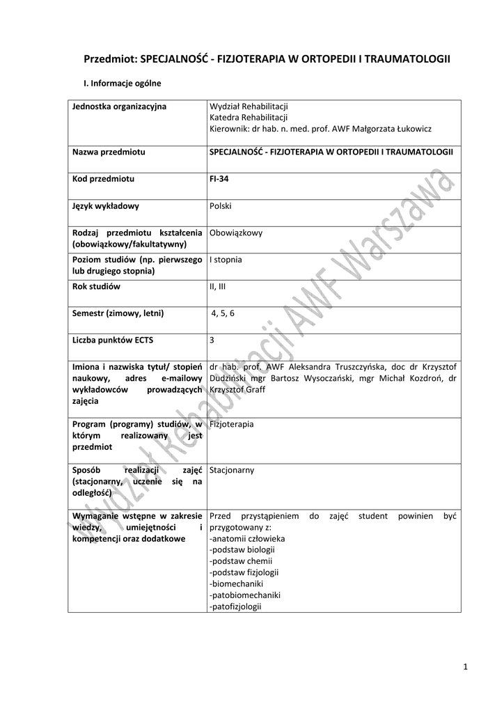 SPECJALNOŚĆ - FIZJOTERAPIA W ORTOPEDII I TRAUMATOLOGII