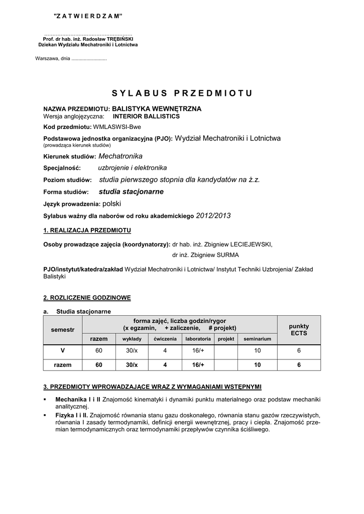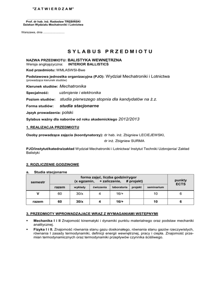 "Z A T W I E R D Z A M” ……………………………………………… Prof. dr hab. inż. Radosław TRĘBIŃSKI Dziekan Wydziału Mechatroniki i Lotnictwa 3333333333993333333399 Warszawa, dnia .......................... SYLABUS PRZEDMIOTU NAZWA PRZEDMIOTU: BALISTYKA WEWNĘTRZNA Wersja anglojęzyczna: INTERIOR BALLISTICS Kod przedmiotu: WMLASWSI-Bwe Podstawowa jednostka organizacyjna (PJO): Wydział Mechatroniki i Lotnictwa (prowadząca kierunek studiów) Kierunek studiów: Mechatronika Specjalność: uzbrojenie i elektronika Poziom studiów: studia pierwszego stopnia dla kandydatów na ż.z. Forma studiów: studia stacjonarne Język prowadzenia: polski Sylabus ważny dla naborów od roku akademickiego 2012/2013 1. REALIZACJA PRZEDMIOTU Osoby prowadzące zajęcia (koordynatorzy): dr hab. inż. Zbigniew LECIEJEWSKI, dr inż. Zbigniew SURMA PJO/instytut/katedra/zakład Wydział Mechatroniki i Lotnictwa/ Instytut Techniki Uzbrojenia/ Zakład Balistyki 2. ROZLICZENIE GODZINOWE a. Studia stacjonarne forma zajęć, liczba godzin/rygor (x egzamin, + zaliczenie, # projekt) semestr punkty ECTS razem wykłady ćwiczenia laboratoria V 60 30/x 4 16/+ 10 6 razem 60 30/x 4 16/+ 10 6 projekt seminarium 3. PRZEDMIOTY WPROWADZAJĄCE WRAZ Z WYMAGANIAMI WSTĘPNYMI Mechanika I i II Znajomość kinematyki i dynamiki punktu materialnego oraz podstaw mechaniki analitycznej. Fizyka I i II. Znajomość równania stanu gazu doskonałego, równania stanu gazów rzeczywistych, równania I zasady termodynamiki, definicji energii wewnętrznej, pracy i ciepła. Znajomość przemian termodynamicznych oraz termodynamiki przepływów czynnika ściśliwego. 4. ZAKŁADANE EFEKTY KSZTAŁCENIA Symbol W1 W2 U1 U2 U3 odniesienie do efektów kształcenia dla kierunku Efekty kształcenia Student, który zaliczył przedmiot, Ma wiedzę w zakresie mechaniki i termodynamiki podstawowych procesów zachodzących w przestrzeni zapociskowej lufy podczas strzału oraz w komorze spalania podczas pracy silnika rakietowego. Zna budowę oraz zasady działania układów miotających broni palnej oraz silników rakietowych na paliwo stałe i ciekłe. Potrafi pozyskiwać informacje z literatury, baz danych i innych źródeł w obszarze tematycznym związanym z przedmiotem; potrafi integrować uzyskane informacje, dokonywać ich interpretacji, a także wyciągać wnioski oraz formułować i uzasadniać opinie Potrafi zidentyfikować zjawiska fizyczne występujące w układach miotających broni palnej i w silniku rakietowym. K_W02 W_SW_5 K_U01 K_U08 Umie zaplanować doświadczenie polegające na wyznaczeniu głównych charakterystyk energetyczno-balistycznych stałego materiału miotającego i napędowego. Umie przeprowadzić analizę otrzymanych wyników doświadczenia. K_U17 5. METODY DYDAKTYCZNE Wykłady prowadzone głównie w formie audiowizualnej. Ćwiczenia audytoryjne związane z zagadnieniami omawianymi na wykładzie, obejmują przypomnienie, utrwalenie i usystematyzowanie wiedzy wcześniej nabytej, uzyskanej jako rezultat ukierunkowanej pracy własnej poprzez rozwiązywanie zadań i problemów. Ćwiczenia laboratoryjne ukierunkowano na wykonanie badań stałych materiałów miotających i napędowych oraz charakterystyk lufowych i rakietowych układów miotających. Seminarium prowadzone metodami aktywizującymi studentów, rozwijającymi u nich umiejętności korzystania z różnych źródeł wiedzy, selekcji i interpretacji informacji, przedstawiania prezentacji, formułowania wniosków, prowadzenia dyskusji, 6. TREŚCI PROGRAMOWE lp temat/tematyka zajęć liczba godzin wykł. ćwicz. 1 2 3 1 Rodzaje i właściwości stałych materiałów miotających (prochów). Wzór Noblego-Abela. Podstawowy wzór pirostatyki. 2 2 Pomiar ciepła spalania stałych materiałów miotających. 3 Równanie dopływu gazów prochowych. Geometryczne prawo spalania. Kształty ziaren prochowych. Prędkość spalania prochu. 2 4 Charakterystyki geometryczne ziaren prochowych. 2 5 Doświadczalne wyznaczenie podstawowych charakterystyk energetyczno-balistycznych prochu. 6 Budowa i zasada działania klasycznego układu miotającego broni palnej. Zjawisko strzału. Okresy strzału. Krzywe balistyczne. 7 8 5 proj. semin. 6 7 2 4 2 Tendencje rozwojowe w dziedzinie stałych materiałów miotających. Nietypowe układy miotające. 4 lab. 3 2 9 Bilans energii podczas strzału. Prace drugorzędne gazów prochowych. 2 10 Problem główny balistyki wewnętrznej (PGBW) broni lufowej. 2 11 Powylotowy okres strzału. 2 12 Niemilitarne zastosowania prochowych i innych układów miotających. 13 Obliczenia głównych charakterystyk strzału w klasycznym układzie miotającym. 14 Rozwiązanie eksperymentalne PGBW. 15 Skład i właściwości stałych i ciekłych paliw rakietowych. 2 16 Rodzaje oraz budowa i zasada działania silników rakietowych na paliwo stałe (srps) i na paliwo ciekłe (srpc). 2 17 Ciąg, impuls jednostkowy ciągu. 2 18 Pomiar impulsu jednostkowego ciągu silnika rakietowego. 19 Prawo szybkości spalania stałego paliwa rakietowego (spr). Funkcja ciśnieniowa. Funkcja erozyjna. Funkcja temperaturowa. 2 2 4 3 2 20 Tendencje rozwojowe w dziedzinie stałych paliw rakietowych. 3 21 Bilans masy gazów w komorze spalania srps. Samoregulacja ciśnienia w komorze spalania srps. 22 Wyznaczenie współczynników funkcji ciśnieniowej prawa szybkości spr. 23 Problem główny srps. 2 24 Przepływ gazów przez dyszę. 2 25 Projektowanie balistyczne silnika rakietowego na paliwo stałe. 26 Niemilitarne zastosowania srps oraz srpc. Razem w semestrze V 2 3 2 2 30 4 16 10 7. LITERATURA podstawowa: Z. Leciejewski, W. Sobczak, Z. Surma, „Balistyka wewnętrzna – ćwiczenia laboratoryjne”, S-54186 S. Torecki, „Balistyka wewnętrzna”, S-42926 S. Torecki, „Balistyka wewnętrzna silników rakietowych na paliwo stałe”, S-49201 uzupełniająca: S. Torecki, „Podstawy termodynamiczne balistyki wewnętrznej i silników rakietowych”, S-47523 S. Torecki –
