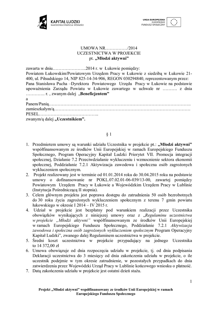 UMOWA NR……………/2014 UCZESTNICTWA W PROJEKCIE pt. „Młodzi aktywni” zawarta w dniu…………………..2014 r. w Łukowie pomiędzy: Powiatem Łukowskim/Powiatowym Urzędem Pracy w Łukowie z siedzibą w Łukowie 21400, ul. Piłsudskiego 14, NIP 825-14-34-906, REGON 030294840, reprezentowanym przez: Pana Stanisława Pucha –Dyrektora Powiatowego Urzędu Pracy w Łukowie na podstawie upoważnienia Zarządu Powiatu w Łukowie zawartego w uchwale nr ………. z dnia …………. r. , zwanym dalej „Beneficjentem” a Panem/Panią……………………………………………………………………………………. zamieszkałym/ą………………………………………………………………………………… PESEL………………………………….. zwanym/ą dalej „Uczestnikiem”. §1 1. Przedmiotem umowy są warunki udziału Uczestnika w projekcie pt.: „Młodzi aktywni” współfinansowanym ze środków Unii Europejskiej w ramach Europejskiego Funduszu Społecznego, Program Operacyjny Kapitał Ludzki Priorytet VII. Promocja integracji społecznej, Działanie 7.2 Przeciwdziałanie wykluczeniu i wzmocnienie sektora ekonomii społecznej, Poddziałanie 7.2.1 Aktywizacja zawodowa i społeczna osób zagrożonych wykluczeniem społecznym. 2. Projekt realizowany jest w terminie od 01.01.2014 roku do 30.04.2015 roku na podstawie umowy o dofinansowanie nr POKL.07.02.01-06-039/13-00, zawartej pomiędzy Powiatowym Urzędem Pracy w Łukowie a Wojewódzkim Urzędem Pracy w Lublinie (Instytucja Pośredniczącą II stopnia). 3. Celem głównym projektu jest poprawa dostępu do zatrudnienia 50 osób bezrobotnych do 30 roku życia zagrożonych wykluczeniem społecznym z terenu 7 gmin powiatu łukowskiego w okresie I 2014 – IV 2015 r. 4. Udział w projekcie jest bezpłatny pod warunkiem realizacji przez Uczestnika obowiązków wynikających z niniejszej umowy oraz z „Regulaminu uczestnictwa w projekcie „Młodzi aktywni” współfinansowanym ze środków Unii Europejskiej w ramach Europejskiego Funduszu Społecznego, Poddziałanie 7.2.1 Aktywizacja zawodowa i społeczna osób zagrożonych wykluczeniem społecznym Program Operacyjny Kapitał Ludzki”, zwanego dalej Regulaminem uczestnictwa w projekcie. 5. Średni koszt uczestnictwa w projekcie przypadający na jednego Uczestnika to 14 372,00 zł 6. Umowa obowiązuje od dnia rozpoczęcia udziału w projekcie, tj. od dnia podpisania Deklaracji uczestnictwa do 3 miesięcy od dnia zakończenia udziału w projekcie, o ile uczestnik podejmie w tym okresie zatrudnienie, w pozostałych przypadkach do dnia zatwierdzenia przez Wojewódzki Urząd Pracy w Lublinie końcowego wniosku o płatność. 7. Datą zakończenia udziału w projekcie jest ostatni dzień stażu. 1 Projekt „Młodzi aktywni” współfinansowany ze środków Unii Europejskiej w ramach Europejskiego Funduszu Społecznego 8. Biuro Projektu znajduje się w siedzibie Powiatowego Urzędu Pracy w Łukowie przy ul. Piłsudskiego 14, 21-400 Łuków. §2 1. Uczestnik uzyska wsparcie w postaci: 1) poradnictwa zawodowego (1 h/os.), 2) Indywidualnego Planu Działania, 3) szkolenia grupowego: ………….…………..………………………………………… ……..….., liczba godzin…………, 4) pośrednictwa pracy, 5) stażu trwającego 6 miesięcy. 2. Terminy przeprowadzenia wsparcia, o których mowa w ust. 1 zostaną ustalone w późniejszym terminie, o czym Uczestnik zostanie niezwłocznie poinformowany. §3 1. Beneficjent w ramach niniejszej umowy zobowiązuje się: 1) zapewnić Uczestnikom bezpłatny udział w projekcie, 2) informować o wszelkich zmianach mających wpływ na uczestnictwo w projekcie. 2. Uczestnik zobowiązuje się do: 1) aktywnego i regularnego uczestnictwa w każdym z działań przewidzianych dla Uczestnika wskazanych w § 2 ust. 1, do których zostanie zakwalifikowany, 2) rzetelnego przygotowywania się do działań w ramach projektu, 3) przestrzegania wyznaczonych terminów w każdym z działań, 4) każdorazowego potwierdzania swojego uczestnictwa w szkoleniu i stażu na listach obecności, 5) udziału w szkoleniach z co najmniej 80% frekwencją czasu trwania danego szkolenia, limit nieobecności ustala się w przeliczeniu na dni zajęć, 6) wypełniania ankiet ewaluacyjnych w trakcie uczestnictwa w projekcie oraz po jego zakończeniu, 7) informowania PUP o ewentualnych zmianach mających wpływ na udział w projekcie (np. wyjazd za granicę, podjęcie pracy, choroba, itp.), 8) dostarczenia kserokopii umowy o pracę (umowy o dzieło, umowy zlecenie) potwierdzonej za zgodność z oryginałem w przypadku podjęcia zatrudnienia lub innej pracy zarobkowej, złożenia oświadczenia o podjęciu działalności gospodarczej w trakcie realizacji wsparcia lub w okresie do 3 miesięcy od dnia zakończenia udziału w projekcie; podjęcie pracy lub działalności gospodarczej w trakcie realizacji ścieżki uczestnictwa w projekcie jest równoznaczne z zakończeniem udziału w projekcie z zastrzeżeniem § 4 ust. 11, 9) złożenia pisemnego oświadczenia w przypadku rezygnacji z udziału w projekcie (rezygnacja możliwa jest tylko w uzasadnionych przypadkach takich jak przyczyny zdrowotne lub inne niezależne od Uczestnika i nieznane Uczestnikowi w momencie przystąpienia do udziału w projekcie), 10) zwrotu kosztów szkolenia, jeśli z własnej winy nie ukończył szkolenia z wyjątkiem sytuacji, gdy powodem nieukończenia szkolenia w przypadku, gdy przyczyną nieukończenia szkolenia było podjęcie zatrudnienia, innej pracy zarobkowej lub działalności gospodarczej. 11) w przypadku nieuzasadnionej rezygnacji z udziału w projekcie Uczestnik zobowiązuje się zapłacić na rzecz Beneficjenta karę umowną, na którą składają się: a) wypłacone stypendium szkoleniowe, 2 Projekt „Młodzi aktywni” współfinansowany ze środków Unii Europejskiej w ramach Europejskiego Funduszu Społecznego b) wypłacone stypendiu