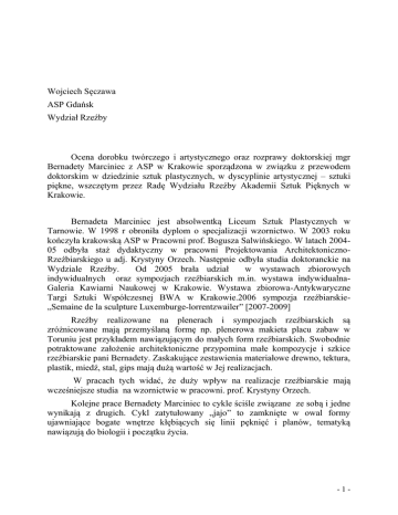 Wojciech Sęczawa ASP Gdańsk Wydział Rzeźby Ocena dorobku twórczego i artystycznego oraz rozprawy doktorskiej mgr Bernadety Marciniec z ASP w Krakowie sporządzona w związku z przewodem doktorskim w dziedzinie sztuk plastycznych, w dyscyplinie artystycznej – sztuki piękne, wszczętym przez Radę Wydziału Rzeźby Akademii Sztuk Pięknych w Krakowie. Bernadeta Marciniec jest absolwentką Liceum Sztuk Plastycznych w Tarnowie. W 1998 r obroniła dyplom o specjalizacji wzornictwo. W 2003 roku kończyła krakowską ASP w Pracowni prof. Bogusza Salwińskiego. W latach 200405 odbyła staż dydaktyczny w pracowni Projektowania ArchitektonicznoRzeźbiarskiego u adj. Krystyny Orzech. Następnie odbyła studia doktoranckie na Wydziale Rzeźby. Od 2005 brała udział w wystawach zbiorowych indywidualnych oraz sympozjach rzeźbiarskich m.in. wystawa indywidualnaGaleria Kawiarni Naukowej w Krakowie. Wystawa zbiorowa-Antykwaryczne Targi Sztuki Współczesnej BWA w Krakowie.2006 sympozja rzeźbiarskie„Semaine de la sculpture Luxemburge-lorrentzwailer” [2007-2009] Rzeźby realizowane na plenerach i sympozjach rzeźbiarskich są zróżnicowane mają przemyślaną formę np. plenerowa makieta placu zabaw w Toruniu jest przykładem nawiązującym do małych form rzeźbiarskich. Swobodnie potraktowane założenie architektoniczne przypomina małe kompozycje i szkice rzeźbiarskie pani Bernadety. Zaskakujące zestawienia materiałowe drewno, tektura, plastik, miedź, stal, gips mają dużą wartość w Jej realizacjach. W pracach tych widać, że duży wpływ na realizacje rzeźbiarskie mają wcześniejsze studia na wzornictwie w pracowni. prof. Krystyny Orzech. Kolejne prace Bernadety Marciniec to cykle ściśle związane ze sobą i jedne wynikają z drugich. Cykl zatytułowany „jajo” to zamknięte w owal formy ujawniające bogate wnętrze kłębiących się linii pęknięć i planów, tematyką nawiązują do biologii i początku życia. -1- Problematykę tą jeszcze raz porusza autorka w tryptyku zatytułowanym „pod wodą”. Na trzech płaszczyznach białej, czarnej i błękitnej przy użyciu drobnych kulek ,nitek, organicznych form z metalu komponuje plastyczną metaforę o początku istnienia Dwa kolejne obiekty p t. „Łapa I i II” to rzeźby z gipsu o niewielkich wymiarach około 20 cm sprawiają wrażenie monumentu, sposób rzeźbienia jak też zestawienia brył palców ukazują nam swobodę i odwagę i to że mamy do czynienia z osobą o dużej wrażliwości i wyczuciu proporcji. W obiekcie „Łapa II”, dodatkowo artystka użyła jutowego sznurka. Rzeźba jest okaleczona ma odcięte palce a sznurek z dużą siłą wżyna się w rękę ,pomiędzy palcami co potęguje dramatyzm i niepokój .Liczne pozostałe kompozycje , rzeźby, transformacje z tego okresu mają swoją duszę są przemyślane i prowokują do głębszego przeanalizowania, w swoim charakterze są bliskie.sobie. Zapoznanie się z pracami wcześniejszymi znacznie poprawiło mój dotychczasowy osąd, pozwoliło myślę na właściwy odbiór prac prezentowanych na przewodzie doktoranckim. Nadmienię jeszcze, że Bernadeta Marciniec z dużą swobodą i dobrym skutkiem posługuje się fotografią, gdzie prostym tematom potrafi nadać interesujący często abstrakcyjny charakter budzący ciekawość i zainteresowanie widza-odbiorcy. Obecnie Bernadeta Marciniec skupia uwagę na zagadnieniu semantyki tworzywa rzeźbiarskiego, poddając analizie takie zagadnienia jak proces kształtowania formy, kryteria oraz znaczenie doboru materiału z jednoczesną próbą refleksji nad przekazem mentalnym i treściowym-integralną częścią aktu twórczego. Rzeźba Pt. „III” składa się z wypolerowanej blachy i fragmentu starego pnia drzewa. Jest to kompozycja dynamiczna ukazująca dwa światy, przeszły z widocznym śladem czasu i teraźniejszy, który koleją rzeczy pojawia się i wzrasta. Cztery stalowe elementy ustawione po okręgu na starym spróchniałym kawałku drewna, wyraźnie toczą ze sobą ostry dialog. Trzy elementy z jednej strony, autorka przeciwstawia jednemu znacznie mniejszemu, który pojawia się na przeciwnej stronie okręgu . Mały element jest wyszczególniony i podkreślony światłem koloru zielonego wydobywającego się z wnętrza rozpadającego pnia. -2- Wydobywające się światło, które załamuje się na chropowatej, spękanej powierzchni ma charakter symboliczny i zagadkowy w tym przypadku światło skierowane na samotny mały element stalowej części kompozycji zaznacza i podkreśla dramaturgię Rzeźba Pt. „II” to kompozycja drewniana złożona z dwóch elementów, nawiązująca swą formą do zależnych od siebie lub uzupełniających się form Jest prosta przemyślna wykonana z surowego drewna z dużą swobodą i plastycznym wyczuciem. Kompozycja ”II” to stary spękany drewniany pień oprawiony w kwadratową ramę z wypolerowanych stalowych lustrzanych profili. Układ ten w momencie złożenia stalowych blach w kwadrat spowodował powstanie pewnego rodzaju multiplikacji kolejnych odbić w następstwie tego działania nieskończoności obiektu. Kompozycja „IV” Został w niej zachowany charakter z kompozycji „I” i „II”, gdzie widzimy podobne rozwiązania formalne obudowy wybranego obiektu przez stare elementy drewnianych belek spiętych w kwadratową ramę. Wewnętrzny element jest oprawiony w szczególny sposób przez co autorka nadaje mu inny wymiar symboliczny podkreśla jego niepowtarzalną grafikę spękań rozwarstwień spowodowanych upływem czasu. Artystka zdając sobie sprawę z czasowości powstawania formy rzeźbiarskiej stwierdza m.in. „Dziedzina rzeźby zakłada jej pewną procesualność.” Rzeźba dzieje się w konkretnym materiale i przestrzeni. (Jest zarazem pewnym rodzajem autoportretu w którym nakreśla ewolucję własnego procesu twórczego)” Bernadeta Marciniec w sposób interesujący a zarazem oryginalny objaśnia treść i sens procesu tworzenia,