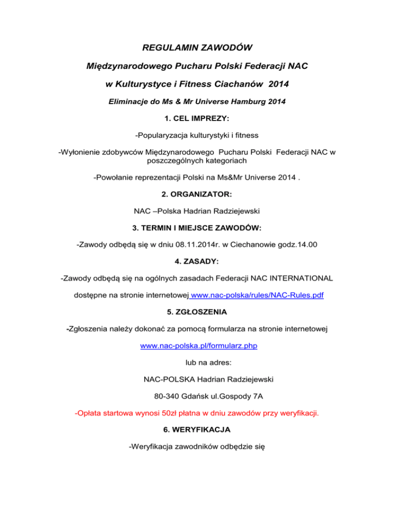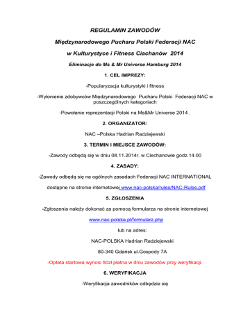 REGULAMIN ZAWODÓW Międzynarodowego Pucharu Polski Federacji NAC w Kulturystyce i Fitness Ciachanów 2014 Eliminacje do Ms & Mr Universe Hamburg 2014 1. CEL IMPREZY: -Popularyzacja kulturystyki i fitness -Wyłonienie zdobywców Międzynarodowego Pucharu Polski Federacji NAC w poszczególnych kategoriach -Powołanie reprezentacji Polski na Ms&Mr Universe 2014 . 2. ORGANIZATOR: NAC –Polska Hadrian Radziejewski 3. TERMIN I MIEJSCE ZAWODÓW: -Zawody odbędą się w dniu 08.11.2014r. w Ciechanowie godz.14.00 4. ZASADY: -Zawody odbędą się na ogólnych zasadach Federacji NAC INTERNATIONAL dostępne na stronie internetowej www.nac-polska/rules/NAC-Rules.pdf 5. ZGŁOSZENIA -Zgłoszenia należy dokonać za pomocą formularza na stronie internetowej www.nac-polska.pl/formularz.php lub na adres: NAC-POLSKA Hadrian Radziejewski 80-340 Gdańsk ul.Gospody 7A -Opłata startowa wynosi 50zł płatna w dniu zawodów przy weryfikacji. 6. WERYFIKACJA -Weryfikacja zawodników odbędzie się w dniu zawodów 9.00 do 11.00 w miejscu zawodów. -Przy weryfikacji wymagany jest dokument tożsamości i potwierdzenie wpłaty. -Podczas weryfikacji zawodników odbędzie się ważenie i pomiar wzrostu -Zawodnik zobowiązany jest do dostarczenia podkładu muzycznego TYLKO na płycie CD opisanych nazwiskiem zawodnika. (nagranie należy umieścić na początku nośnika). 7. KATEGORIE -dostępne na stronie: http://www.nac-polska.pl/categories/categories.htm 8. PRZYJAZD I ZAKWATEROWANIE -Uczestnicy zawodów przyjeżdżają i nocują na koszt własny. -Dla uczestników i gości organizator wynegocjował preferencyjne warunki zakwaterowania na terenie ośrodka sportowego przy którym odbędą się zawody na hasło Puchar Polski NAC 9. NAGRODY Juniorzy , Masters (Weterani) -I miejsce nagroda rzeczowa + puchar -II miejsce nagroda rzeczowa + puchar -III miejsce nagroda rzeczowa + puchar Athletic(Kulturystyka Klasyczna); -I miejsce nagroda rzeczowa + puchar -II miejsce nagroda rzeczowa + puchar -III miejsce nagroda rzeczowa + puchar Men Body(Mr. Muskulatury) -I miejsce nagroda rzeczowa + puchar -II miejsce nagroda rzeczowa + puchar -III miejsce nagroda rzeczowa + puchar -Kategoria OPEN ( do startu klasyfikują się zwycięzcy WSZYSTKICH Męskich Kategorii ) - statuetka + nagroda rzeczowa + nagroda pieniężna 1500 € Ms. Fitness,Ms. Figure , Ms.Shape (bikini) -I miejsce nagroda rzeczowa + puchar -II miejsce nagroda rzeczowa + puchar -III miejsce nagroda rzeczowa + puchar Men`s Aesthetics (Męska Sylwetka) -I miejsce nagroda rzeczowa + puchar -II miejsce nagroda rzeczowa + puchar -III miejsce nagroda rzeczowa + puchar COUPLES(Pary) -I miejsce nagroda rzeczowa + puchar -II miejsce nagroda rzeczowa + puchar -III miejsce nagroda rzeczowa + puchar DEBIUTY -I miejsce nagroda rzeczowa + puchar -II miejsce nagroda rzeczowa + puchar -III miejsce nagroda rzeczowa + puchar 10. POSTANOWIENIA KOŃCOWE -Wszyscy Zawodnicy Polscy Startujący na Międzynarodowym Pucharze Polski sklasyfikowani najwyżej w poszczególnych kategoriach ( z wyłączeniem kategorii DEBIUTY i Men`s Aesthetics ) zostają powołani do reprezentacji Polski na Ms & Mr Universe Hamburg 2014r. -Skład reprezentacji na Ms & Mr Universe zostanie ogłoszony po zakończeniu zawodów. - Każdy z zawodników startujący na zawodach wyraża zgodę na publikowanie jego zdjęć celem reklamowym. -Przystąpienie do rywalizacji oznacza akceptację niniejszego Regulaminu. -Sprawy sporne wynikłe podczas zawodów, a nie ujęte w niniejszym regulaminie rozstrzyga sędzia główny zawodów i organizator. 11. INFORMACJE -Wszelkich dodatkowych informacji o zawodach udziela Sekretariat Federacji NACPolska p. Marta Wójcik tel.787-666-180