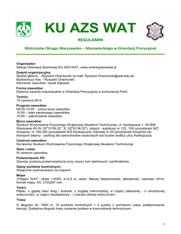 KU AZS WAT REGULAMIN Mistrzostw Okręgu Warszawsko – Mazowieckiego w Orientacji Precyzyjnej Organizator: Sekcja Orientacji Sportowej KU AZS WAT, www.orientujsienawat.pl Zespół organizacyjny: Sędzia główny – Ryszard Chachurski (e-mail: [email protected]) Budowniczy tras – Ryszard Chachurski Kierownik zawodów: Jacek Kijewski Forma zawodów: Dzienne zawody indywidualne w Orientacji Precyzyjnej w konkurencji PreO. Termin: 15 czerwca 2014 Program zawodów: 09:30-10:00 - praca biura zawodów 10:00 – start pierwszego zawodnika 14:00 – zakończenie zawodów Biuro zawodów: Studium Wychowania Fizycznego Wojskowej Akademii Technicznej, ul. Kartezjusza 1, 00-908 Warszawa 49 (N: 52o15’36,32”, E: 20o53’36,32”), dojazd - autobusy nr 122, 154 (przystanek N/Ż Kocjana), nr 149,320 (przystanek N/Ż Kartezjusza), tramwaj nr 20 (przystanek Kocjana) lub transport własny - parking dla samochodów osobowych lub busów wzdłuż ulicy Kartezjusza. Centrum zawodów: Na terenie Studium Wychowania Fizycznego Wojskowej Akademii Technicznej Start i meta: W centrum zawodów. Potwierdzanie PK: Zawody zostaną przeprowadzone przy użyciu kart startowych i perforatorów. Opisy punktów kontrolnych: Wyłącznie wydrukowane na mapach. Mapa: „Poligon WAT”, skala 1:4000, e=2,5 m, autor: Maciej Gędziorowski, aktualność: czerwiec 2014, format mapy: A4, 210x297 mm. Teren: Płaski, o gęstej sieci dróg i ścieżek, z bogatą mikrorzeźbą, w części zalesionej - o utrudnionej widoczności, w części niezalesionej – o bardzo dobrej widoczności. Trasy: O długości ok. 1800 m, 15 punktów kontrolnych + 2 punkty z pomiarem czasu podejmowania decyzji. Dokładna długość trasy zostanie podana w komunikacie technicznym. 1 Start: Interwałowy. Zawodnicy będą oczekiwać na start w specjalnie wydzielonej strefie. Limit czasu: Ok. 100 minut – dokładny limit czasu zostanie podany w komunikacie technicznym. Kategorie: - osoby z dysfunkcjami narządów ruchu – Para Młodzik (osoby urodzone w roku 2000 i młodsze), Para (osoby urodzone w roku 1999 i starsze) – Open Młodzik (osoby urodzone w roku 2000 i młodsze), Open (osoby urodzone w roku 1999 i starsze). Zgłoszenia: Do 8 czerwca 2014 do 23:59 poprzez formularz zgłoszeniowy na stronie PZOS www.zielonysport.pl (sposób preferowany) lub pocztą elektroniczną na adres [email protected] (zgłoszenie jest ważne wyłącznie po otrzymaniu potwierdzenia). W zgłoszeniu należy podać: nazwisko i imię, klub (dotyczy zawodników zrzeszonych w klubach), rok urodzenia, kategorię, numer licencji (dla zawodników zarejestrowanych w PZOS). Opłaty: 0 zł – dla zawodników kategorii Para Młodzik i Para z licencjami PZOS 5 zł - dla zawodników kategorii Para Młodzik i Para bez licencji PZOS oraz dla zawodników kategorii Open Młodzik z licencją PZOS 10 zł - dla zawodników kategorii Open Młodzik bez licencji PZOS oraz zawodników kategorii Open z licencją PZOS 15 zł - dla zawodników kategorii Open bez licencji PZOS Klasyfikacja: Indywidualna w kategoriach Para Młodzik, Para, Open Młodzik, Open. Do klasyfikacji w kategoriach Open i Open Młodzik zaliczani są także zawodnicy startujący w kategoriach Para. Nagrody: Dyplomy za miejsca 1-3 w każdej z kategorii, drobne upominki dla zwycięzców. Świadczenia: Organizator zapewnia każdemu zawodnikowi: - na starcie - mapę z zaznaczoną trasą, - na mecie - napój, - pomiar czasu na punktach z pomiarem czasu, pomiar całkowitego czasu pokonania trasy i sprawdzenie poprawności pokonania trasy, - dostęp do toalet UWAGA! Na terenie centrum zawodów nie ma specjalnych toalet bezbarierowych, niemniej jest podjazd umożliwiający wjazd do budynku i ewentualnie skorzystanie ze znajdujących się tam standardowych toalet. Pozostałe informacje Listy startowe: Listy startowe oraz wykaz numerów startowych sztafet zostaną opublikowane na stronie internetowej www.orientujsienawat.pl nie później niż 13 czerwca. Wyniki: Wyniki będą publikowane na w centrum zawodów oraz po zawodach na stronie internetowej www.orientujsienawat.pl. W strefie mety zostanie opublikowana mapa prezentująca ustawienie wszystkich lampionów ze wskazaniem z prawidłowych odpowiedzi. Po zawodach mapa taka zostanie także zamieszczona na stronie internetowej. 2 Inne: 1. Zawodnicy ubezpieczają się we własnym zakresie. 2. Zawodnik, który wystartuje ma obowiązek zgłoszenia się na mecie nawet, jeśli postanowił nie ukończyć trasy. 3. Zawodnicy podczas przebywania na trasie nie mogą się kontaktować między sobą oraz zawodnikami, którzy trasę ukończyli lub jeszcze nie wystartowali. Zawodnicy, którzy ukończyli trasę nie mogą się kontaktować z zawodnikami, którzy jeszcze nie wystartowali. 3. Organizator nie ponosi odpowiedzialności materialnej za rzeczy zaginione w trakcie trwania zawodów. 4. Organizator zastrzega sobie prawo do ostatecznej interpretacji niniejszego regulaminu. 5. O wszystkich sprawach spornych decyduje sędzia główny zawodów. 6. Bieżące informacje na temat zawodów będą publikowane na stronie internetowej www.orientujsienawat.pl . Istnieje możliwość zorganizowania szkolenia teoretycznego dla zainteresowanych osób i klubów. Osoby takie lub o kontakt. i praktycznego kluby prosimy 3