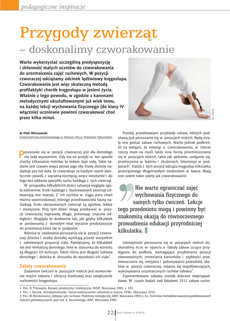 pedagogiczne inspiracje Przygody zwierzt Warto wykorzystać szczególną predyspozycję i skłonność małych uczniów do czworakowania do urozmaicenia zajęć ruchowych. W pozycji czworaczej odciążamy odcinek lędźwiowy kręgosłupa. Czworakowanie jest więc skuteczną metodą profilaktyki chorób kręgosłupa w jesieni życia. Właśnie z tego powodu, w zgodzie z kanonami metodycznymi ukształtowanymi już wiek temu, na każdej lekcji wychowania fizycznego (do klasy IV włącznie) uczniowie powinni czworakować choć przez kilka minut. dr Piotr Winczewski Uniwersytet Jana Kochanowskiego w Kielcach, Filia w Piotrkowie Trybunalskim P oruszanie się w pozycji czworaczej jest dla dorosłego nie lada wyzwaniem. Gdy ma on przejść w ten sposób choćby kilkanaście metrów, to ledwie daje radę. Takie zadanie jest czasem wręcz ponad jego siły. Kiedy dorosły naśladuje psa lub kota, to czworakuje za każdym razem identycznie: powoli, z wyraźną niechęcią, wręcz niezdarnie i do tego bez oddania specyfiki ruchu każdego z tych zwierząt. W przypadku kilkuletnich dzieci sytuacja wygląda zgoła odmiennie. Kroki każdego z ilustrowanych zwierząt odtwarzają one inaczej. Z ich ruchów w ciągu paru chwil można wywnioskować, którego przedstawiciela fauny naśladują. Kroki obrazowanych zwierząt są zgrabne, lekkie i elastyczne. Przy tym dzieci mogą przebywać w pozycji czworaczej naprawdę długo, pokonując znaczne odległości. Wygląda to dosłownie tak, jak gdyby kilkulatek w porównaniu z dorosłym miał wyraźne predyspozycje do przemieszczania się w podporze. Różnice w swobodzie poruszania się w pozycji czworaczej dziecka i osoby dorosłej wynikają przede wszystkim z odmiennych proporcji ciała. Pamiętajmy, że kilkulatek nie jest miniaturą dorosłego. Inne w stosunku do wzrostu są długości ich kończyn. Także różna jest długość tułowia 1 dorosłego i dziecka w stosunku do wysokości ich ciała . Zalety czworakowania Zadaniem ćwiczeń w pozycjach niskich jest wzmocnienie mięśni tułowia i obręczy biodrowej oraz zwiększenie ruchomości kręgosłupa. Poniżej przedstawiam przykłady zabaw, których podstawą jest poruszanie się w pozycjach niskich. Będą miały one postać zabaw ruchowych. Warto jednak podkreślić na wstępie, że mówiąc o czworakowaniu, w istocie rzeczy mam na myśli także inne formy przemieszczania się w pozycjach niskich, takie jak: pełzanie, czołganie się, przetoczenia w leżeniu i skuleniach, lokomocje w pod2 porach . Każda z tych pozycji odciąża kręgosłup kilkulatka przeciążonego długotrwałym siedzeniem w ławce. Mają one zatem takie zalety jak czworakowanie. Nie warto ogranicza zaj wychowania fizycznego do samych tylko wicze. Lekcje tego przedmiotu mog i powinny by znakomit okazj do równoczesnego prowadzenia edukacji przyrodniczej kilkulatka. Umiejętność poruszania się w pozycjach niskich doskonalimy m.in. w oparciu o fabuły zabaw uczące przylegania do podłoża, wymagające przybierania pozycji równoważnych, zmieniania kierunków i szybkości przemieszczania się, omijania i pokonywania przeszkód, skoków w pozycji czworaczej, mijania się współćwiczących, 3 wykonywania urozmaiconych ruchów tułowia . Zaprezentowane zabawy zostały dobrane nieprzypadkowo. W czasie badań nad fabułami 3511 zabaw rucho- 1 Por.: R. Przewęda, Rozwój somatyczny i motoryczny, WSiP, Warszawa 1981, s. 101. 2 Por.: J. Raczek, Antropomotoryka. Teoria motoryczności człowieka w zarysie, PZWL, Warszawa 2010. 3 Por.: M. Bondarowicz, Zabawy i gry ruchowe. Podstawy metodyczne, AWF, Warszawa 1993, s. 41; Technika i metodyka nauczania podstawowych ćwiczeń gimnastycznych, pod red. K. Barańskiego, AWF, Warszawa 1985. 22 Ż yci e Sz k o ł y n r 6/ 2014 Fot. Fotolia – doskonalimy czworakowanie pedagogiczne inspiracje wych opisanych w najpopularniejszych podręcznikach wyraźnie dostrzegłem, że niektórych zwierząt najzwyczajniej w świecie nie przedstawia się dziecku w formie zadań ruchowych. Te zaległości postanowiłem nadrobić. Za istotne bowiem uważam to, by nie ograniczać zajęć wychowania fizycznego do samych tylko ćwiczeń. Lekcje tego przedmiotu mogą i powinny być znakomitą okazją do równoczesnego prowadzenia edukacji przyrodniczej kilkulatka. Ryś Cele: zwychowawczy: kształtowanie poczucia współodpowie- dzialności dziecka za ochronę ginących gatunków; zdydaktyczny: uświadomienie wychowankom sposobu poruszania się rysia w koronach drzew; zw sferze sprawności ruchowej: doskonalenie umiejęt- ności przemiennego czworakowania i przylegania do podłoża oraz zastygania w bezruchu w ustawieniu czworaczym; zw sferze sprawności fizycznej: kształtowanie siły oraz zdolności dostosowania motorycznego mięśni kończyn i tułowia, doskonalenie reakcji ruchowej na zapowiedziane bodźce. Przybory: linie narysowane w sali gimnastycznej, ewentualnie kołatka do inscenizowania dźwięku łamanej gałązki. Pozycja wyjściowa: czworacza. Narracja: Jednym ze zwierząt, które najtrudniej jest spotkać w Polsce, jest ryś. Wszystko przez to, że rysiów jest niewiele i do tego potrafią one znakomicie kryć się przed wzrokiem ludzi. Ryś, słysząc trzask suchej gałązki złamanej przez człowieka, nieruchomieje tak, że trudno go dostrzec. Potrafi on także delikatnie i cicho chodzić po gałęziach rozpostartych wysoko nad ziemią. Czy potrafilibyście skradać się tak jak on i stanąć nieruchomo na kilka chwil? Czy potrafilibyście minąć się z innym rysiem, który szedłby po tej samej gałęzi co wy? Sprawdźmy to! Zobaczymy, jak sprawnymi rysiami bylibyście. Bądźcie ostrożni! Przebieg: uczniowie poruszają się po liniach narysowanych w sali gimnastycznej, traktując je jak gałęzie drzew. Nauczyciel zachęca wychowanków do wychodzenia sobie naprzeciw, mijania się i przeskakiwania w pozycji czworaczej z linii na linię. Należy zwrócić uwagę, by dzieci nie dotykały podłoża poza 
