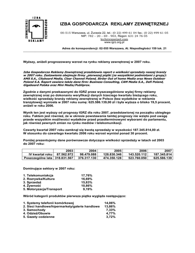 IZBA GOSPODARCZA REKLAMY ZEWNĘTRZNEJ 00-515 Warszawa, ul. Żurawia 22, tel.: (0 22) 499 61 04 fax.: (0 22) 499 61 05 NIP: 782 – 20 – 69 - 903, Regon: 631 24 76 05 [email protected] www.igrz.org.pl Adres do korespondencji: 02-555 Warszawa, Al. Niepodległości 159 lok. 21 ------------------------------------------------------------------------------------------------------------------------------------------------------- Wyższy, aniżeli prognozowany wzrost na rynku reklamy zewnętrznej w 2007 roku. Izba Gospodarcza Reklamy Zewnętrznej przedstawia raport o wielkości sprzedaży naszej branży w 2007 roku. Zestawienie obejmuje firmy „pierwszej piątki (ze wszystkimi podmiotami z grupy): AMS S.A., Cityboard Media, Clear Channel Poland, Ströer Out of home Media oraz News Outdoor Poland S.A. Raport zawiera także dane firm: Business Consulting, CAM Media S.A., Defi Poland, Gigaboard Polska oraz Mini Media/Publiprox. Zgodnie z danymi przekazanymi do IGRZ przez wyszczególnione wyżej firmy reklamy zewnętrznej oraz po dokonaniu weryfikacji danych trzeciego kwartału bieżącego roku, wielkość sprzedaży branży reklamy zewnętrznej w Polsce (bez wydatków w reklamie tranzytowej) wyniosła w 2007 roku sumę: 625.586.139,00 zł i była wyższa o blisko 19,5 procent, aniżeli w roku 2006. Wynik ten jest wyższy od prognozy IGRZ dla roku 2007, przedstawionej na początku ubiegłego roku. Faktem jest również, że w okresie powstawania tamtej prognozy nie wzięto pod uwagę przede wszystkim możliwości wydatków przed przedterminowymi wyborami do parlamentu, jak również pewnych zmian na rynku mediów i telekomunikacji. Czwarty kwartał 2007 roku zamknął się kwotą sprzedaży w wysokości 187.345.814,00 zł. W stosunku do czwartego kwartału 2006 roku wzrost wyniósł ponad 30 procent. Poniżej prezentujemy dane porównawcze dotyczące wielkości sprzedaży w latach od 2003 do 2007 roku: 2003 IV kwartał roku 87.562.972 Poszczególne lata 318.831.567 2004 98.479.088 376.317.130 2005 128.830.346 474.350.128 Dominujące sektory w 2007 roku: 1. Telekomuniakcja 2. Rozrywka/Kultura 3. Sprzedaż 4. Żywność 5. Motoryzacja/Transport 17,76% 16,69% 15,83% 10,86% 9,19% Wśród kategorii produktów pierwsza piątka wygląda następująco: 1. Systemy telefonii komórkowej 2. Sieci handlowe/hipermarkety/galerie handlowe 3. Samochody 4. Odzież/Obuwie 5. Gazety codzienne 14,06% 13,86% 7,33% 4,77% 3,72% 2006 143.520.112 523.760.050 2007 187.345.814 625.586.139 W drugiej części niniejszej analizy prezentujemy dane porównawcze z ostatnich pięciu lat. Wynika z nich, że główni klienci outdooru w Polsce wywodzą się niezmiennie z tych samych pięciu sektorów. W układzie procentowym wydatków najbardziej stabilnymi pozostają sektory „telekomunikacja” i „rozrywka/kultura” Porównując wyniki obu poprzednich lat (2006 i 2007), warto zwrócić uwagę na rosnące wydatki reklamowe w naszym medium na promocję supermarketów, galerii handlowych oraz systemów telefonii komórkowej. Interesujące są wyniki w innych branżach (jak na przykład w „budownictwie”). Ich szczegółowa analiza wykracza jednak poza zakres niniejszego dokumentu. Chciałbym jednakże zapowiedzieć bardziej dogłębną analizę dla rozwoju wydatków na outdoor w ostatnich pięciu latach. IGRZ planuje publikację takiego raportu w lutym bieżącego roku. Dla celów statystycznych podajemy poniżej dane dotyczące czwartego kwartału 2007 roku: IV kwartał 2007 roku według sektorów: 1. Telekomunikacja 2. Sprzedaż 3. Rozrywka/Kultura 4. Żywność 5. Motoryzacja/Transport 18,17% 16,33% 15,04% 9,04% 7,91% IV kwartał 2007 roku według produktów: 1. Sieci telefonii komórkowej 2. Sieci handlowe/hipermarkety/galerie handlowe 3. Samochody 4. Kampanie polityczne 5. Odzież/Obuwie 14,81% 14,11% 6,27% 5,11% 4,07% Krótka analiza dotycząca lat 2003 – 2007. Porównanie udziałów poszczególnych sektorów w reklamie zewnętrznej w latach 2003 – 2007: SEKTOR Telekomunikacja Rozrywka/Kultura Sprzedaż Żywność Motoryzacja/Transport 2003 17,24% 19,40% 18,77% 16,14% 8,17% 3 1 2 4 5 2004 16,33% 17,62% 18,12% 16,21% 8,62% 3 2 1 4 5 2005 18,29% 18,11% 15,96% 13,72% 8,07% 1 2 3 4 5 2006 18,41% 19,90% 15,71% 12,81% 7,75% 2 1 3 4 5 2007 17,76% 16,69% 15,83% 10,86% 9,19% 1 2 3 4 5 Porównanie udziałów wybranych produktów w reklamie zewnętrznej w latach 2003 – 2007: PRODUKT Sieci handlowe/supermarkety Systemy telefonii komórkowej Gazety codzienne Samochody Piwo Kampanie polityczne 2003 16,05% 11,22% 8,20% 5,36% 6,36% x 1 2 3 5 4 x 2004 15,57% 12,38% 8,20% 6,70% 5,07% x 1 2 6 3 5 x 2005 13,38% 13,31% 6,85% 5,62% 3,58% 5,14% 1 2 3 4 7 5 2006 12,61% 12,51% 7,47% 5,72% 3,56% 3,77% 1 2 3 4 7 6 2007 13,86% 14,06% 3,72% 7,33% 2,29% 2,18% 2 1 5 3 12 13 Charakterystyczne dla 2007 roku były przyspieszone zmiany w zakresie powstawania nowych lokalizacji nośników reklamy. Te, wymuszone zmianami administracyjnymi oraz te, które wiązały się z kolejnymi inwestycjami. Coraz większe przychody generowały nośniki w formacie 600 x 300 cm (wizerunkowe). Nie bez znaczenia były również przychody z tytułu wynajmu wielkich powierzchni ekspozycyjnych, zlokalizowanych na ścianach budynków. Ważną rolę w przychodach odgrywały również coraz bardziej popularne ambienty (także w połączeniu z wykorzystaniem standardowych nośników reklamy). Istotny wpływ na wyniki roku 2007 miały także zmiany cen wynajmu powierzchni ekspozycyjnych. Klienci outdooru przyzwyczaili się do zróżnicowania cenowego w zależności od jakości i miejsca ich lokalizacji. Poszczególne nośniki reklamy zaczęły „konkurować” między sobą, co pozytywnie wpłynęło na ich rozwój. Cały rynek reklamy zewnętrznej w Polsce wymaga nadal pewnego uporządkowania. Ubiegły rok pokazał, że firmy reklamy zewnętrznej są do tego przygotowane. Wiele zależeć będzie tutaj od kolejnych zmian prawnych i administracyjnych. Lech Kaczoń Prezes IGR