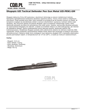 CQB TACTICAL - sklep internetowy cqb.pl www.cqb.pl Długopis UZI Tactical Defender Pen Gun Metal UZI-PEN1-GM Długopis taktyczny firmy UZI wykonany z aluminium lotniczego w szarym metalicznym kolorze. Specjalnie zaprojektowana karbowana obudowa zapewnia pewny, mocny chwyt nawet w wilgotnych warunkach. Pisak posiada duży klips, który pozwala na przypięcie go do kieszeni koszuli czy paska. W komplecie znajduje się standardowy wkład z czarnym atramentem, wystarczy rozkręcić dolna część obudowy, aby otrzymać gotowy do pisania długopis. Jest to przedmiot codziennego użytku, który doskonale sprawdzi się także do samoobrony oraz walki wręcz. Solidna, wytrzymała obudowa pozwala na wykorzystanie długopisu do uderzeń, ucisków na wrażliwe miejsca na ciele atakującego, jak również do zakładania dźwigni. Oprócz podstawowej funkcji jaką jest pisanie, doskonale spełnia rolę kubotana/yawary. Dodatkowo długopis posiada ostre zakończenie idealne do zebrania materiału DNA napastnika. Istniej możliwość zamontowania wkładu Fisher Space Pen piszącego w każdych warunkach atmosferycznych. Możemy dzięki temu wzbogacić nasz taktyczny długopis UZI o niezwykłe właściwości: pisanie pod każdym kątem, w temperaturach od -37 do 120°C, a nawet po mokrych nawierzchniach. Cechy: - Długość: 15,5 cm Kolor wkładu: Czarny Kolor obudowy: Grafitowy Obudowa: Aluminium Waga: 45,4 g strona 1 / 1 Powered by TCPDF (www.tcpdf.org)