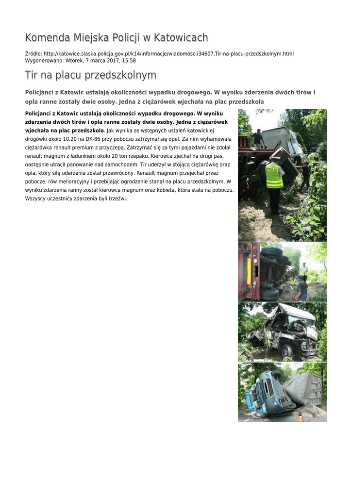 Komenda Miejska Policji w Katowicach Źródło: http://katowice.slaska.policja.gov.pl/k14/informacje/wiadomosci/34607,Tir-na-placu-przedszkolnym.html Wygenerowano: Wtorek, 7 marca 2017, 15:58 Tir na placu przedszkolnym Policjanci z Katowic ustalają okoliczności wypadku drogowego. W wyniku zderzenia dwóch tirów i opla ranne zostały dwie osoby. Jedna z ciężarówek wjechała na plac przedszkola Policjanci z Katowic ustalają okoliczności wypadku drogowego. W wyniku zderzenia dwóch tirów i opla ranne zostały dwie osoby. Jedna z ciężarówek wjechała na plac przedszkola. Jak wynika ze wstępnych ustaleń katowickiej drogówki około 10.20 na DK-86 przy poboczu zatrzymał się opel. Za nim wyhamowała ciężarówka renault premium z przyczepą. Zatrzymać się za tymi pojazdami nie zdołał renault magnum z ładunkiem około 20 ton rzepaku. Kierowca zjechał na drugi pas, następnie utracił panowanie nad samochodem. Tir uderzył w stojącą ciężarówkę oraz opla, który siłą uderzenia został przewrócony. Renault magnum przejechał przez pobocze, rów melioracyjny i przebijając ogrodzenie stanął na placu przedszkolnym. W wyniku zdarzenia ranny został kierowca magnum oraz kobieta, która stała na poboczu. Wszyscy uczestnicy zdarzenia byli trzeźwi. Ocena: 0/5 (0) Tweetnij