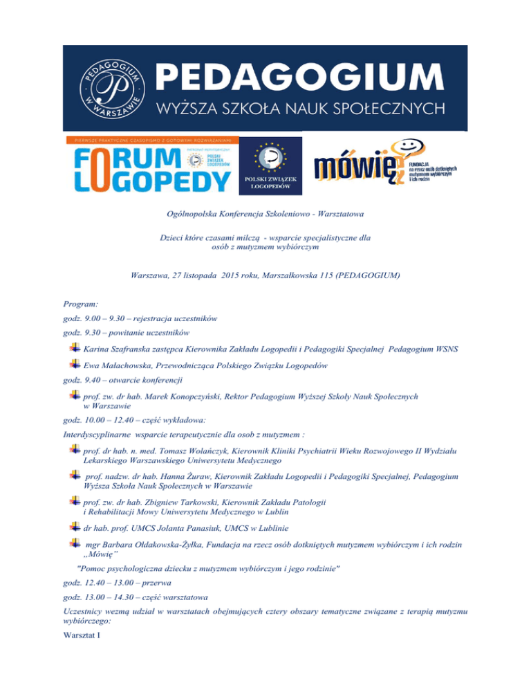 Ogólnopolska Konferencja Szkoleniowo - Warsztatowa Dzieci które czasami milczą - wsparcie specjalistyczne dla osób z mutyzmem wybiórczym Warszawa, 27 listopada 2015 roku, Marszałkowska 115 (PEDAGOGIUM) Program: godz. 9.00 – 9.30 – rejestracja uczestników godz. 9.30 – powitanie uczestników Karina Szafranska zastępca Kierownika Zakładu Logopedii i Pedagogiki Specjalnej Pedagogium WSNS Ewa Małachowska, Przewodnicząca Polskiego Związku Logopedów godz. 9.40 – otwarcie konferencji prof. zw. dr hab. Marek Konopczyński, Rektor Pedagogium Wyższej Szkoły Nauk Społecznych w Warszawie godz. 10.00 – 12.40 – część wykładowa: Interdyscyplinarne wsparcie terapeutycznie dla osob z mutyzmem : prof. dr hab. n. med. Tomasz Wolańczyk, Kierownik Kliniki Psychiatrii Wieku Rozwojowego II Wydziału Lekarskiego Warszawskiego Uniwersytetu Medycznego prof. nadzw. dr hab. Hanna Żuraw, Kierownik Zakładu Logopedii i Pedagogiki Specjalnej, Pedagogium Wyższa Szkoła Nauk Społecznych w Warszawie prof. zw. dr hab. Zbigniew Tarkowski, Kierownik Zakładu Patologii i Rehabilitacji Mowy Uniwersytetu Medycznego w Lublin dr hab. prof. UMCS Jolanta Panasiuk, UMCS w Lublinie mgr Barbara Ołdakowska-Żyłka, Fundacja na rzecz osób dotkniętych mutyzmem wybiórczym i ich rodzin „Mówię” "Pomoc psychologiczna dziecku z mutyzmem wybiórczym i jego rodzinie" godz. 12.40 – 13.00 – przerwa godz. 13.00 – 14.30 – część warsztatowa Uczestnicy wezmą udział w warsztatach obejmujących cztery obszary tematyczne związane z terapią mutyzmu wybiórczego: Warsztat I „Obszary pomocy rodzinie dziecka z mutyzmem" Barbara Ołdakowska- Żyłka, psycholog Mgr Barbara Ołdakowska- Żyłka Pedagog, trenerka Polskiego Towarzystwa Psychologicznego. Posiada 30-letnie doświadczenie w pracy zawodowej. Jest założycielką i prezeską „Fundacji na rzecz osób dotkniętych mutyzmem wybiórczym i ich rodzin „MÓWIĘ" oraz pierwszej w Polsce Poradni Terapii Mutyzmu „MÓWIĘ” .W myśl swojej autorskiej metody prowadzi terapię dzieci i rodzin. Swoją działalność edukacyjną realizuje poprzez szkolenia i konsultacje adresowane do rodziców i specjalistów. Autorka artykułów na temat mutyzmu wybiórczego. Warsztat II – Justyna Święcicka, psycholog Dziecko z mutyzmem wybiórczym w przedszkolu i szkole – rola nauczyciela Mgr Justyna Święcicka Absolwentka psychologii na Uniwersytecie Warszawskim. Jako psycholog od ponad 20 lat specjalizuje się w pracy z osobami zmagającymi się z zaburzeniami lękowymi, a w szczególności z nastolatkami z mutyzmem wybiórczym. Oprócz terapii prowadzi także szkolenia i warsztaty dla rodziców, pracowników oświaty i lekarzy. Jest autorką wielu nagrodzonych książek dla dzieci i poradników psychologicznych, takich jak „Oswoić ADHD”, „Ja i grupa”, „Trening koncentracji dla uczniów” oraz scenariuszy do filmów edukacyjnych. Współpracuje z Poradnią Terapii Mutyzmu „Mówię” Warsztat III – Karolina Kwiatek, psycholog Terapia dziecka z mutyzmem wybiórczym Mgr Karolina Kwiatek Absolwentka psychologii na Katolickim Uniwersytecie Lubelskim – specjalizacja w zakresie psychologii klinicznej dzieci i młodzieży. Ukończyła dwuletnie studium socjoterapii oraz czteroletni podyplomowy kurs psychoterapii w Instytucie Analizy Grupowej „Rasztów”. Ma dziesięcioletnie doświadczenie w pracy terapeutycznej oraz diagnostycznej z dziećmi w wieku przedszkolnym. Prowadzi zajęcia terapeutyczne, indywidualne i grupowe, z dziećmi mającymi trudności emocjonalne i społeczne o różnym podłożu. Duże doświadczenie w prowadzeniu psychoterapii indywidualnej młodzieży i osób dorosłych. Współprowadzi warsztaty dla nauczycieli oraz rodziców. Współpracuje z Poradnią Terapii Mutyzmu „Mówię” godz. 15.15 – 15.30 – zamknięcie konferencji prof. zw. dr hab. Marek Konopczyński, Rektor Pedagogium Wyższej Szkoły Nauk Społecznych w Warszawie Komitet konferencji : prof.zw.dr hab. Marzenna Zaorska Uniwersytet Warmińsko - Mazurski, Katedra Pedagogiki Specjalnej prof. dr hab. n. med. Tomasz Wolańczyk, Kierownik Kliniki Psychiatrii Wieku Rozwojowego II Wydziału Lekarskiego Warszawskiego Uniwersytetu Medycznego prof. nadzw. dr hab. Hanna Żuraw, Kierownik Zakładu Logopedii i Pedagogiki Specjalnej, Pedagogium Wyższa Szkoła Nauk Społecznych w Warszawie prof. zw. dr hab. Zbigniew Tarkowski, Kierownik Zakładu Patologii i Rehabilitacji Mowy Uniwersytetu Medycznego w Lublinie dr Karina Szafrańska, PedagogiumWyższa Szkoła Nauk Społecznych w Warszawie Centrum Doskonalenia Logopedów dr Iwona Klonowska PedagogiumWyższa Szkoła Nauk Społecznych w Warszawie Centrum Ewa Małachowska, Joanna Grabowska-Okraska, Polski Związek Logopedów mgr Agnieszka Siwinska PEDAGOGIM WSNS Miejsce: PEDAGOGIUM Wyzsza Szkoła Nauk Społecznych w Warszawie ul. Marszałkowska 115 Rejestracja: [email protected] Opłaty : 220 zł - płatne przelewem na konto PEDAGOGIUM WSNS: