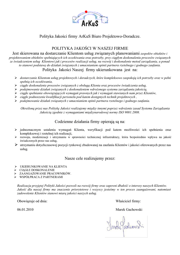 Polityka Jakości firmy ArKuS Biuro Projektowo-Doradcze. POLITYKA JAKOŚCI W NASZEJ FIRMIE Jest skierowana na dostarczanie Klientom usług związanych planowaniami zespołów obiektów i projektowaniem obiektów spełniających ich oczekiwania oraz potrzeby, przy ciągłym doskonaleniu procesów związanych ze świadczeniem usług Klientowi jak i procesów realizacji usług, na rozwój i doskonalenie metod zarządzania, a ponad to stanowi podstawę do działań związanych z umacnianiem opinii partnera rzetelnego i godnego zaufania. Polityka Jakości Naszej firmy ukierunkowana jest na: dostarczanie Klientom usług projektowych i doradczych, które kompleksowo zaspokoją ich potrzeby oraz w pełni spełnią ich oczekiwania, ciągłe doskonalenie procesów związanych z obsługą Klienta oraz procesów świadczenia usług, podejmowanie działań związanych z doskonaleniem wdrożonego systemu zarządzania jakością, ciągłe spełnianie obowiązujących wymagań prawnych jak i wymagań stawianych nam przez Klientów, ciągłe podnoszenie kwalifikacji personelu pod katem dostępnych technik projektowych , podejmowanie działań związanych z umacnianiem opinii partnera rzetelnego i godnego zaufania. Określoną przez nas Politykę Jakości realizujemy między innymi poprzez wdrożenie zasad Systemu Zarządzania Jakością zgodnie z wymaganiami międzynarodowej normy ISO 9001:2008. Codzienne działania firmy opierają są na: jednoznacznym ustaleniu wymagań Klienta, weryfikacji pod katem możliwości ich spełnienia oraz kompleksowej i rzetelnej ich realizacji, rozwoju, modernizacji i utrzymaniu w sprawności technicznej infrastruktury, która bezpośrednio wpływa na jakość świadczonych przez nas usług, utrzymaniu dotychczasowej pozycji rynkowej zbudowanej na zaufaniu Klientów i jakości oferowanych przez nas usług. Nasze cele realizujemy przez: UKIERUNKOWANIE NA KLIENTA CIĄGŁE DOSKONALENIE ZAANGAŻOWANIE PRACOWNIKÓW. WSPÓŁPRACA Z PARTNERAMI Realizacja przyjętej Polityki Jakości pozwoli na rozwój firmy oraz zapewni dbałość o interesy naszych Klientów. Jakość dla naszej firmy ma znaczenie priorytetowe i wszyscy jesteśmy w ten proces zaangażowani, natomiast zadowolenie Klientów stanowi miarę jakości naszych usług. Obowiązuje od dnia: Właściciel firmy: 06.01.2010 Marek Gachowski