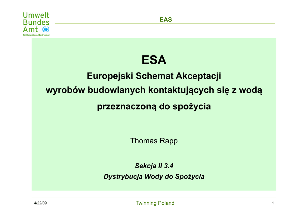 EAS ESA Europejski Schemat Akceptacji wyrobów budowlanych kontaktujących się z wodą przeznaczoną do spożycia Thomas Rapp Sekcja II 3.4 Dystrybucja Wody do Spożycia 4/22/09 Twinning Poland 1 EAS Opis ogólny • Historia • Sytuacja bieżąca 4/22/09 Twinning Poland 2 EAS Wyroby kontaktujące się z WS DWS DWB Inne dyrektywy w sprawie wyrobów Cele: • Transparentność w zakresie osiągów wyrobów • Likwidacja barier w handlu Jakość wody do spożycia 4/22/09 Harmonizacja norm wyrobów i metod badawczych Twinning Poland 3 EAS Pierwsze kroki • 1994: Seminarium CEN w Wiedniu: Opracowanie zharmonizowanych metod badawczych / wytycznych regulacyjnych • 1998-1999: Komisja Europejska zwróciła się do 4 PC (Francji, Niemiec, Holandii, ZK) z prośbą o opinię => Studium Wykonalności (1999) 4/22/09 Twinning Poland 4 EAS Studium wykonalności w sprawie możliwego połączenia schematów dopuszczania wyrobów budowlanych kontaktujących się z wodą przeznaczoną do spożycia przez ludzi obowiązujących w 4 Państwach Członkowskich (kwiecień 1999 r.) 4/22/09 Twinning Poland 5 EAS DWB – ESA • 1999 - 2004: Grupa regulatorów w dziedzinie wyrobów budowlanych kontaktujących się z wodą do spożycia (GR – WBWS) => Propozycja ESA (2005) , w tym kryteria akceptacji – Pozytywna lista materiałów organicznych – Lista składu materiałów metalowych – Lista zatwierdzonego składu materiałów cementowych 4/22/09 Twinning Poland 6 EAS DWB – ESA • 2004: „Klein“ – Break • 2005: Zamiana „Grupy regulatorów” na „Grupę ekspertów” (GE – WBWS) Problemy prawne związane z DWB – EAS: Harmonizacja metod badawczych, ale nie definicji kryteriów akceptacji 4/22/09 Twinning Poland 7 EAS Materiały kontaktujące się z WS DWS DWB Inne dyrektywy w sprawie wyrobów Jakość wody do spożycia Właściwości higieniczne materiałów kontaktujących się z WS 4/22/09 Twinning Poland 8 EAS DWB – ESA • 2007: Komisja Europejska zwróciła się do 4 PC (Francji, Niemiec, Holandii, ZK) z prośbą o opinię • => Grupa 4 PC 4/22/09 Twinning Poland 9 EAS Sytuacja bieżąca • GE – WBWS DWB nadal pracuje, wyniki? • Brak pewności w sprawie nowelizacji DWS ⇒ Wymagane Krajowe Schematy Akceptacji • Grupa 4 PC: - Połączenie obowiązujących w tych państwach schematów dopuszczania - Propozycja dla innych PC i Komisji 4/22/09 Twinning Poland 10 EAS Dziękuję Państwu za uwagę! Thomas Rapp [email protected] www.umweltbundesamt.de 4/22/09 Twinning Poland 11