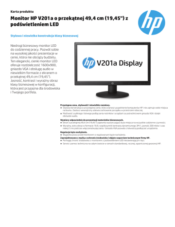 Karta produktu Monitor HP V201a o przekątnej 49,4 cm (19,45'') z podświetleniem LED Stylowa i niewielka konstrukcja klasy biznesowej Niedrogi biznesowy monitor LED do codziennej pracy. Pozwól sobie na wysokiej jakości prezentacje w cenie, która nie obciąży budżetu. Ten elegancki, cienki monitor LED oferuje rozdzielczość 1600x900, gniazdo VGA i obsługę audio w niewielkim formacie z ekranem o przekątnej 49,4 cm (19,45''). Jasność, kontrast i wyraźny obraz klasy biznesowej w konfiguracji, która jest przyjazna dla środowiska i Twojego portfela. Przystępna cena, stylowość i niewielkie rozmiary. ● Stylowa konstrukcja w przystępnej cenie, która stanowi uzupełnienie komputerów HP i nie zajmuje wiele miejsca na biurku. Zasilacz wewnętrzny ułatwia zachowanie porządku w przestrzeni roboczej. ● Możliwość szybkiego i łatwego podłączania nośników i urządzeń za pośrednictwem gniazda VGA i dzięki obsłudze audio. Wymiary odpowiednie do prezentacji materiałów biznesowych. ● Ekran o przekątnej 49,4 cm (19,45'') zapewnia wystarczająco dużo miejsca na wszystkie codzienne czynności. ● Wyraźny, ostry obraz w formacie 16:9, współczynnik kontrastu dynamicznego 3M:1, jasność 200 nitów i czas reakcji 5 ms podczas włączania/wyłączania.1 Gniazdo VGA pozwala z łatwością podłączać urządzenia. Regulacja kąta nachylenia. ● Wygodna praca przed monitorem o regulowanym kącie nachylenia. Zaprojektowano z myślą o ochronie środowiska i objęto wsparciem technicznym firmy HP. ● Pomagaj chronić środowisko z monitorem z podświetleniem LED niezawierającym rtęci. ● Serwis i pomoc techniczna na całym świecie w ramach standardowej, rocznej, ograniczonej gwarancji HP. Karta produktu Monitor HP V201a o przekątnej 49,4 cm (19,45'') z podświetleniem LED Tabela specyfikacji Numer produktu F8C55AA; F8C55AS; F8C55AT Rozmiar wyświetlacza (przekątna) 49,4 cm (19,45") Kąt podglądu 90° w poziomie, 50° w pionie Jasność 200 cd/m²1 Współczynnik kontrastu 600:1 statyczny; 3000000:1 dynamiczny1 Wskaźnik odpowiedzi 5 ms (wł./wył.)1 Współczynnik kształtu 16:9 Rozdzielczość własna 1600 x 900 Obsługiwane rozdzielczości 1600 x 900; 1440 x 900; 1280 x 1024; 1280 x 720; 1024 x 768; 800 x 600; 720 x 400; 640 x 480 Funkcje wyświetlacza Powłoka antyrefleksyjna; Plug and Play; Konfiguracja przez użytkownika; Wybór języka; Menu ekranowe; Podświetlenie LED Sygnał wejściowy 1 VGA Porty i złącza 1 gniazdo audio Moc wyjściowa Napięcie wejściowe: Od 100 do 230 V pr. zm. Zużycie energii 23 W (maks.), 19 W (normalna praca), <0,5 W (tryb oczekiwania) Wymiary ze stojakiem (szer. x 46,8 x 4,69 x 28,87 cm głęb. x wys.) Wymiary bez stojaka (szer. x głęb. x wys.) 46,8 x 19 x 35,53 cm Waga 2,8 kg Ergonomia Nachylenie: od -5 do +15° Ochrona środowiska Podświetlenie niezawierające rtęci; Panel wyświetlacza niezawierający arsenu; Gwarancja Roczna ograniczona gwarancja obejmująca 1 rok gwarancji na części i robociznę. Obowiązują pewne ograniczenia i wyłączenia. Karta produktu Monitor HP V201a o przekątnej 49,4 cm (19,45'') z podświetleniem LED Akcesoria i usługi (nie wchodzą w skład zestawu) Regulowana podstawa wyświetlacza HP Możesz zmienić notebook HP dla firm w ergonomiczne rozwiązanie biurkowe z 24-calowym ekranem. Podstawa wyświetlacza z dwoma zapewniającymi płynną regulację zawiasami umożliwia bardziej precyzyjne ustawienie odległości, wysokości i pochylenia ekranu w celu uzyskania maksymalnego komfortu pracy. Elastyczna konstrukcja regulowanej podstawy wyświetlacza HP umożliwia podłączenie notebooków wyposażonych w złącze stacji dokującej oraz komputerów, które nie są wyposażone w takie rozwiązanie. Numer produktu: AW663AA Regulowana podstawa na 2 wyświetlacze HP Regulowana podstawa na 2 wyświetlacze HP umożliwia korzystanie z dwóch monitorów, zapewniając maksymalną wydajność i optymalną skuteczność w pracy. Wyświetlacze można ustawić w orientacji poziomej lub pionowej — pojedynczo lub oba jednocześnie. Ponadto istnieje możliwość regulacji głębokości, wysokości, nachylenia oraz kąta obrotu stojaka. Dzięki temu można ustawić oba monitory na poziomie oczu, skierowane nieznacznie w swoją stronę. W ten sposób można korzystać z wielu aplikacji i śledzić różne źródła informacji jednocześnie. Wbudowane rolki umożliwiają obracanie podstawy, aby łatwiej prezentować obraz na ekranie współpracownikom. Numer produktu: AW664AA Podstawka HP pod notebook i monitor II Podstawka pod monitor i notebook HP w wersji II pozwala szybko i łatwo stworzyć komfortową przestrzeń roboczą dla notebooka lub notebooka i stacji roboczej oraz zewnętrznego wyświetlacza, podnosząc je ponad poziom biurka. Stojak HP Integrated Work Center do komputera biurkowego Ultra Slim i terminala Thin Client Stojak HP Integrated Work Center Stand pomaga optymalnie wykorzystać ograniczone miejsce na biurku bez szkody dla wydajności lub produktywności — można w nim zamontować za pomocą standardowych uchwytów mocujących VESA komputer biurkowy HP Compaq 6005 Pro lub HP Ultra-slim z serii 8000 albo terminal thin client HP oraz większość monitorów LCD HP o przekątnej od 43,18 do 60,96 cm (17–24"*) (zob. informacje dot. zgodności zamieszczone w skróconych danych technicznych). * Monitory HP o wadze od 3,4 kg do 4,8 kg (od 7,5 funta do 10,5 funta). Numer produktu: E8G00AA Numer produktu: E8H16AA Uchwyt mocujący HP Quick Release do monitorów LCD Bezpieczne i łatwe w użyciu rozwiązanie do montażu klientów uproszczonych HP zgodnych ze standardem VESA, zgodnych monitorów płaskich i innych urządzeń biurkowych HP. Możliwość zamocowania do dowolnej zgodnej podstawy, uchwytu lub elementu do montażu na ścianie — i optymalnego wykorzystania przestrzeni roboczej. Numer produktu: EM870AA 3 lata, serwis w następnym dniu roboczym, w miejscu instalacji Pakiet HP Care: 3 lat