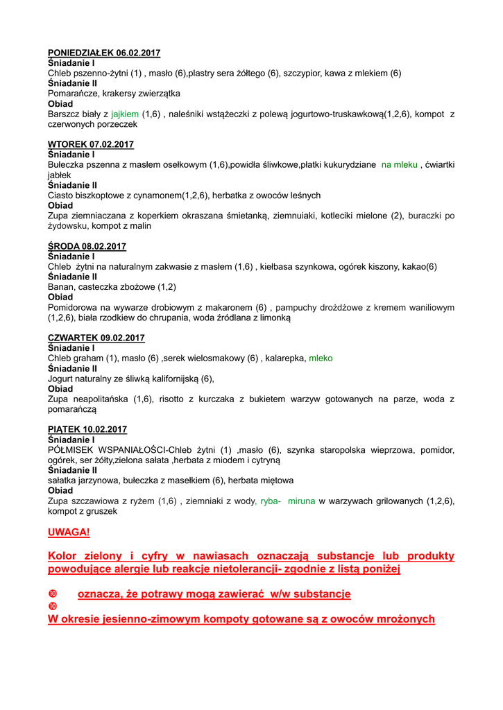 PONIEDZIAŁEK 06.02.2017 Śniadanie I Chleb pszenno-żytni (1) , masło (6),plastry sera żółtego (6), szczypior, kawa z mlekiem (6) Śniadanie II Pomarańcze, krakersy zwierzątka Obiad Barszcz biały z jajkiem (1,6) , naleśniki wstążeczki z polewą jogurtowo-truskawkową(1,2,6), kompot z czerwonych porzeczek WTOREK 07.02.2017 Śniadanie I Bułeczka pszenna z masłem osełkowym (1,6),powidła śliwkowe,płatki kukurydziane na mleku , ćwiartki jabłek Śniadanie II Ciasto biszkoptowe z cynamonem(1,2,6), herbatka z owoców leśnych Obiad Zupa ziemniaczana z koperkiem okraszana śmietanką, ziemnuiaki, kotleciki mielone (2), buraczki po żydowsku, kompot z malin ŚRODA 08.02.2017 Śniadanie I Chleb żytni na naturalnym zakwasie z masłem (1,6) , kiełbasa szynkowa, ogórek kiszony, kakao(6) Śniadanie II Banan, casteczka zbożowe (1,2) Obiad Pomidorowa na wywarze drobiowym z makaronem (6) , pampuchy drożdżowe z kremem waniliowym (1,2,6), biała rzodkiew do chrupania, woda źródlana z limonką CZWARTEK 09.02.2017 Śniadanie I Chleb graham (1), masło (6) ,serek wielosmakowy (6) , kalarepka, mleko Śniadanie II Jogurt naturalny ze śliwką kalifornijską (6), Obiad Zupa neapolitańska (1,6), risotto z kurczaka z bukietem warzyw gotowanych na parze, woda z pomarańczą PIĄTEK 10.02.2017 Śniadanie I PÓŁMISEK WSPANIAŁOŚCI-Chleb żytni (1) ,masło (6), szynka staropolska wieprzowa, pomidor, ogórek, ser żółty,zielona sałata ,herbata z miodem i cytryną Śniadanie II sałatka jarzynowa, bułeczka z masełkiem (6), herbata miętowa Obiad Zupa szczawiowa z ryżem (1,6) , ziemniaki z wody, ryba- miruna w warzywach grilowanych (1,2,6), kompot z gruszek UWAGA! Kolor zielony i cyfry w nawiasach oznaczają substancje lub produkty powodujące alergie lub reakcje nietolerancji- zgodnie z listą poniżej oznacza, że potrawy mogą zawierać w/w substancje W okresie jesienno-zimowym kompoty gotowane są z owoców mrożonych