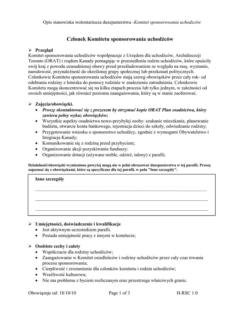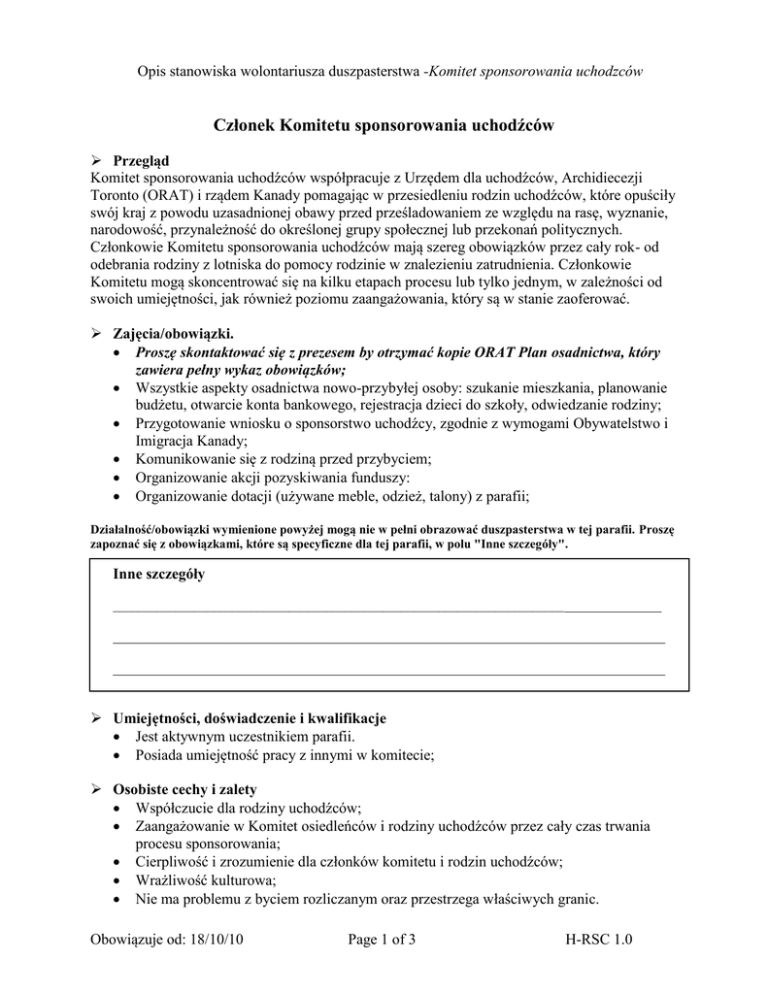 Opis stanowiska wolontariusza duszpasterstwa -Komitet sponsorowania uchodzców Członek Komitetu sponsorowania uchodźców Przegląd Komitet sponsorowania uchodźców współpracuje z Urzędem dla uchodźców, Archidiecezji Toronto (ORAT) i rządem Kanady pomagając w przesiedleniu rodzin uchodźców, które opuściły swój kraj z powodu uzasadnionej obawy przed prześladowaniem ze względu na rasę, wyznanie, narodowość, przynależność do określonej grupy społecznej lub przekonań politycznych. Członkowie Komitetu sponsorowania uchodźców mają szereg obowiązków przez cały rok- od odebrania rodziny z lotniska do pomocy rodzinie w znalezieniu zatrudnienia. Członkowie Komitetu mogą skoncentrować się na kilku etapach procesu lub tylko jednym, w zależności od swoich umiejętności, jak również poziomu zaangażowania, który są w stanie zaoferować. Zajęcia/obowiązki. Proszę skontaktować się z prezesem by otrzymać kopie ORAT Plan osadnictwa, który zawiera pełny wykaz obowiązków; Wszystkie aspekty osadnictwa nowo-przybyłej osoby: szukanie mieszkania, planowanie budżetu, otwarcie konta bankowego, rejestracja dzieci do szkoły, odwiedzanie rodziny; Przygotowanie wniosku o sponsorstwo uchodźcy, zgodnie z wymogami Obywatelstwo i Imigracja Kanady; Komunikowanie się z rodziną przed przybyciem; Organizowanie akcji pozyskiwania funduszy: Organizowanie dotacji (używane meble, odzież, talony) z parafii; Działalność/obowiązki wymienione powyżej mogą nie w pełni obrazować duszpasterstwa w tej parafii. Proszę zapoznać się z obowiązkami, które są specyficzne dla tej parafii, w polu "Inne szczegóły". Inne szczegóły ________________________________________________________________________ ______________ ________________________________________________________________________________ ________________________________________________________________________________ Umiejętności, doświadczenie i kwalifikacje Jest aktywnym uczestnikiem parafii. Posiada umiejętność pracy z innymi w komitecie; Osobiste cechy i zalety Współczucie dla rodziny uchodźców; Zaangażowanie w Komitet osiedleńców i rodziny uchodźców przez cały czas trwania procesu sponsorowania; Cierpliwość i zrozumienie dla członków komitetu i rodzin uchodźców; Wrażliwość kulturowa; Nie ma problemu z byciem rozliczanym oraz przestrzega właściwych granic. Obowiązuje od: 18/10/10 Page 1 of 3 H-RSC 1.0 Opis stanowiska wolontariusza duszpasterstwa -Komitet sponsorowania uchodzców Orientacja i szkolenia Sesja informacyjna ORAT ORAT Szkolenie osiedleńcze; Grupa uczestników Rodziny uchodźców Wsparcie, nadzór i ewaluacja Proboszcz i/lub jego zespół jest pierwszą instancją oferującą wsparcie, nadzór i ewaluacje. Długość kadencjim 1-2 lata -Zależy od czasu przygotowania przed przybyciem rodziny + zobowiązanie do 1 roku w Komitecie osiedleńczym. Istnieją specjalne przypadki gdzie 2 lata zobowiązania do pracy w Komitecie osiedleńczym mogą być wymagane. Korzyści i warunki pracy Bezpośrednio przyczyni się do dobrobytu społecznego Wspólnoty parafialnej. Będzie rozwijać swe umiejętności relacji. Możliwość pracy społecznej i nabrania doświadczenia do wykorzystania w szkole bądź dla awansowania kariery. Jest to pozycja wolontariusza i wymaga zaangażowania czasu - zależy od roli i obowiązków podjętych. Musi być w stanie uczestniczyć w sesji orientacyjnej i szkoleniach, zgodnie z wymaganiami. Zalecenia przy selekcji Jest to stanowisko wysokiego ryzyka. Wymagane jest wypełnienie formularza Dane wolontariusza. Rozmowa kwalifikacyjna i sprawdzenie referencji osobistych są wymagane. Sprawdzenie karnego rekordu jest wymagane. Szkolenie i orientacja są wymagane. Będzie nadzór i okresowe ewaluacje. Kolejne spotkania z uczestnikiem mogą być prowadzone Obowiązuje od: 18/10/10 Page 2 of 3 H-RSC 1.0 Opis stanowiska wolontariusza duszpasterstwa -Komitet sponsorowania uchodzców Ten opis stanowiska dokładnie odzwierciedla opis pozycji: Członek Komitetu Sponsorowania uchodźców obecnie praktykowane w _____________________________. (Nazwa parafii) ____________________________________ Parafialny komitet selekcji wolontariuszy ____________________________________ Proboszcz __________________________________ Data Przygotowane przez: Archidiecezja Toronto Obowiązuje od: 18/10/10 Page 3 of 3 H-RSC 1.0