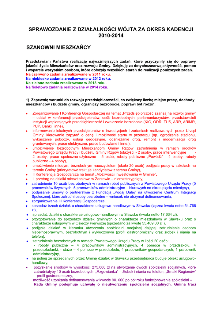 SPRAWOZDANIE Z DZIAŁALNOŚCI WÓJTA ZA OKRES KADENCJI 2010-2014 SZANOWNI MIESZKAŃCY Przedstawiam Państwu realizację najważniejszych zadań, które przyczyniły się do poprawy jakości życia Mieszkańców oraz rozwoju Gminy. Dziękuję za dotychczasową aktywność, pomoc i wsparcie wszystkim osobom, które dołożyły wszelkich starań do realizacji poniższych zadań. Na czerwono zadania zrealizowane w 2011 roku. Na niebiesko zadania zrealizowane w 2012 roku. Na zielono zadania zrealizowane w 2013 roku. Na fioletowo zadania realizowane w 2014 roku. 1) Zapewnię warunki do rozwoju przedsiębiorczości, co zwiększy liczbę miejsc pracy, dochody mieszkańców i budżetu gminy, ograniczy bezrobocie, poprawi byt rodzin. Zorganizowanie I Konferencji Gospodarczej na temat „Przedsiębiorczość szansą na rozwój gminy” – udział w konferencji przedsiębiorców, osób bezrobotnych, parlamentarzystów, przedstawicieli instytucji wspierających przedsiębiorczość i zwalczanie bezrobocia (KIG, ODR, ZUS, ARR, ARiMR, PUP, Banki i inne), informowanie lokalnych przedsiębiorców o inwestycjach i zadaniach realizowanych przez Urząd Gminy: kierowanie zapytań o cenę i możliwość startu w przetargu (np. ogrodzenie stadionu, wykaszanie poboczy, usługi geodezyjne, odśnieżanie dróg, remont i modernizacja dróg gruntowanych, prace elektryczne, prace budowlane i inne.), umożliwienie bezrobotnym Mieszkańcom Gminy Rzgów zatrudnienia w ramach środków Powiatowego Urzędu Pracy i budżetu Gminy Rzgów (stażyści - 2 osoby, prace interwencyjne 2 osoby, prace społeczno-użyteczne - 5 osób, roboty publiczne „Powódź” - 4 osoby, roboty publiczne - 4 osoby), umożliwienie młodym, bezrobotnym nauczycielom (około 20 osób) podjęcia pracy w szkołach na terenie Gminy (priorytetowo traktuje kandydatów z terenu Gminy), II Konferencja Gospodarcza na temat „Możliwości Inwestowania w Gminie”, I przetarg na działki mieszkaniowe w Zarzewie – nierozstrzygnięty, zatrudnienie 10 osób bezrobotnych w ramach robót publicznych z Powiatowego Urzędu Pracy (5 pracowników fizycznych, 5 pracowników administracyjno – biurowych na okres pięciu miesięcy), podpisanie umowy o partnerstwie z Fundacją „Podaj Dalej” na utworzenie Centrum Integracji Społecznej, które zatrudni osoby bezrobotne – wniosek nie otrzymał dofinansowania, zorganizowanie III Konferencji Gospodarczej, sprzedaż trzech działek o charakterze usługowo-handlowym w Sławsku (łączna kwota netto 54.766 zł), sprzedaż działki o charakterze usługowo-handlowym w Sławsku (kwota netto 17.634 zł), przygotowanie do sprzedaży działek gminnych o charakterze mieszkalnym w Sławsku oraz o charakterze usługowym w Osieczy Pierwszej (sprzedano za kwotę 55.409,00 zł ), podjęcie działań w kierunku utworzenia spółdzielni socjalnej dającej zatrudnienie osobom niepełnosprawnym, bezrobotnym i wykluczonym (profil gastronomiczny oraz żłobek i niania na telefon), zatrudnienie bezrobotnych w ramach Powiatowego Urzędu Pracy w ilości 20 osób: - roboty publiczne – 4 pracowników administracyjnych, 4 pomoce w przedszkolu, 4 przedszkolanki, - staże – 4 pomoce w przedszkolu, 4 pracowników gospodarczych, 1 pracownik administracyjny, na jednej ze sprzedanych przez Gminę działek w Sławsku przedsiębiorca buduje obiekt usługowohandlowy, pozyskanie środków w wysokości 275.000 zł na utworzenie dwóch spółdzielni socjalnych, które zatrudniałyby 10 osób bezrobotnych: „Rzgowianka” – żłobek i niania na telefon, „Smaki Regionów” – profil gastronomiczny, możliwość uzyskania dofinansowania w kwocie 90. 000 po pół roku funkcjonowania spółdzielni – Rada Gminy podejmuje uchwałę o nieutworzeniu spółdzielni socjalnych. Gmina traci dofinansowanie UE w kwocie 365. 000 zł, zorganizowanie Konferencji „Inwestycje dla zdrowia” połączone z oddaniem Centrum Medycznego „Vital” w Sławsku. Centrum jest pokłosiem I Konferencji Gospodarczej z 2011 r., zatrudnienie bezrobotnych w ramach Powiatowego Urzędu Pracy w ilości 8 osób: - roboty publiczne – 4 pracowników administracyjnych, 2 pracowników obsługi, staże – 1 osoba przeniesienie Filii Biblioteki Publicznej do nowo powstałego obiektu usługowo – handlowego w Sławsku zbudowanego na sprzedanej przez Gminę działce, kolejne zatrudnienie z Powiatowego Urzędu Pracy kierowcy oraz pracownika w ramach prac interwencyjnych, sytuacja finansowa Gminy w kadencji 2010-2014 Zadłużenie Gminy spadło o ponad 2,5 mln złotych. 01.01 2011 r. 4. 964. 000 zł 2012 r. 3. 326. 000 zł Zestawienie wydatków budżetowych Oświata GOPS (zł) % (zł) 2013 r. 3. 683. 912, 80 zł % 31.12. 2014 r. 2. 343. 051, 80 zł (planowane) Inwestycje (zł) % Pozostałe Wydatki (zł) 2011 r. 2012 r. 2013 r. 2014 r. 8. 516. 859, 28 8. 841. 463, 13 9. 260. 833, 02 9. 357. 266, 10 (plan) 45,86 50,05 45,71 42,48 3. 595. 398, 95 3. 856. 374, 36 3. 655. 765, 22 3. 576. 102, 00 (plan) 19,36 21,83 18,05 16,24 1. 830. 309, 08 800. 000, 01 3. 312. 314, 14 4. 032. 077, 65 (plan) 9,85 4,53 16,06 18,31 4. 630. 661, 90 4. 166. 869, 31 4. 398. 374, 45 5. 061. 216, 88 (plan) % 24,93 23,59 14,86 17,04 Wypracowana została pozytywna prognoza finansowa budżetu Gminy. Łącznie w ramach środków PUP i GOPS 82 osoby bezrobotne poddały się aktywizacji zawodowej, staże, programy, po czym wiele z nich dostało pracę. Zaoszczędzono w budżecie gminy w latach 2011-2014 ponad 1 mln zł, która wynika z optymalizacji wydatków oświatowych i administracyjnych oświetlenia ulicznego i gospodarki ściekowej. 2) Podejmę starania o nowych inwestorów, będę wspierał i współpracował z działającymi już przedsiębiorcami, producentami i hodowcami. reklama Gminy w czasopiśmie „WELCOME”, jako „Gminy przyjaznej inwestorom, środowisku i turystom”. Czasopismo stanowiło materiał reklamowy podczas targów inwestycyjnych w Cannes we Francji i w Monachium, a także jest rozp