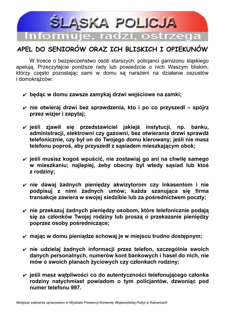 APEL DO SENIORÓW ORAZ ICH BLISKICH I OPIEKUNÓW W trosce o bezpieczeństwo osób starszych, policjanci garnizonu śląskiego apelują. Przeczytajcie poniższe rady lub powiedzcie o nich Waszym bliskim, którzy często pozostając sami w domu są narażeni na działanie oszustów i domokrążców: ✔ będąc w domu zawsze zamykaj drzwi wejściowe na zamki; ✔ nie otwieraj drzwi bez sprawdzenia, kto i po co przyszedł – spójrz przez wizjer i zapytaj; ✔ jeśli zjawił się przedstawiciel jakiejś instytucji, np. banku, administracji, elektrowni czy gazowni, bez otwierania drzwi sprawdź telefonicznie, czy był on do Twojego domu kierowany; jeśli nie masz telefonu poproś, aby przyszedł z sąsiadem mieszkającym obok; ✔ jeśli musisz kogoś wpuścić, nie zostawiaj go ani na chwilę samego w mieszkaniu; najlepiej, żeby obecny był wtedy sąsiad lub ktoś z rodziny; ✔ nie dawaj żadnych pieniędzy akwizytorom czy inkasentom i nie podpisuj z nimi żadnych umów; każda szanująca się firma transakcje zawiera w swojej siedzibie lub za pośrednictwem poczty; ✔ nie przekazuj żadnych pieniędzy osobom, które telefonicznie podają się za członków Twojej rodziny lub proszą o przekazanie pieniędzy poprzez osoby pośredniczące; ✔ mając w domu pieniądze schowaj je w miejscu trudno dostępnym; ✔ nie udzielaj żadnych informacji przez telefon, szczególnie swoich danych personalnych, numerów kont bankowych i haseł do nich, nie mów o swoich planach życiowych czy członkach rodziny; ✔ jeśli masz wątpliwości co do autentyczności telefonującego członka rodziny natychmiast powiadom o tym policjantów, dzwoniąc pod numer telefonu 997. Niniejsze zalecenia opracowano w Wydziale Prewencji Komendy Wojewódzkiej Policji w Katowicach