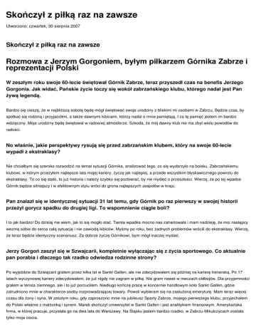 Skończył z piłką raz na zawsze Utworzono: czwartek, 30 sierpnia 2007 Skończył z piłką raz na zawsze Rozmowa z Jerzym Gorgoniem, byłym piłkarzem Górnika Zabrze i reprezentacji Polski W zeszłym roku swoje 60-lecie świętował Górnik Zabrze, teraz przyszedł czas na benefis Jerzego Gorgonia. Jak widać, Pańskie życie toczy się wokół zabrzańskiego klubu, którego nadal jest Pan żywą legendą. Bardzo się cieszę, że w najbliższą sobotę będę mógł świętować swoje urodziny z bliskimi mi osobami w Zabrzu. Będzie czas, by spotkać się rodziną i przyjaciółmi, a także dawnymi kibicami, którzy nadal o mnie pamiętają. I za tę pamięć jestem im bardzo wdzięczny. Moje urodziny będę świętował w radosnej atmosferze. Szkoda, że mój dawny klub nie ma zbyt wielu powodów do radości. No właśnie, jakie perspektywy rysują się przed zabrzańskim klubem, który na swoje 60-lecie wypadł z ekstraklasy? Nie chciałbym się szeroko rozwodzić na temat sytuacji Górnika, analizować tego, co się wydarzyło na boisku. Zabrzańskiemu klubowi, w którym przeżyłem najlepsze lata mojej kariery, życzę jak najlepiej, a przede wszystkim błyskawicznego powrotu do ekstraklasy. To co się stało, to już historia i należy szybko się pozbierać, by nie myśleć o przeszłości. Wierzę, że po tej wpadce Górnik będzie silniejszy i w efektownym stylu wróci do grona najlepszych zespołów w kraju. Pan znalazł się w identycznej sytuacji 31 lat temu, gdy Górnik po raz pierwszy w swojej historii przeżył gorycz spadku do drugiej ligi. To wspomnienie ciągle boli? I to jak bardzo! Do dzisiaj nie wiem, jak to się mogło stać. Tamta wpadka mocno nas zahartowała i mam nadzieję, że moi następcy wezmą sobie do serca całą sytuację i nie zawiodą kibiców. Myśmy po roku, bez żadnych problemów wrócili do ekstraklasy. Wierzę, że teraz będzie identyczny scenariusz. Za dobrze życzę Górnikowi, bym mógł inaczej myśleć. Jerzy Gorgoń zaszył się w Szwajcarii, kompletnie wyłączając się z życia sportowego. Co aktualnie pan porabia i dlaczego tak rzadko odwiedza rodzinne strony? Po wyjeździe do Szwajcarii grałem przez kilka lat w Sankt Gallen, ale nie zdecydowałem się później na karierę trenerską. Po 17 latach wyczynowej kariery zdecydowałem, że już nigdy nie zagram w piłkę. Nie gram nawet w meczach oldbojów. Dla przyjemności grałem w tenisa ziemnego, ale i to już porzuciłem. Niedługo kończę pracę w koncernie handlowym koło Sankt Gallen, gdzie zatrudniono mnie w charakterze osoby rozprowadzającej towary. Powoli wybieram się na zasłużoną emeryturę. Mam teraz więcej czasu dla żony i syna. W zeszłym roku, gdy zaproszono mnie na jubileusz Sparty Zabrze, mojego pierwszego klubu, przyjechałem do Polski właśnie z małżonką i synem. Marek skończył uniwersytet w Sankt Gallen i jest analitykiem finansowym. Amerykańska firma, w której pracuje, przysłała go na dwa lata do Warszawy. Na Śląsku jestem bardzo rzadko, w Zabrzu-Mikulczycach została tylko moja ciocia. Pańscy koledzy z boiska zostali jednak w swojej branży, robiąc kariery trenerskie. Nie chciał pan zostać szkoleniowcem? Trenerskie życie na walizkach absolutnie mnie nie interesowało. Po zakończeniu kariery zawodniczej trochę trenowałem młodzież w Sankt Gallen i okolicy. Mnie nigdy nie ciągnęło na trenerską ławkę, za dużo w tej pracy stresów i niepewności, by się w nią angażować. To nie jest robota dla mnie. „Sześćdziesiątka” na karku to idealny wiek, by pokusić się o bilans zysków i strat. Nie żałuje pan czasem, że nie osiągnął więcej na boisku? Niczego w życiu nie żałuję. Jestem zadowolony z tego co osiągnąłem. Grałem do 35 roku życia i zdobyłem złoty i srebrny medal olimpijski, zająłem trzecie miejsce na mistrzostwach świata. No i te mistrzostwa Polski oraz Puchary Polski z Górnikiem. To chyba niezły bilans? Rozmawiał Jerzy Mucha JERZY GORGOŃ, urodzony 18 lipca 1949 r. w Zabrzu. Wychowanek MGKS Mikulczyce (obecna Sparta Zabrze), przez 13 lat występował w Górniku Zabrze (220 gier ligowych, 18 goli), by na koniec kariery zagrać w lidze szwajcarskiej. Z Górnikiem zdobył dwa tytuły mistrza i pięć Pucharów Polski. Miał swój udział w wielkich sukcesach reprezentacji Polski kierowanej przez Kazimierza Górskiego. W ogromnym stopniu zapracował na „złoto” olimpijskie w Monachium i srebrny medal w Montrealu. Był także czołową postacią biało-czerwonych na pamiętnych mistrzostwach świata w RFN, gdzie zajęliśmy trzecie miejsce.