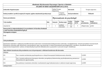 Akademia Wychowania Fizycznego i Sportu w Gdańsku SYLABUS W ROKU AKADEMICKIM 2015/2016 Zakład Terapii Zajęciowej Jednostka Organizacyjna: I stopnia, praktyczny Rodzaj studiów i profil (I stopień/II stopień, ogólno akademicki/praktyczny): Kierunek: Terapia zajęciowa Kod przedmiotu: TZISns01 Wprowadzenie do psychologii Nazwa przedmiotu: Tryb studiów Rok stacjonarne I Semestr I Rodzaj zajęć wykłady ćwiczenia Liczba godzin Punkty ECTS 15 30 3 Typ przedmiotu Język wykładowy obligatoryjny polski Nauczyciel(-e) odpowiedzialny(-i) za przedmiot: dr Karolina Siodmiak e-mail: [email protected] Wymagania wstępne: Brak Cele przedmiotu: Zapoznanie studentów z ogólnymi prawidłowościami zachowania i mechanizmami funkcjonowania człowieka z uwzględnieniem różnych perspektyw teoretycznych. Rozumienie człowieka, jego właściwości, emocjonalności, tego co go motywuje w różnych koncepcjach psychologicznych umożliwia przyszłemu terapeucie zajęciowemu kompetentne i zależne od indywidualnych potrzeb oddziaływanie na pacjentów w procesie terapii i rehabilitacji. Opis efektów kształcenia dla przedmiotu oraz ich powiązanie z efektami kształcenia dla kierunku: WIEDZA W1 Zna i rozumie mechanizmy psychospołeczne w różnych koncepcjach funkcjonowania człowieka K_W03 W2 Zna i rozumie podstawowe koncepcje człowieka: perspektywę behawioralną, psychodynamiczną, poznawcza i humanistyczno egzystencjalną K_W03 W3 Zna podstawy rozumienia człowieka i mechanizmów jego funkcjonowania w zakresie terapii zajęciowej. K_W09 UMIEJĘTNOŚCI U1 Umie zaprezentować swoje przemyślenia związane z różnymi koncepcjami człowieka. K_U19 U2 Potrafi interpretować ludzkie zachowań w perspektywie różnych ujęć teoretycznych. K_U01 U3 Potrafi samodzielnie identyfikować zachowania pacjentów i nadawać temu interpretację. K_U04 K1 Rozumie psychologiczny aspekt problemów pacjenta K_K05 K2 Potrafi przekonywująco przedstawiać swoje zdanie i pracować w zespole biorąc odpowiedzialność za wspólna pracę. K_K09 KOMPETENCJE Kryteria i metody oceny osiągniętych efektów kształcenia: 1. Odpowiedź na pytania w czasie kolokwium/egzaminu (pytania otwarte), 2. Prezentacja obejmująca treści ćwiczeń: wskazanie pytania problemowego, oryginalność, poprawność merytoryczna prezentacji, aktywizacja grupy. 3. Obecność na zajęciach (ćwiczeniach). Aby uzyskać zaliczenie przedmiotu na ocenę dostateczną student musi osiągnąć wszystkie wymienione przedmiotowe efekty kształcenia. Metody i formy realizacji przedmiotu: Wykłady, ćwiczenia (praca w grupach, analiza przypadków, dyskusja, elementy treningu umiejętności komunikacyjnych) Treści kształcenia: Wykłady: 1. Psychologia jako nauka. 1. Znaczenie eksperymentów w psychologii – wpływ osobowości czy środowiska w eksperymencie Miligrama. 1. Behawiorystyczna koncepcja człowieka zewnątrzsterowalnego. 2. Warunkowanie klasyczne i instrumentalne – formy uczenia się. 3. Kary i nagrody – skuteczność i zagrożenia. 4. Psychoanalityczna teoria rozwoju. 5. Podstawy ujęcia psychodynamicznego człowieka niedoskonałego. 6. Mechanizmy obronne w funkcjonowaniu człowieka. 7. Podstawy ujęcia poznawczego człowieka samodzielnego. 8. Podstawy ujęcia humanistycznego człowieka dążącego do samorealizacji. 9. Praktyka psychoterapeutyczna: poznawczo – behawioralna, psychodynamiczna i humanistyczna. 10. Całościowe ujęcie człowieka: ciało i charakter. Ćwiczenia: 1. Wprowadzenie do przedmiotu 2. Człowiek zewnątrz sterowalny (behawioryzm). 3. Zasady stosowania kar i nagród w praktyce. 4. Człowiek transgresyjny wg Kozieleckiego –perspektywa poznawcza. 5. Sylwetka, teoria, zastosowanie teorii Freuda i Junga –perspektywa psychoanalityczna. 6. Sylwetka, teoria, zastosowanie teorii Rogersa i Perlsa- perspektywa humanistyczna 7. Człowiek w ujęciu egzystencjalnym wg. Frankla, Yaloma 8. Współczesna perspektywa człowieka – teoria dialogowego Ja wg Hermansa. 9. Porównanie różnych koncepcji psychologicznych człowieka 10. Zasady zdrowia psychicznego. 11. Oddziaływanie psychoterapeutyczne a praktyka życiowa. Egzamin pisemny; Forma zaliczenia: pozytywne zaliczenie kolokwium, przedstawienie prezentacji, obecność na zajęciach Literatura: Podstawowa: Hall, C., S., Lindzey, G. (1994). Teorie osobowości. Warszawa: PWN. Kozielecki, J (2000). Koncepcje psychologiczne człowieka. Warszawa: Wydawnictwo Akademickie Żak. Kozielecki, J. (red.),(2009). Nowe idee w psychologii. Psychologia XXI wieku. Gdańsk: GWP. Rathus, S. A. (2004). Psychologia współczesna. Gdańsk: GWP Strelau, J., Doliński, D. (red.), (2008). Psychologia. Podręcznik akademicki, tom 1, 2. Gdańsk: GWP Uzupełniająca: Oatley K., Jenkins J.M. (2005): Zrozumieć emocje. Warszawa: PWN Oleś P., Puchalska – Wasyl M., Sobol – Kwapińska M. (2012): O osobowości praktycznie wszystko. Ćwiczenia z psychologii osobowości. Warszawa: Scholar Perwin L.J., Oliver P.J. (2002): Osobowość. Teorie i badania. Kraków: UJ. Strelau, J. (2004). Psychologia. Podręcznik akademicki, tom 2. Gdańsk: PWN Zimbardo, P. G., Ruch, F. L (2006). Psychologia i życie. Warszawa: PWN Bilans punktów ECTS (1 pkt ECTS – 25-30 godz. pracy studenta): Aktywność Obciążenie studenta Udział w wykładach godz. 15 Samodzielne studiowanie tematyki wykładów godz.10 Udział w ćwiczeniach godz. 30 Przygotowanie się do ćwiczeń godz.15 Konsultacje godz.10 Prezentacja godz.10 Całkowite obciążenie pracą studenta godz.90 Punkty ECTS za przedmiot ECTS 3